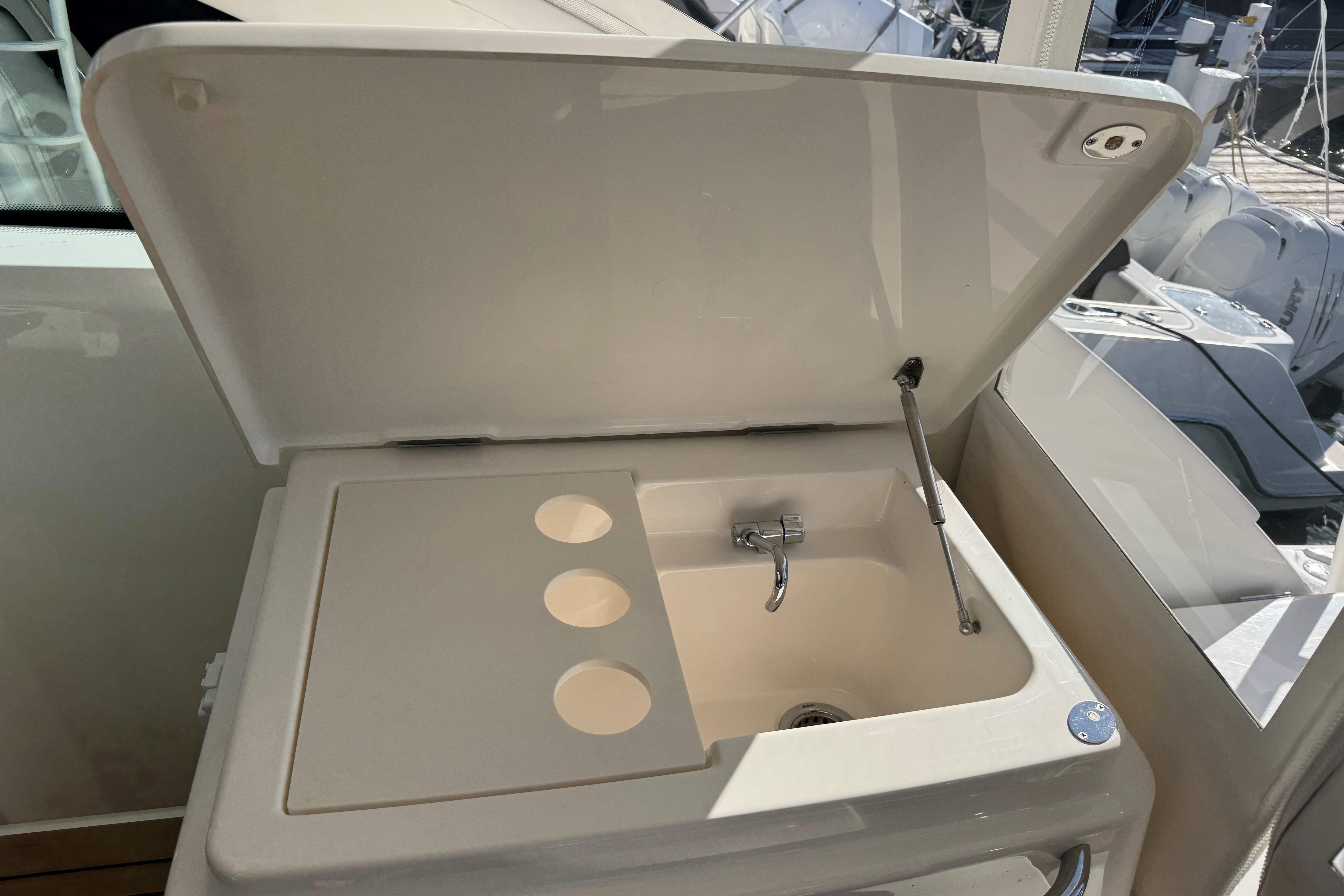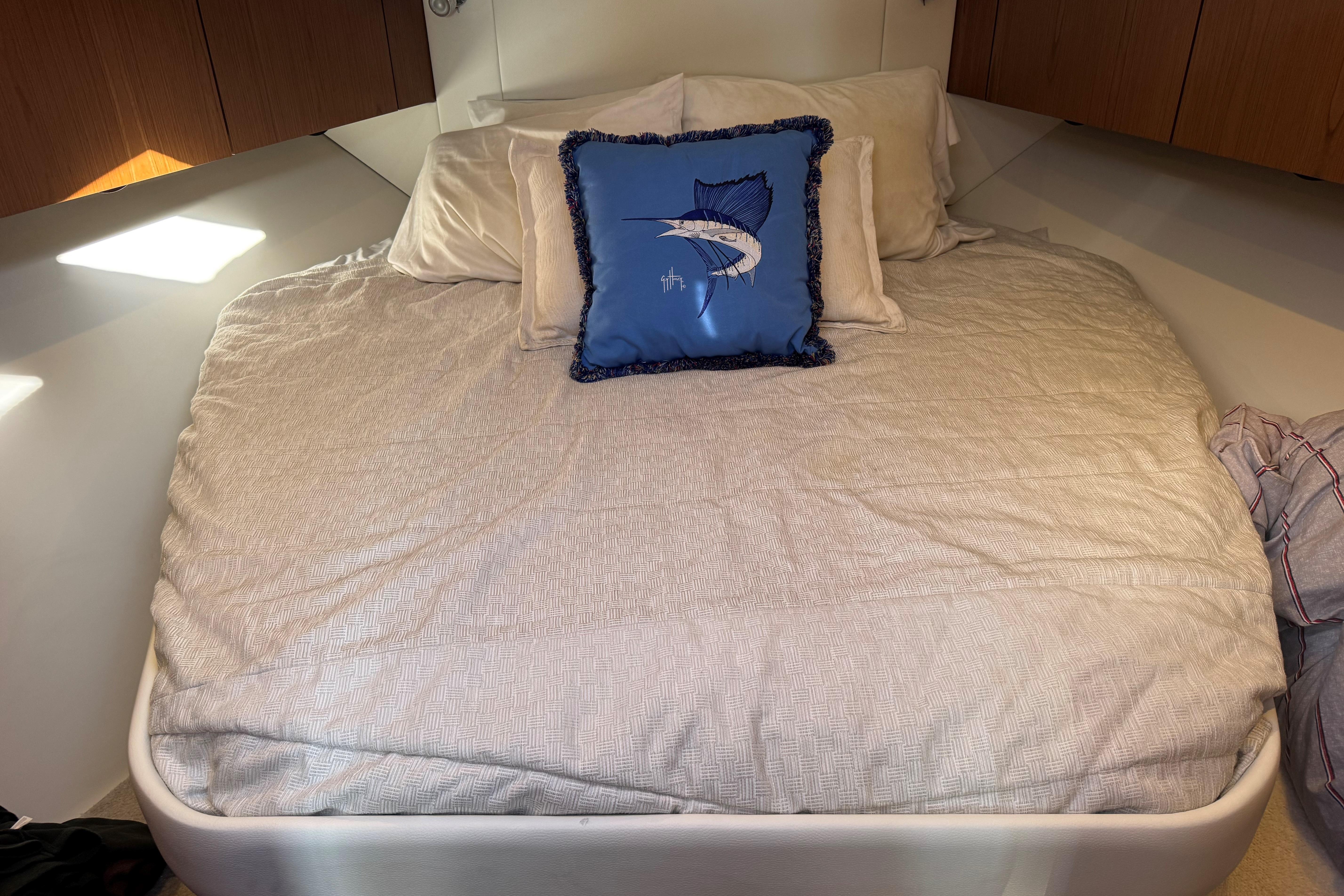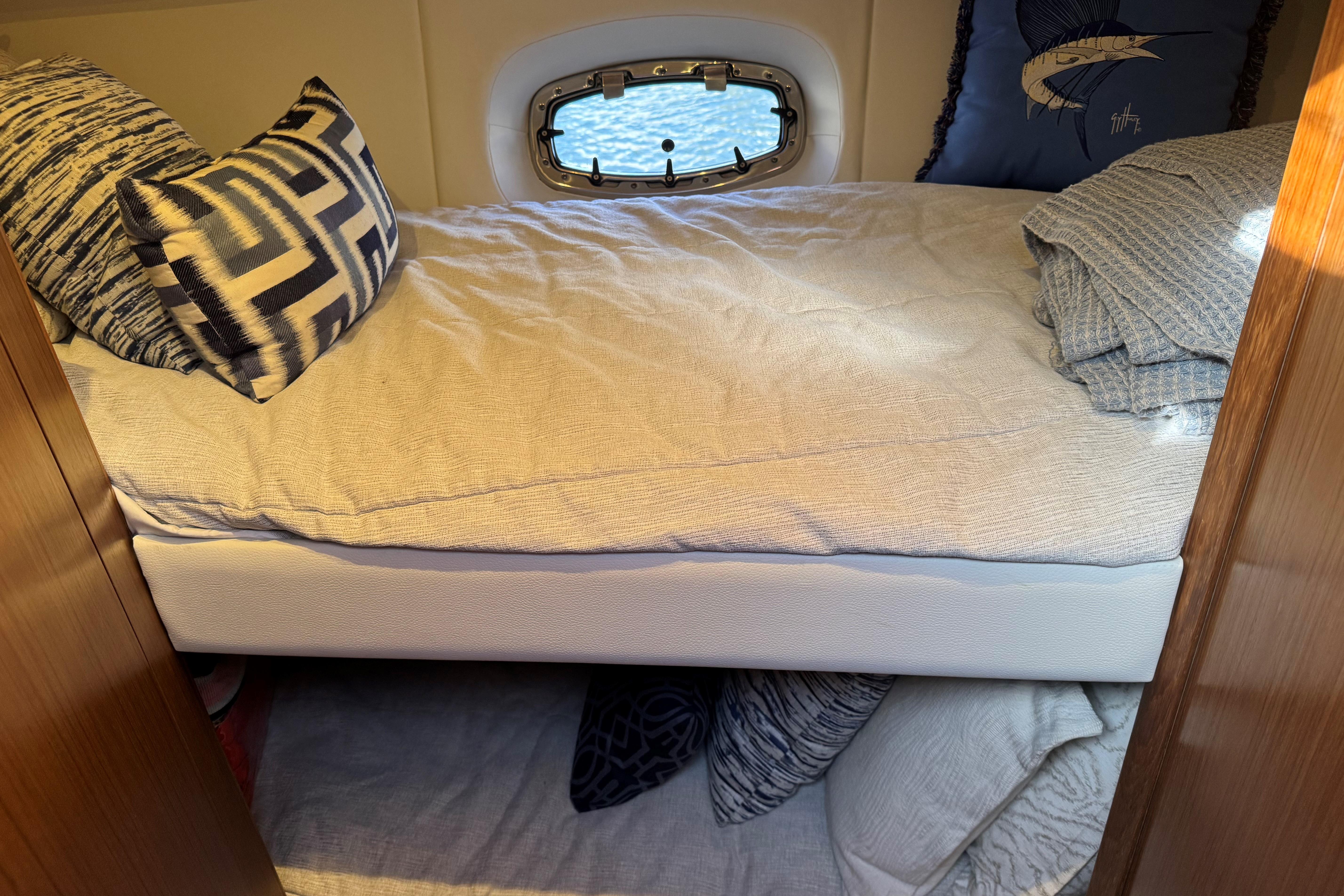FEATURES: Lauderdale Blue painted hull, White w/ SS rubrail, Seakeeper SK6 gyro, Cummins Onan 11.5 kw diesel generator, (4) underwater lights(RGBW), Lenco electric 12V hydraulic recessed trim tabs, 24V bow thruster & trolling valves, 50 amp 65’ Glendinning power cord w/ adaptor for 30 amp service, 80 amp battery charger, 30” swim platform w/ built in ladder, molded in transom door & gate, LOWER COCKPIT-hot & cold cockpit shower, port aft additional raw water washdown, freshwater washdown, raw water washdown, 50 gallon transom baitwell, Teak battle saddle, port insulated flush floor storage box w/ Dometic ice making system & macerator, stbd insulated flush floor storage boxes w/ freezer plate & macerator, Dometic water maker, cockpit coaming bolsters, (6) gunnel mounted rod holders, cockpit LED courtesy lighting, port & stbd molded-in steps to deck walkways, HARDTOP- Tournament style w/ LED spreader lights & underside lighting, upgraded Gem Lux Blue water base w/ Gem Lux Carbon 18’ outriggers, Tiara Composite windshield frame w/ tempered safety glass & wiper system w/ two washers / wipers, UPPER COCKPIT- drop down engine room access hatch, port aft-facing mezzanine seat w/ cooler under seat & storage under step, stbd aft prep center w/ custom cutting board, grill & (2) drawer tackle locker, wet bar w/ sink w/ refrigerator door, rotating Stidd helm seat electrically actuated fore, aft & vertically, Mahogany steering wheel, 32,000 BTU air conditioning / heat, Ritchie Compass, port curved companion lounge w/ storage below & fwd facing swivel seat, Teak upper cockpit table, centerline entry to salon w/ acrylic locking door, SALON- (4) portlights, Teak companionway entry steps w/ hinged storage below, 12,000 BTU air conditioning / heat, solid Teak floor, U-shaped lounge / dinette seating to port w/ storage below & high-gloss teak table; converts to double lower berth w/ backrest converting to pullman, Dinette rod storage, 32” LED TV w/ HDMI port, soundbar w/ wireless subwoofer, BluRay player, central vacuum system, GALLEY-solid surface countertop, SS sink w/ solid surface cover & hot/cold faucet, under counter storage & aft galley pantry, two-burner electric cooktop w/ Corian cover, microwave/convection oven, Vitrigo dual refrigerator drawers & refrigerator/freezer drawer combination w/ ice maker, MASTER STATEROOM- bi-fold entry door, private entry to head, 10,000 BTU air conditioning / heat, manually actuated queen pedestal berth w/ rod storage below, cedar backed hanging locker, 24” LEDF TV, GUEST STATEROOM- entry from salon, upper & lower bunks, hanging locker w/ shelves, storage under lower berth, HEAD-full fiberglass head w/ glass shower door, stall shower w/ sump pump, drain & integrated seat, solid surface vanity countertop w/ sink & storage below, mirrored lighted medicine cabinet, Vacuflush toilet w/ macerator, FOREDECK- forward deck sun pad, fresh water at anchor locker, automatic all chain anchor windlass system w/ operation from foredeck foot pedal & remote switch at helm, molded-in fiberglass bow pulpit w/ SS roller, Delta 35 lb SS anchor