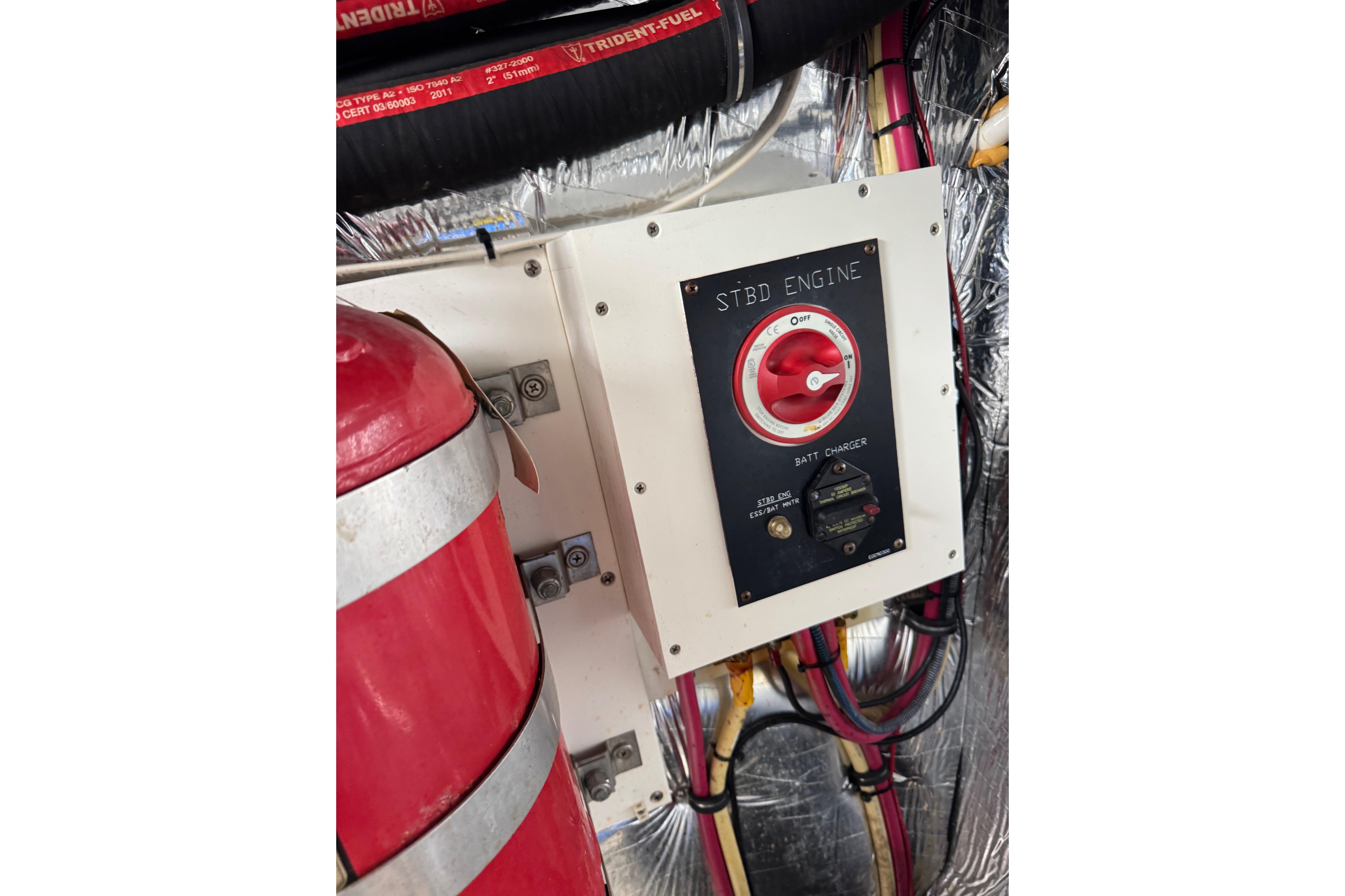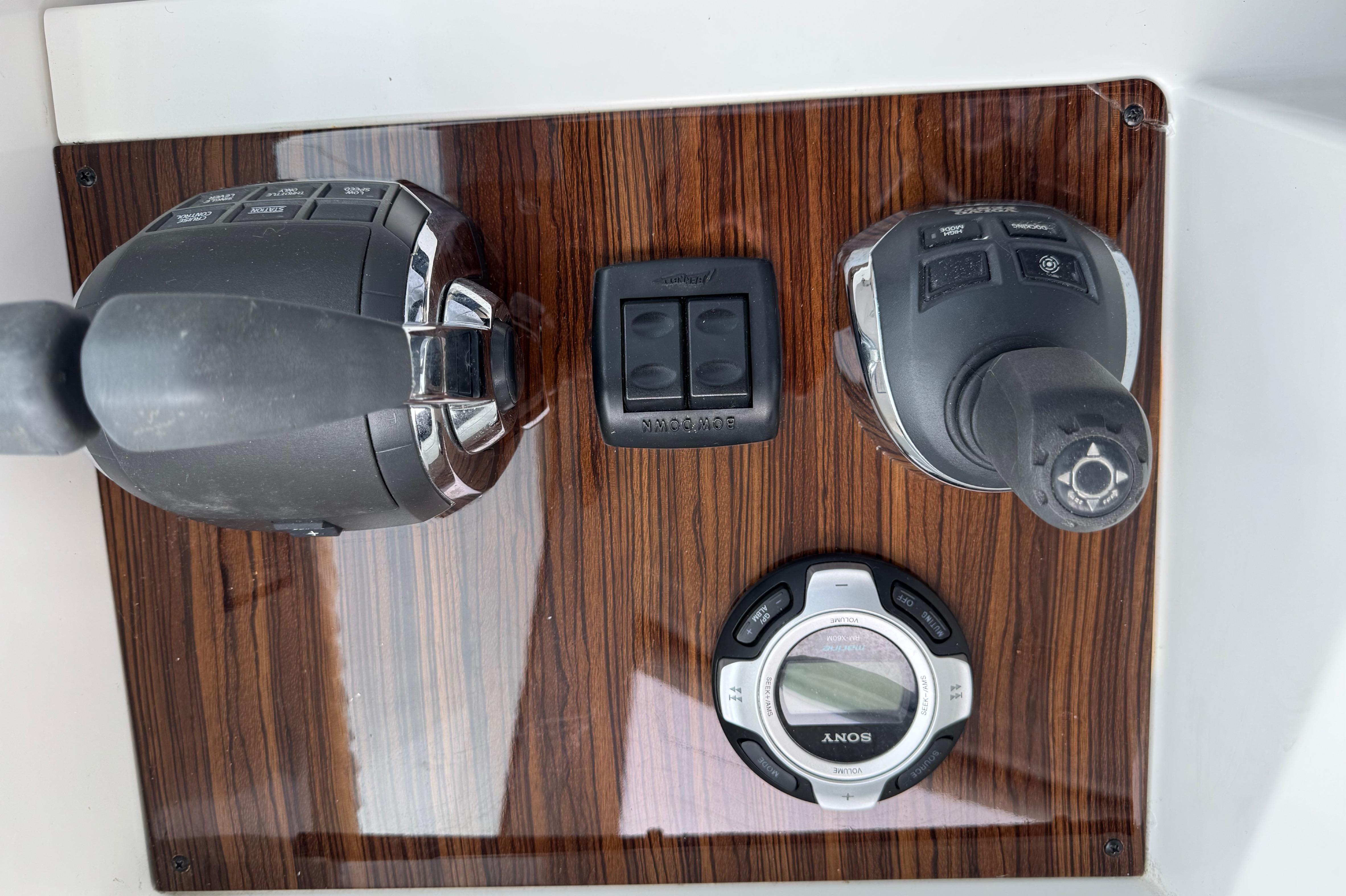 - Custom-built pedestal-style display area at the helm with dual Garmin multifunction displays.