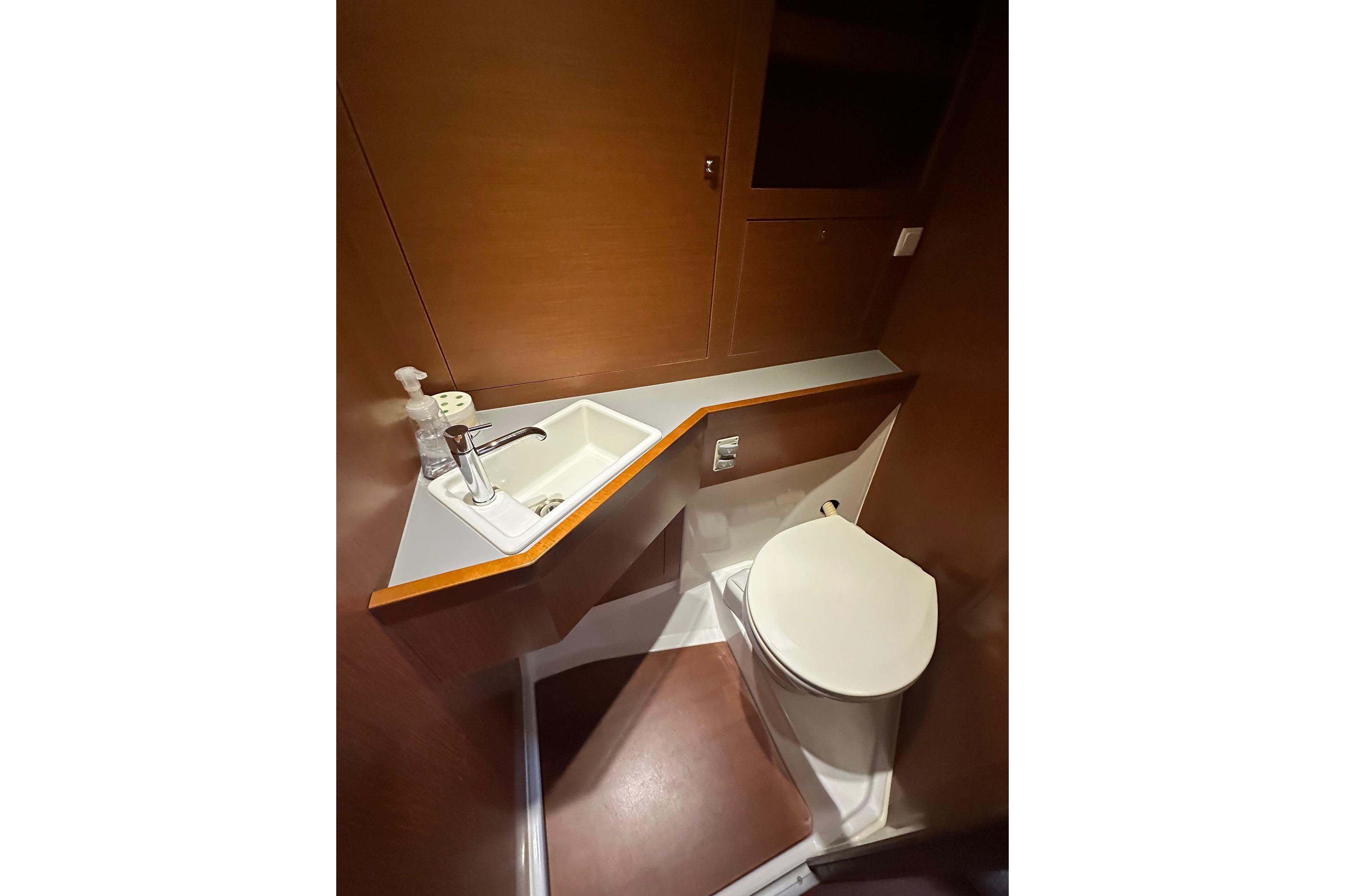 There's an enormous forward master cabin with an island berth and an ensuite head, with a separate shower across the boat from the enclosed head. The twin aft berths have hull and bulkhead ports to allow for light, plus two opening ports that provide ventilation. A generous galley with lots of storage makes meal prep easy.