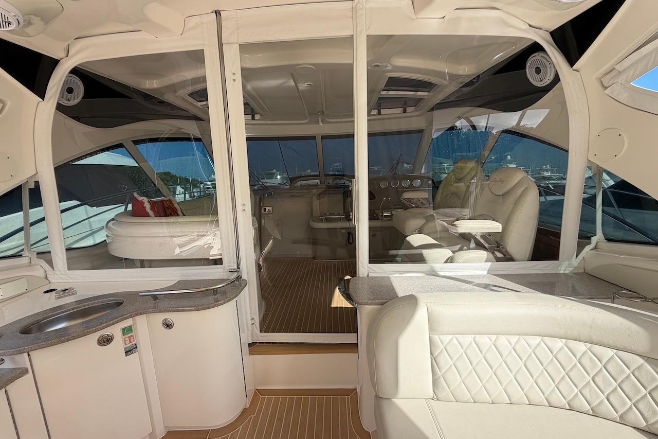 In addition to a spacious cockpit with an L-shaped settee, this luxurious sport cruiser has twin helm seats that can rotate 90 degrees as well as a side bench seat.