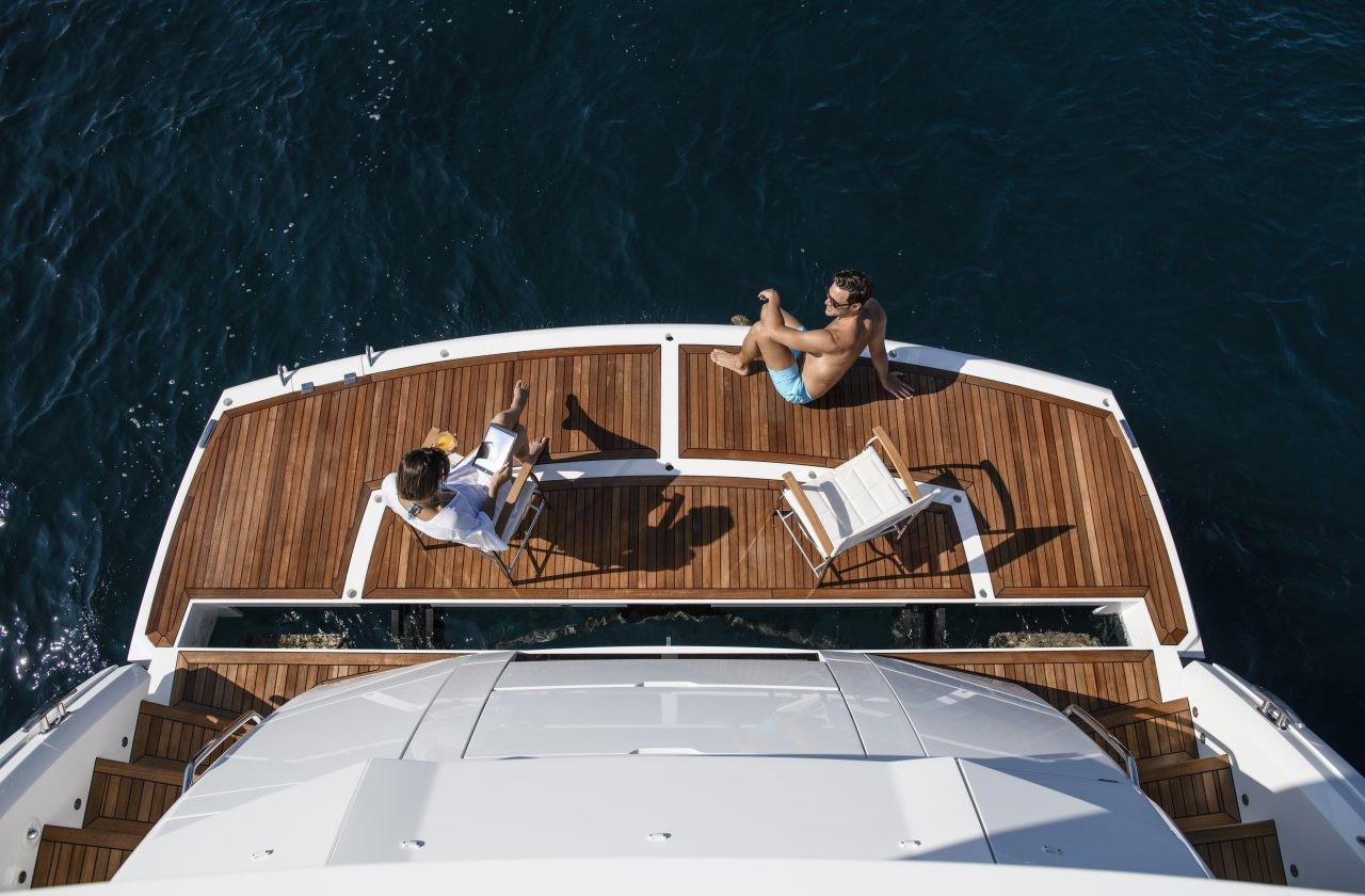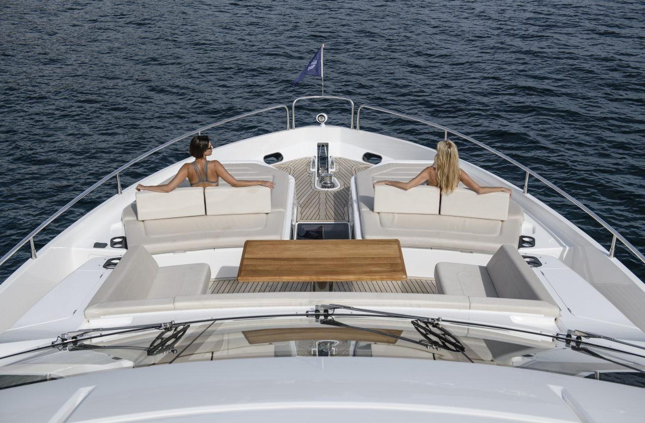The 76 Yacht’s impressive layout continues out on the foredeck, where again space is maximised and large twin sunbeds, fore/aft seating and optional refrigeration ensure this a highly sociable area too.
