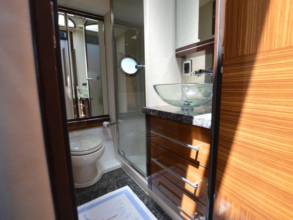 Le Marquis 500 Sport Bridge dispose de trois cabines dont une cabine principale, une cabine VIP et une cabine double. La suite principale est située au centre du yacht et est équipée d’un grand lit king-size, de rangements spacieux et d’une salle de bains privative. La salle de bains est équipée d’une douche spacieuse, de toilettes modernes et de lavabos en marbre.