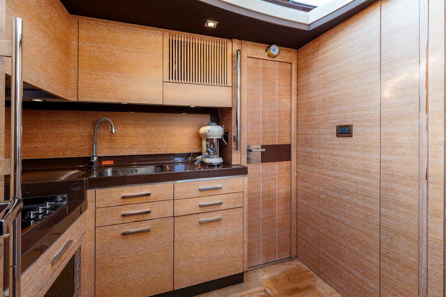 Located forward of the salon, the galley is bathed in natural light and equipped with a standard fridge/freezer, dishwasher, and all the amenities of a modern apartment.