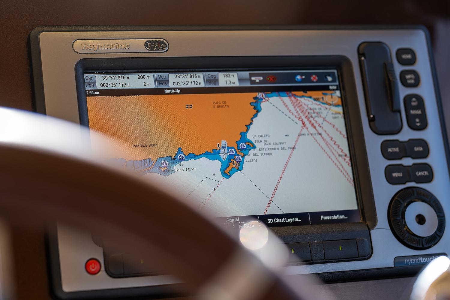 The salon is both spacious and elegant, featuring a large U-shaped beige leather sofa to starboard with a foldable central table, and a double beige leather sofa to port. A TV and Bose surround sound system create the perfect ambiance for entertainment. Forward, a raised tea table with leather seating on either side leads to the elevated bridge, equipped with double plotters and excellent visibility. Large hull windows flood the space with natural light and offer stunning views.