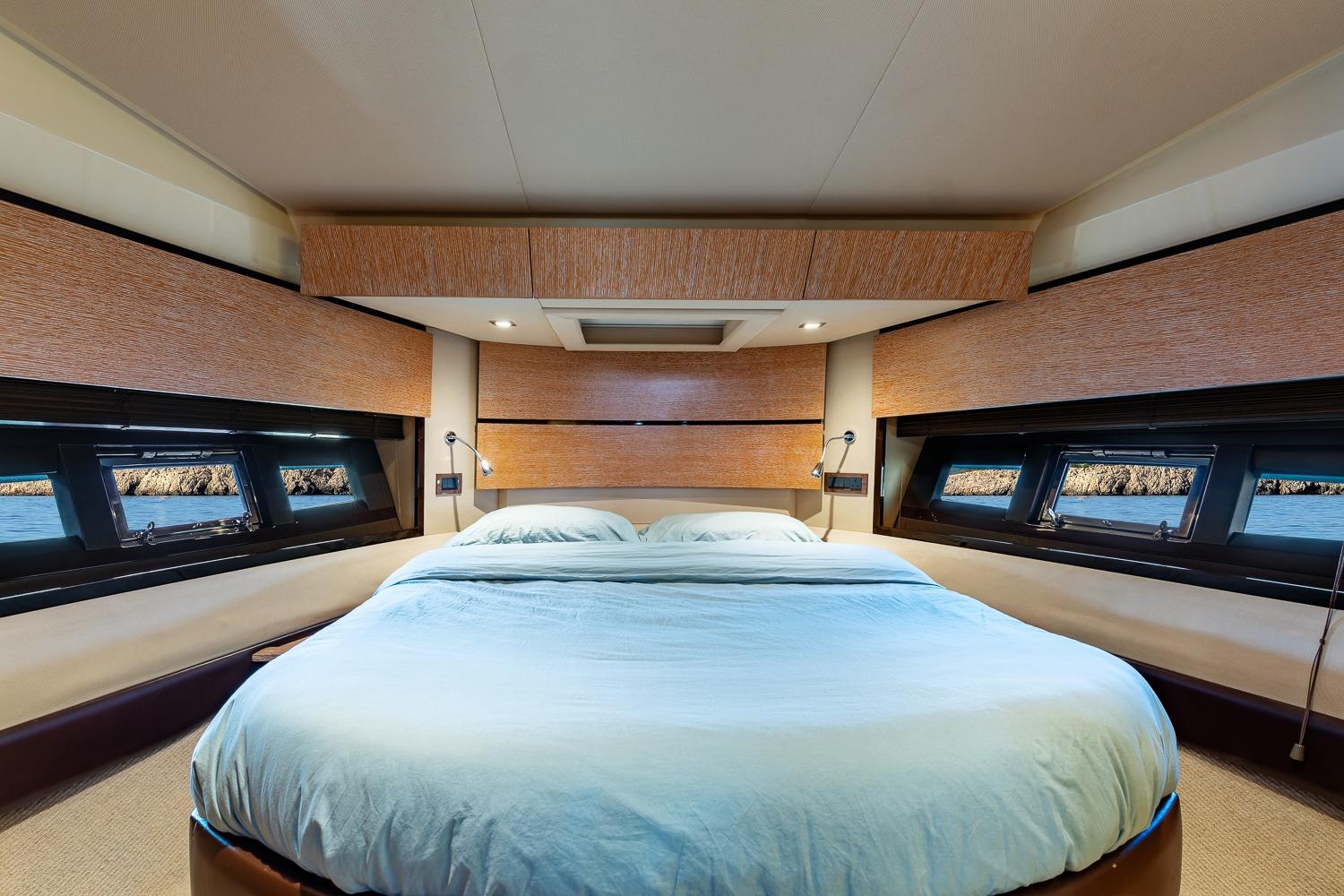 - Master Cabin (Bow): En suite with a centerline double bed, ample closets, and natural light from large hull windows and a deck skylight. Natural wood and beige upholstery create a warm, inviting atmosphere.