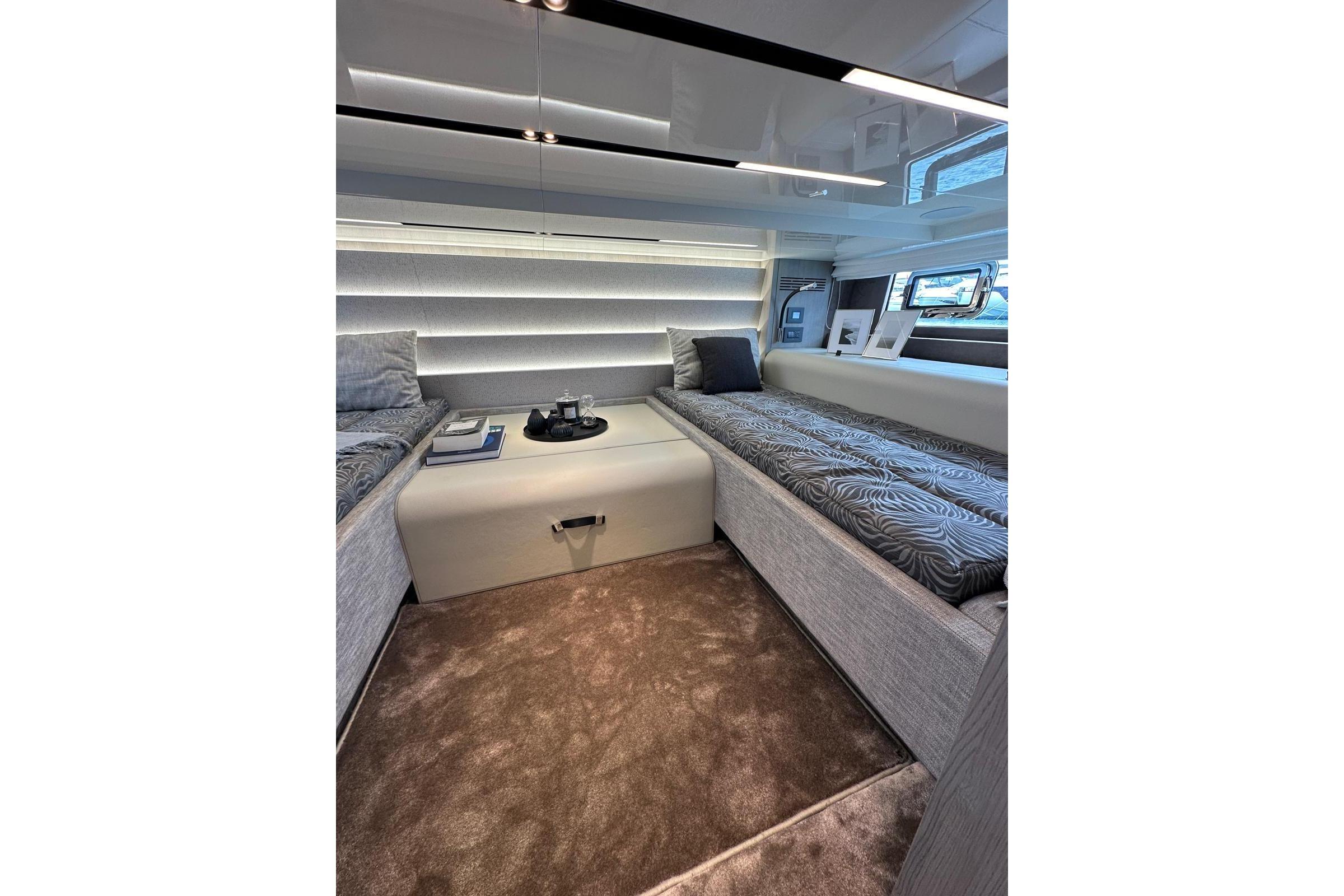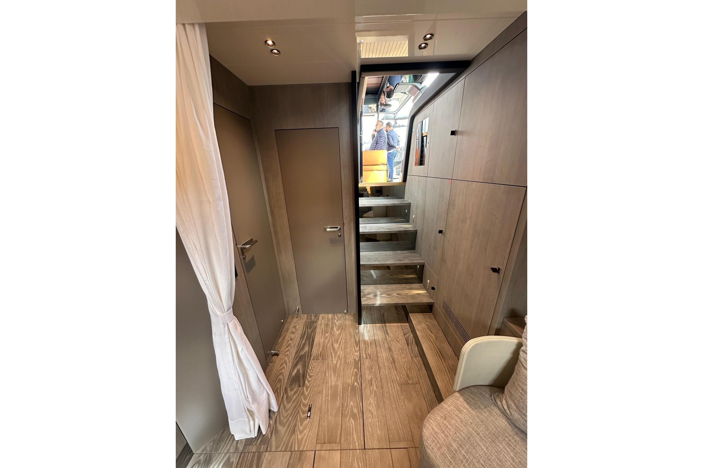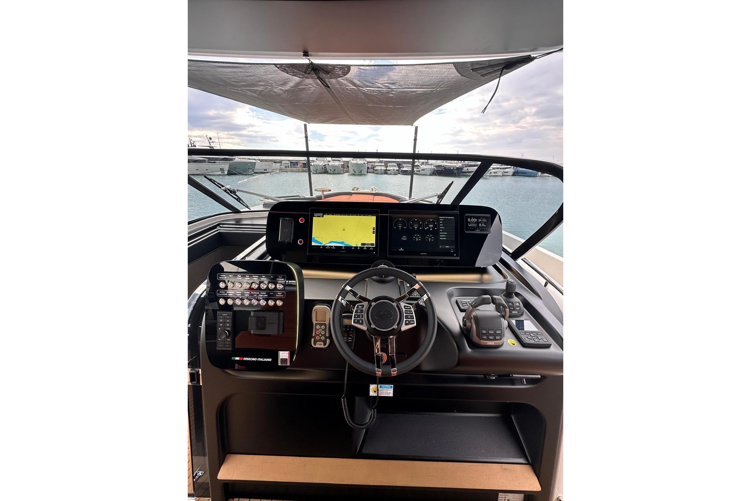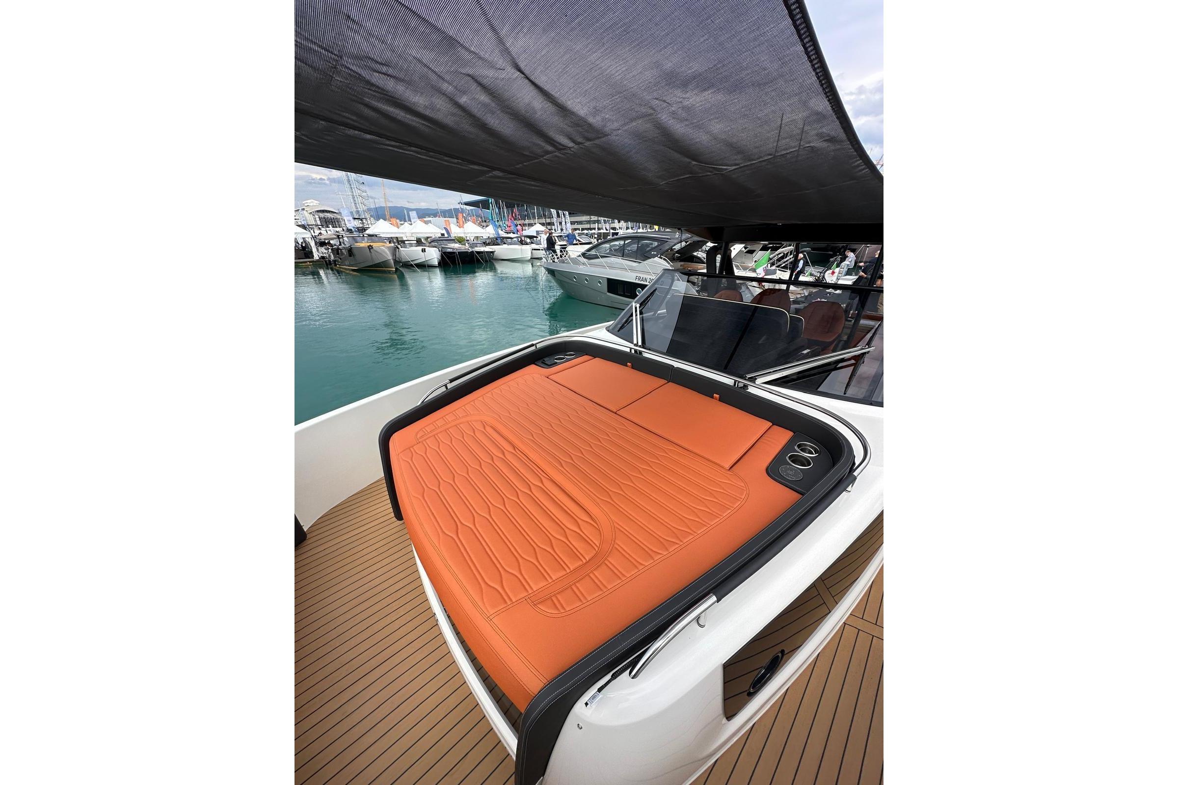 Moving around the deck you will find just two steps, but infinite chances to be amazed. The stern platform which can be moved up and down and transversely, the bulwarks which open via a servo-electric mechanism, the extraordinary t-top which protects the area in the centre of the boat, dominated by a splendid galley. Moving on to the pilot station equipped with cutting-edge screens, and the sundeck with additional seating at the base of the deckhouse in Portuguese deck style. Each element of the deck is an invitation to enjoy cruising and outdoor living, all enhanced by functional solutions with an elegant, sporty style.