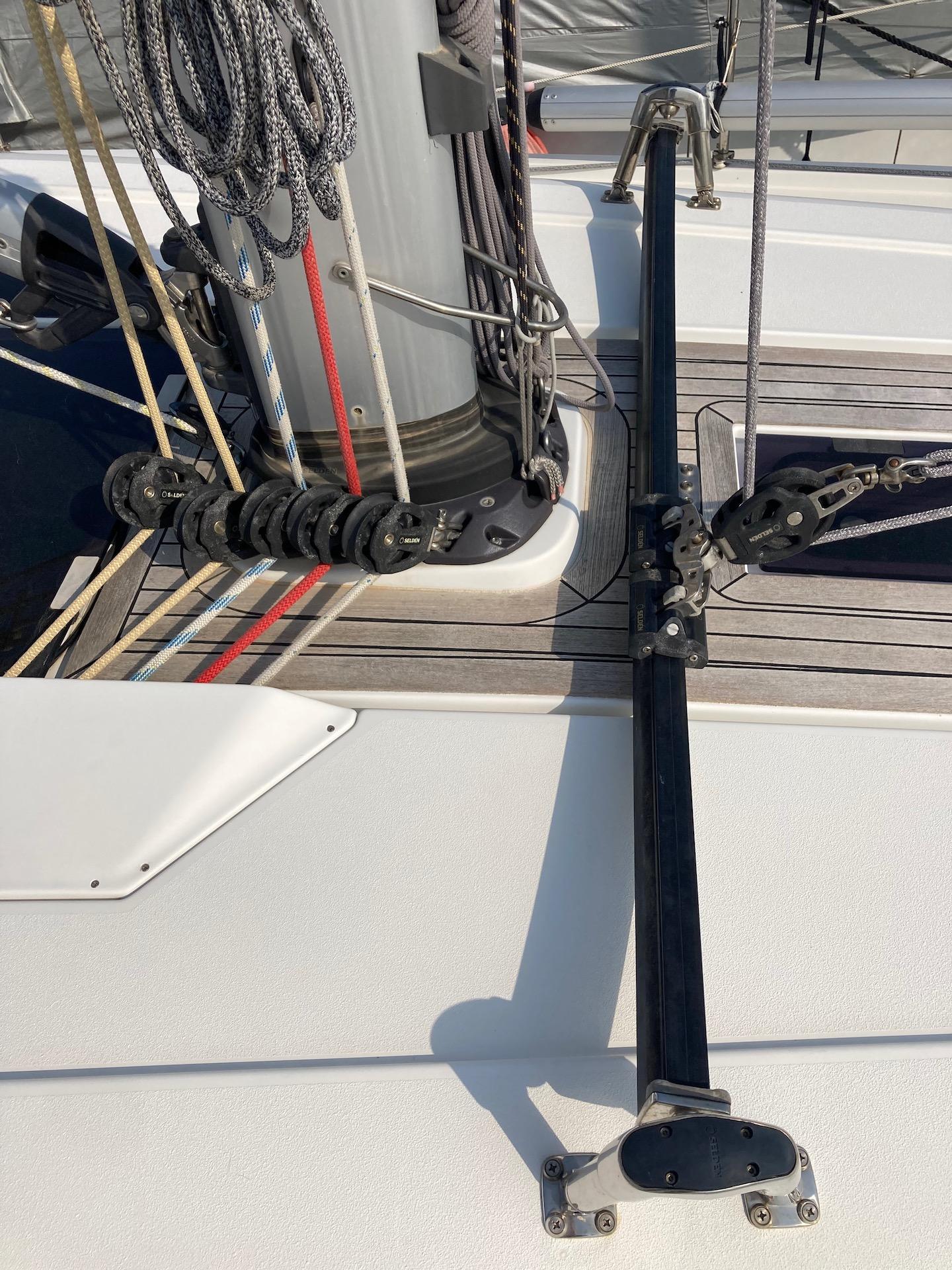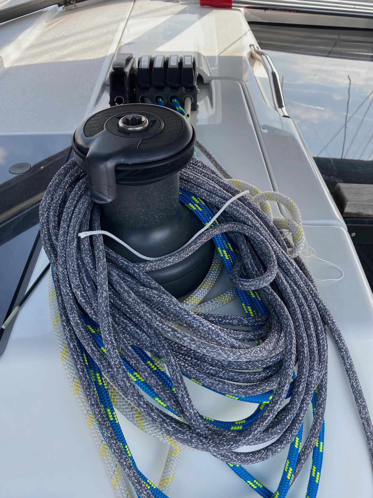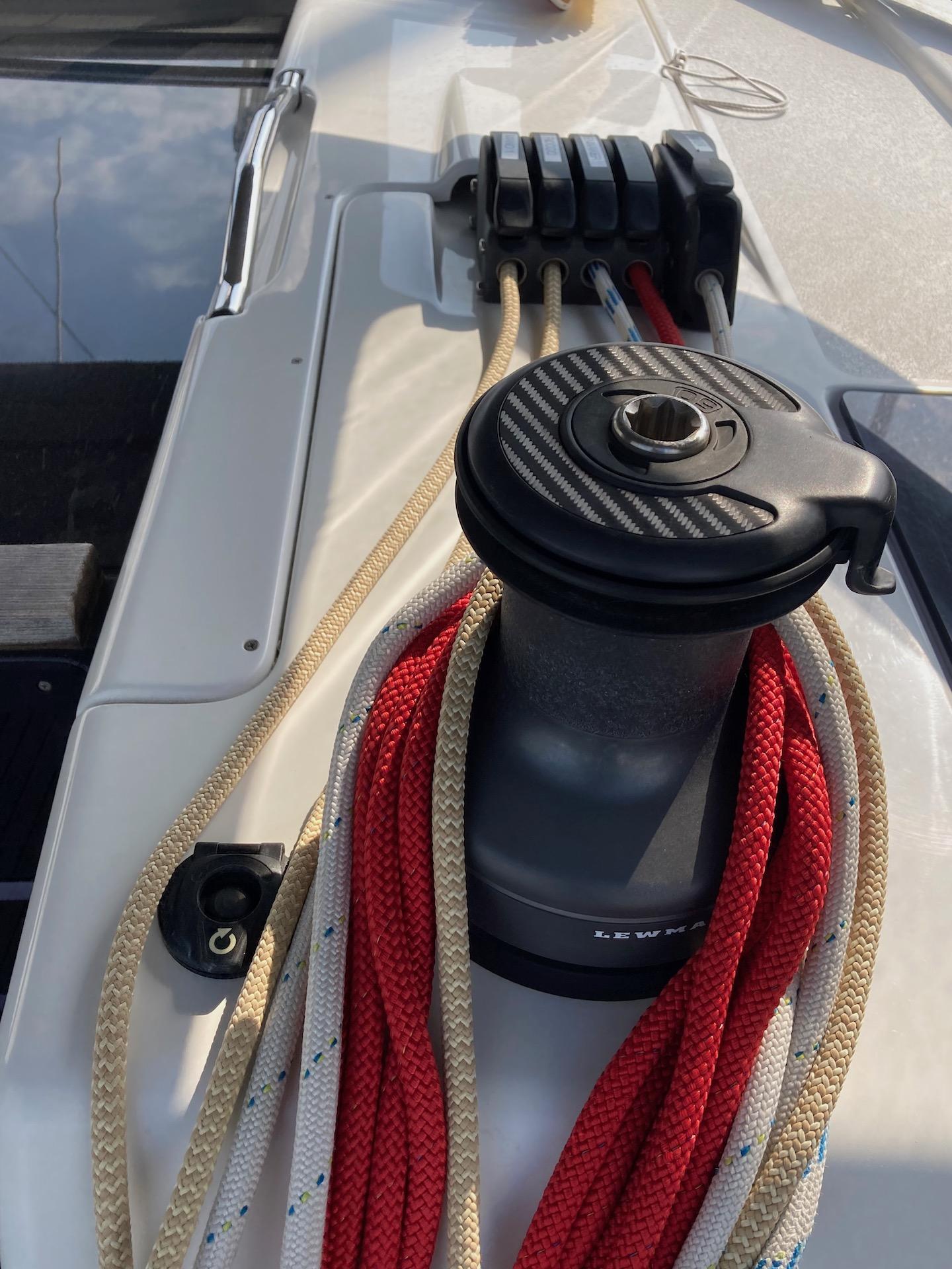 Winch per drizze Lewmar: elettrico 50 Race a dritta, manuale a sinistra; Winch per randa alla tedesca 50 Race; Winch per fiocco 55 Race. Avvolgi trinchetta 2023; Set carrelli MD 65 Selden stecca e intermedi per randa FB (2018).