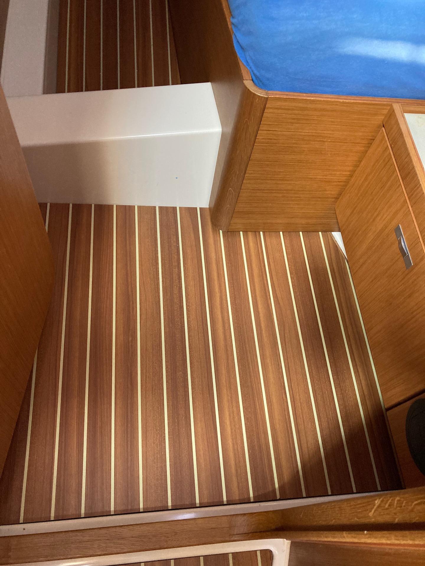 Interni in teak, pagliolato stile teak con comenti, Tappezzeria interna Baltic Cream.