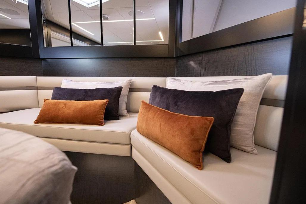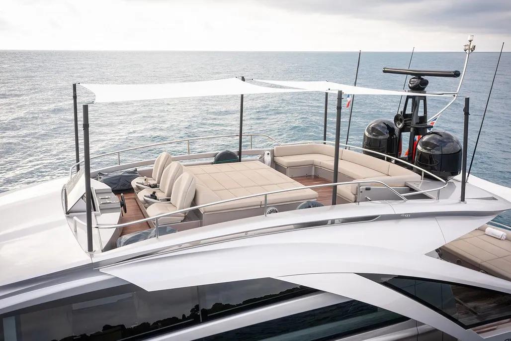 Sun deck lounge, large sun pads, cockpit table with electrical movement, sunshade awning, waterproof covers, and versatile spaces for entertaining, sunbathing, or dining al fresco. Easy dock system for surface drives and hydraulic 40 hp stern thruster.