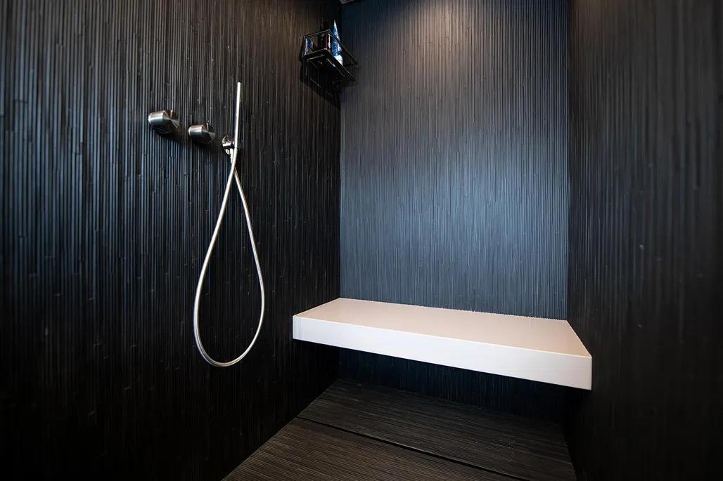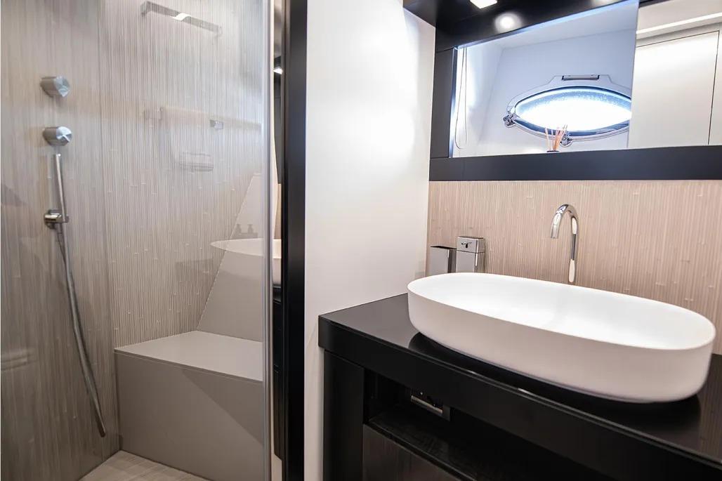 Four cabins with six bathrooms, plus two crew cabins with two bathrooms. Premium finishes include upgraded carpets, mosaics in guest bathrooms, Pullman bed in guest cabin, chest of drawers in master cabin, decorative cushions interior and exterior, upgraded bedspreads, and upgraded domotic systems in VIP and guest cabins.