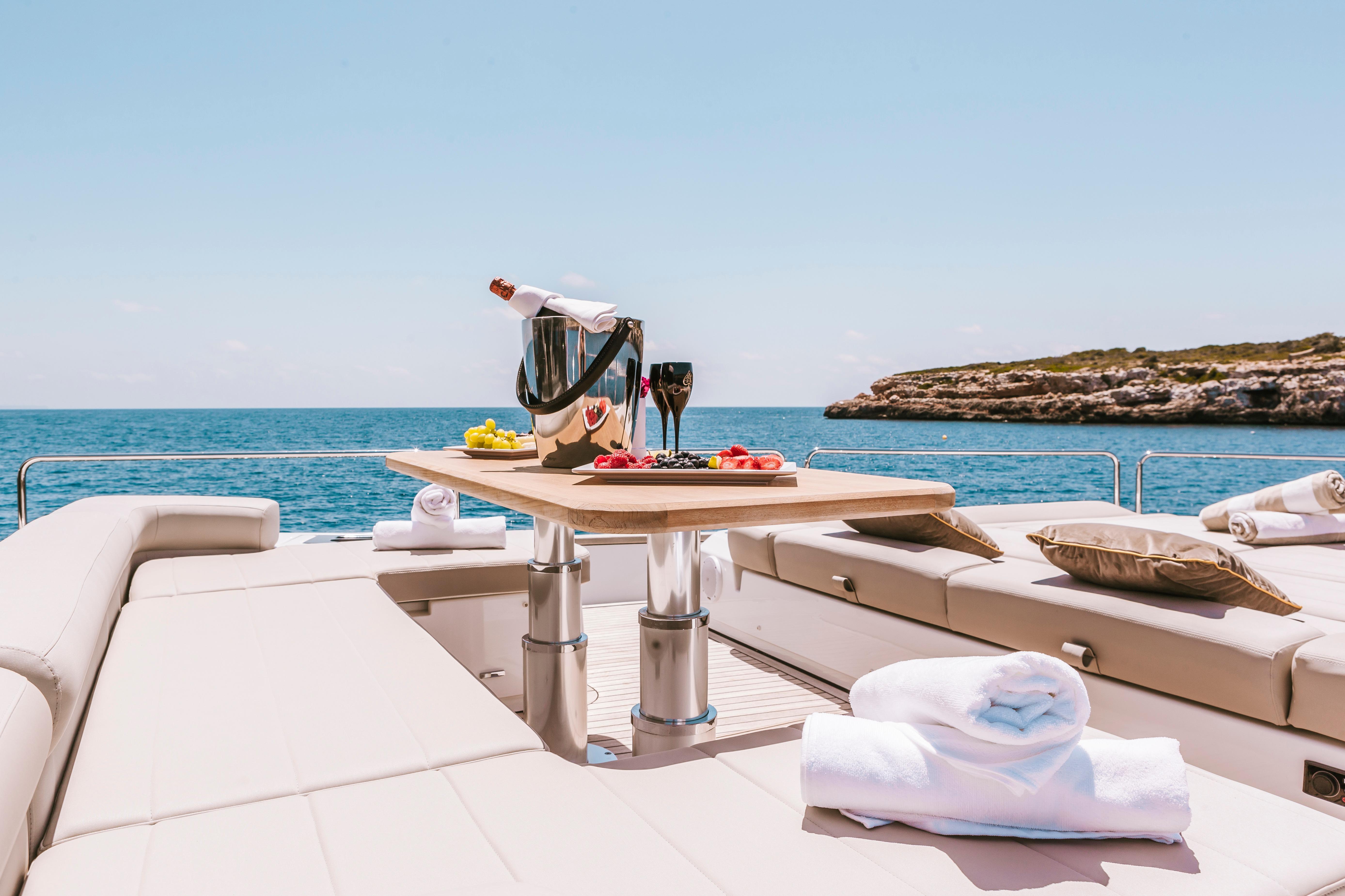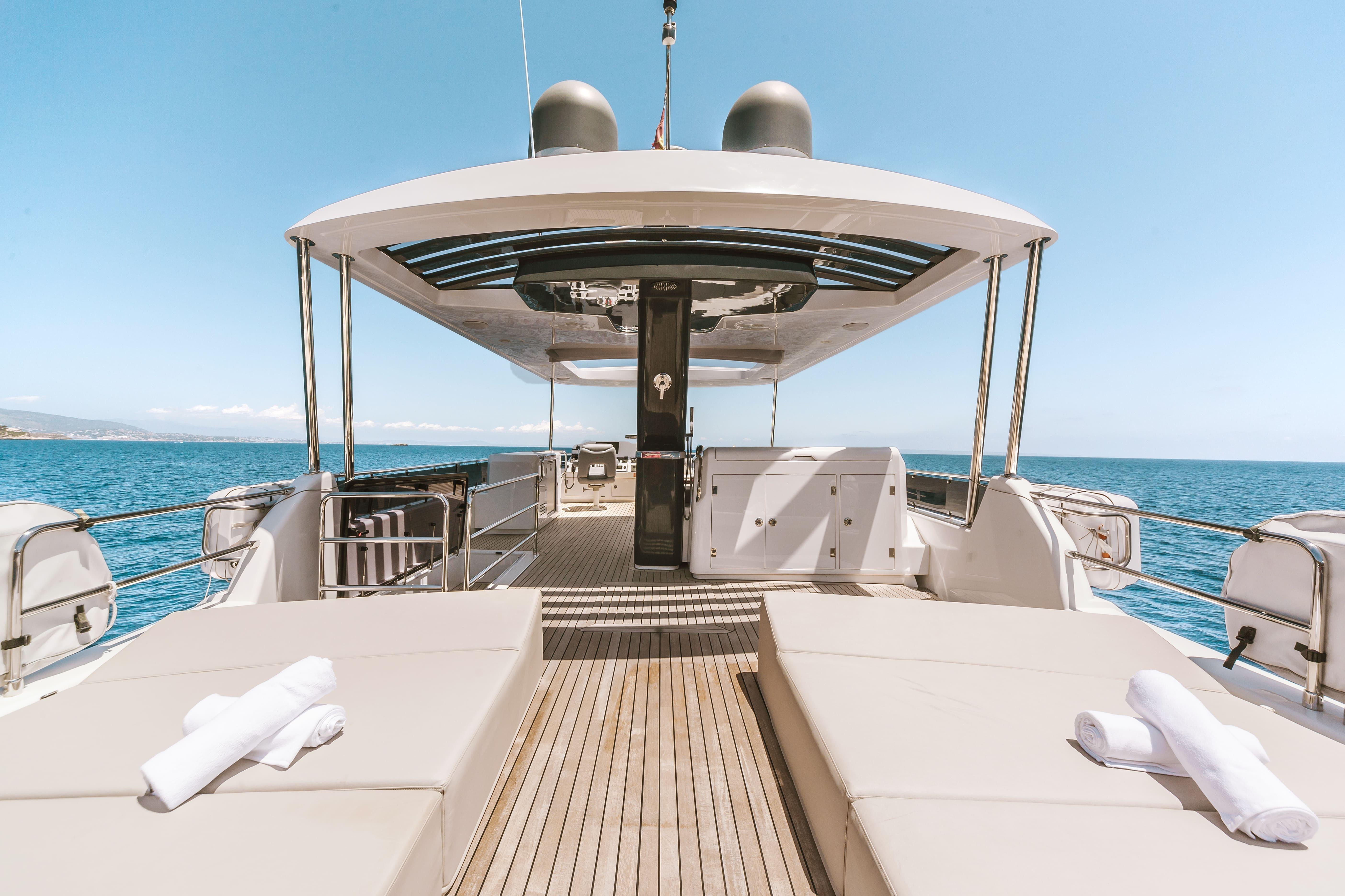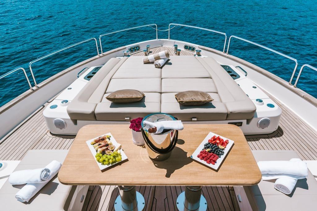 SALACIA features generous deck spaces designed for relaxation and entertaining. The flybridge offers ample seating, sunbathing areas, and a wet bar, creating a perfect social hub with panoramic views. Forward, the large bow lounge provides a quiet, private area for sunbathing or relaxing at anchor. A wide swim platform ensures easy water access, ideal for swimming and launching water toys.