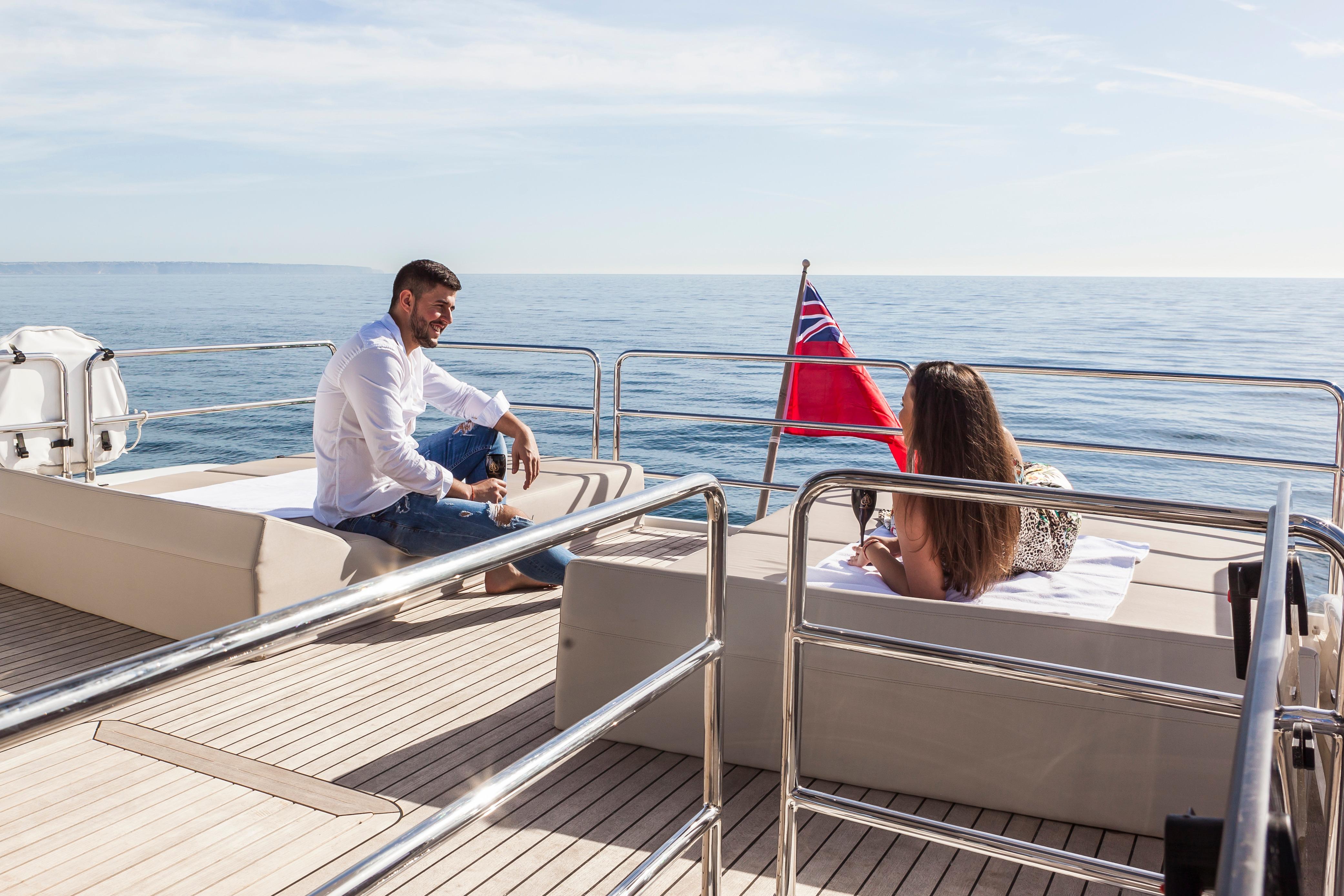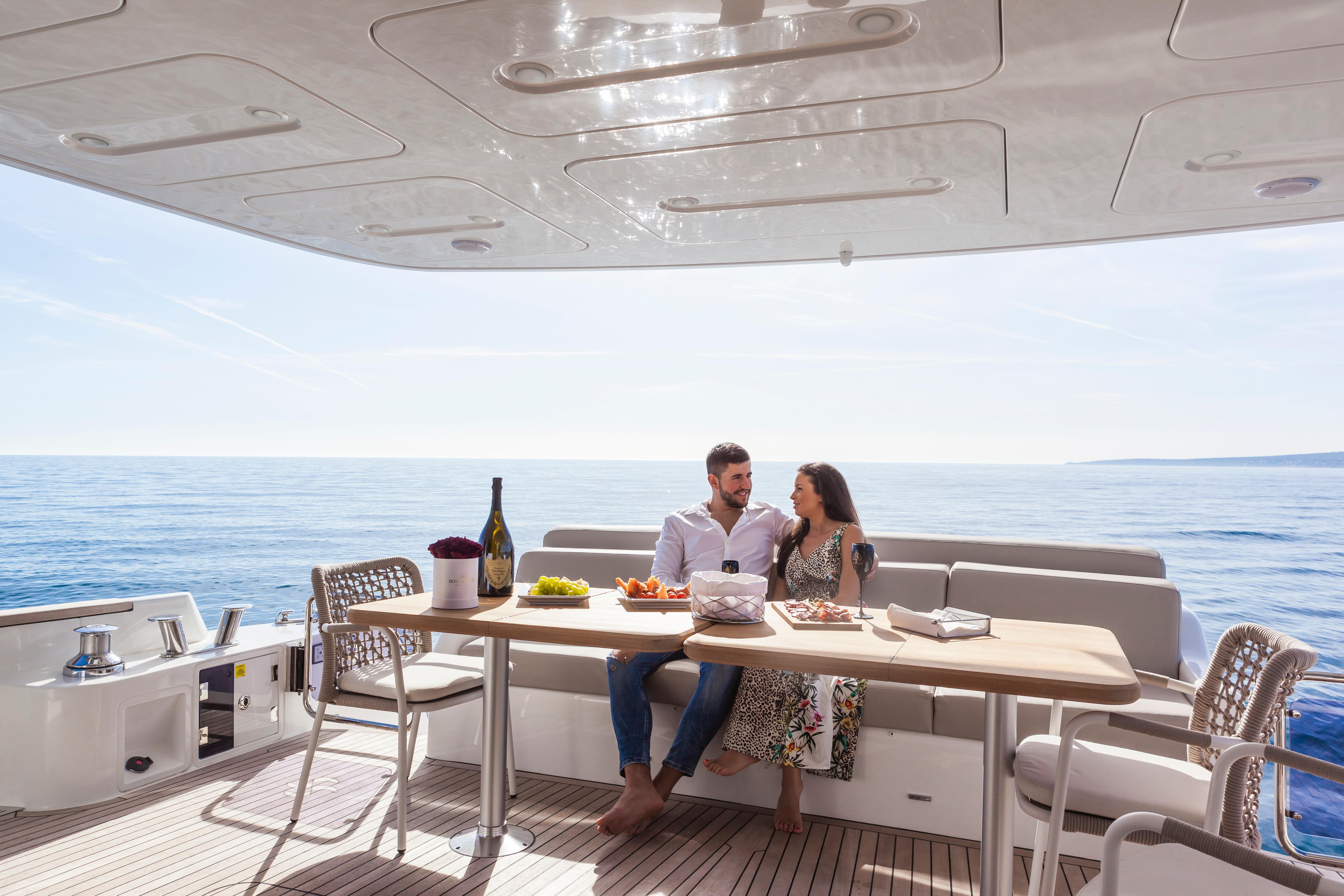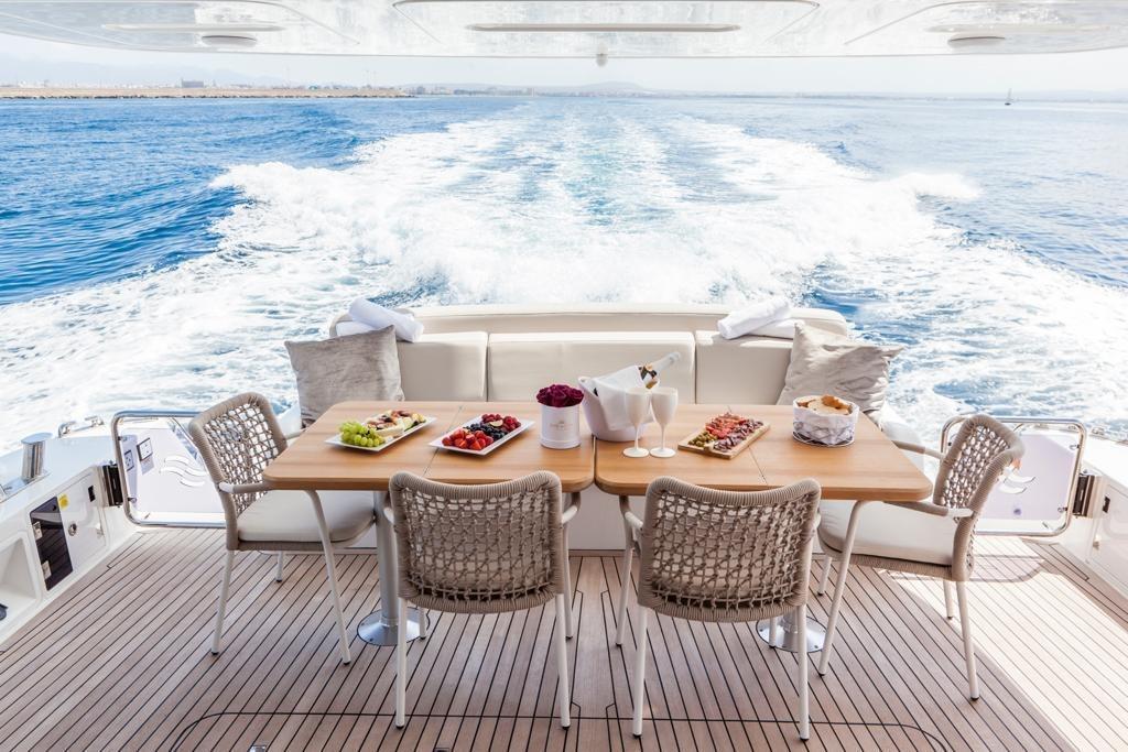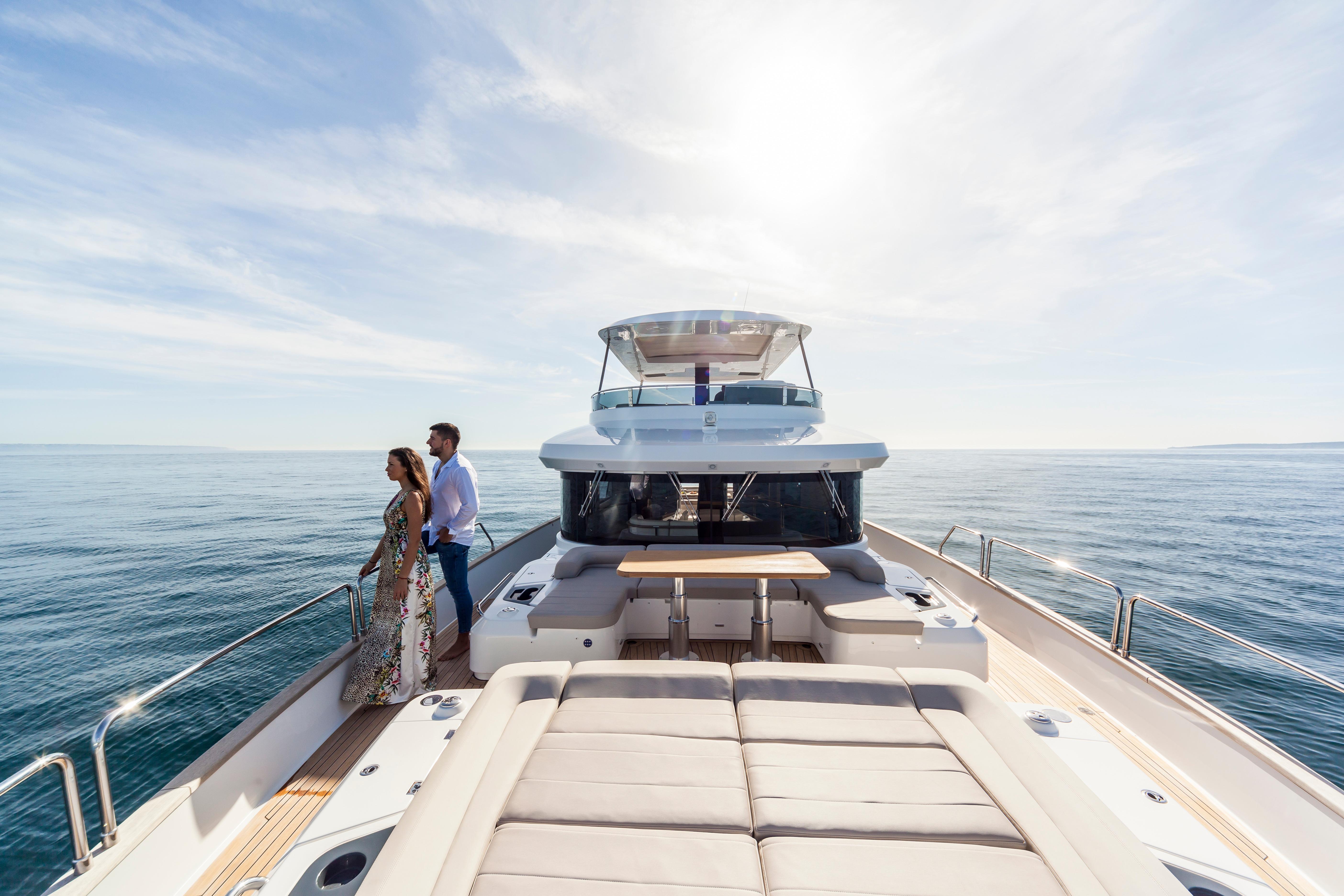 SALACIA features generous deck spaces designed for relaxation and entertaining. The flybridge offers ample seating, sunbathing areas, and a wet bar, creating a perfect social hub with panoramic views. Forward, the large bow lounge provides a quiet, private area for sunbathing or relaxing at anchor. A wide swim platform ensures easy water access, ideal for swimming and launching water toys.