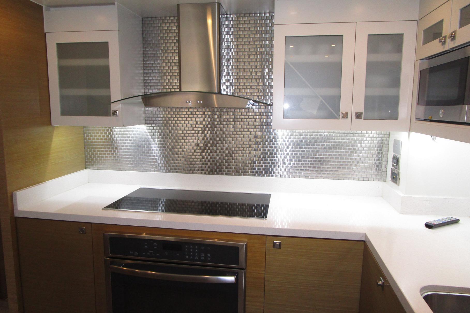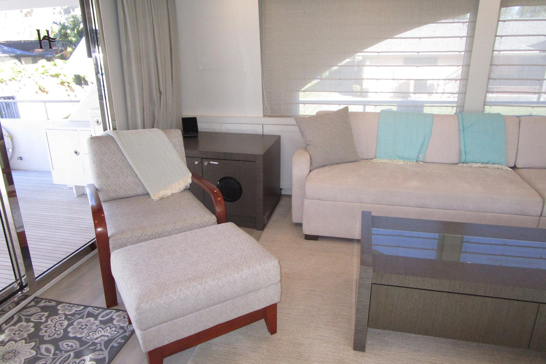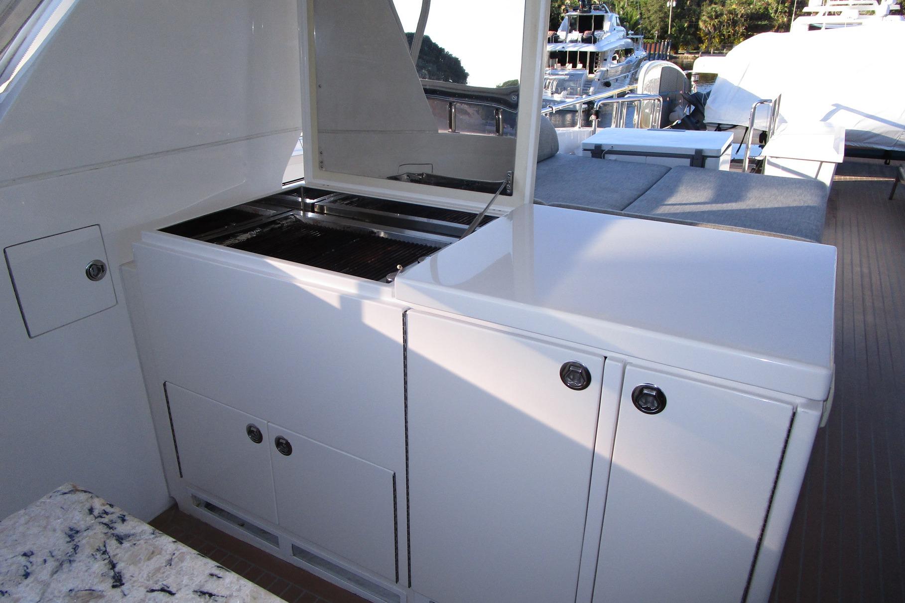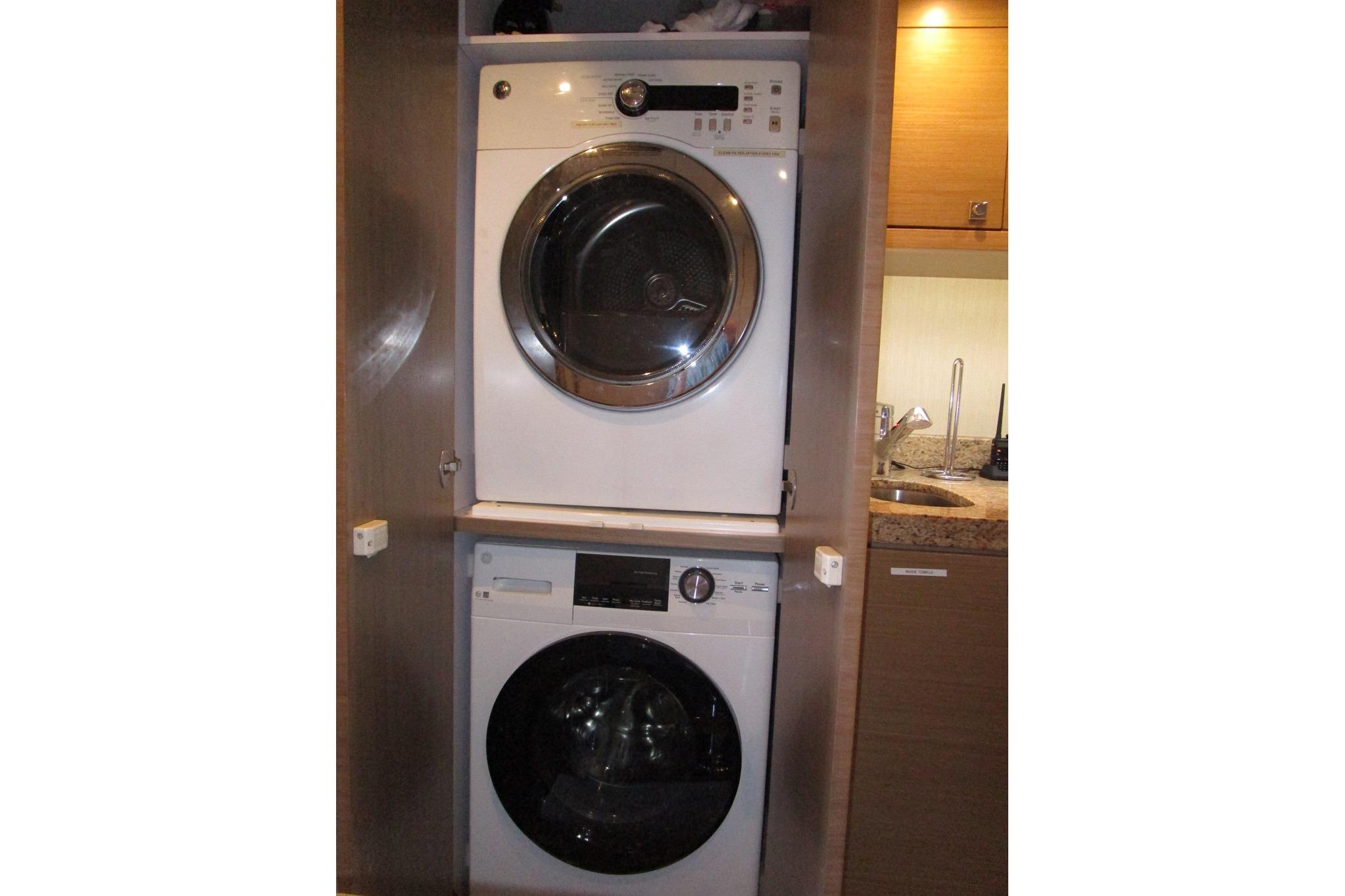 Immediately to port are six storage cabinets including a standard Horizon Quantum VHF within. Opposite is a door to the starboard crew head allowing for dual access and a great asset when a guest needs a head without going into the yacht. Forward is access to the over/under cabin. Opposite is the captain’s queen size cabin with a private head. Further forward is a locker with a full size GE washer and a full size GE dryer. Next forward is a small galley area with a sink, granite top, GE microwave and a drink fridge. Opposite is a three person lounge and table.