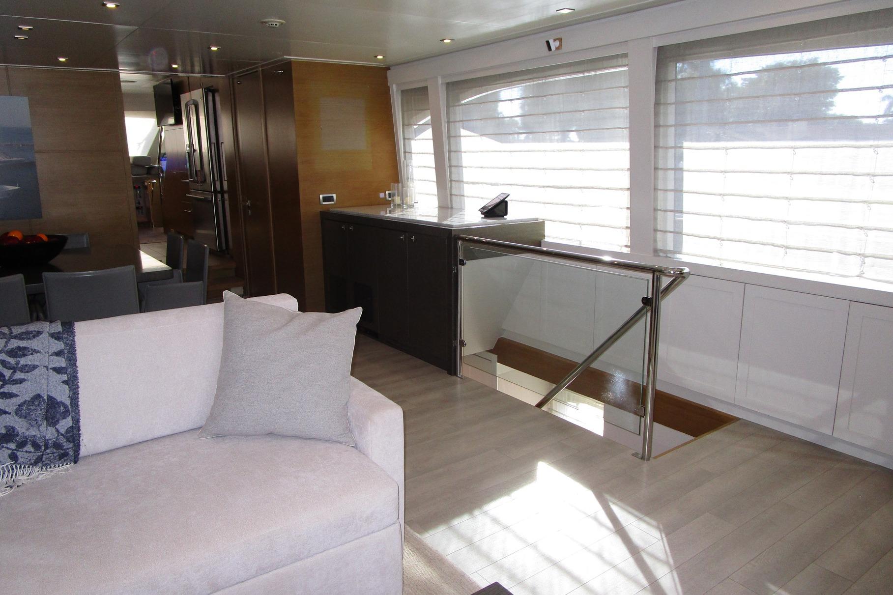 SALONEntered from the aft deck just starboard of the centerline is the salon with four port and four starboard large house side windows covered with translucent Roman shades. Immediately to starboard is a 55” Samsung Smart TV angled toward the couch. Next forward is a built-in double cabinet with a Carrera marble top. Further forward are steps with a clear glass enclosure leading to the private master suite.
