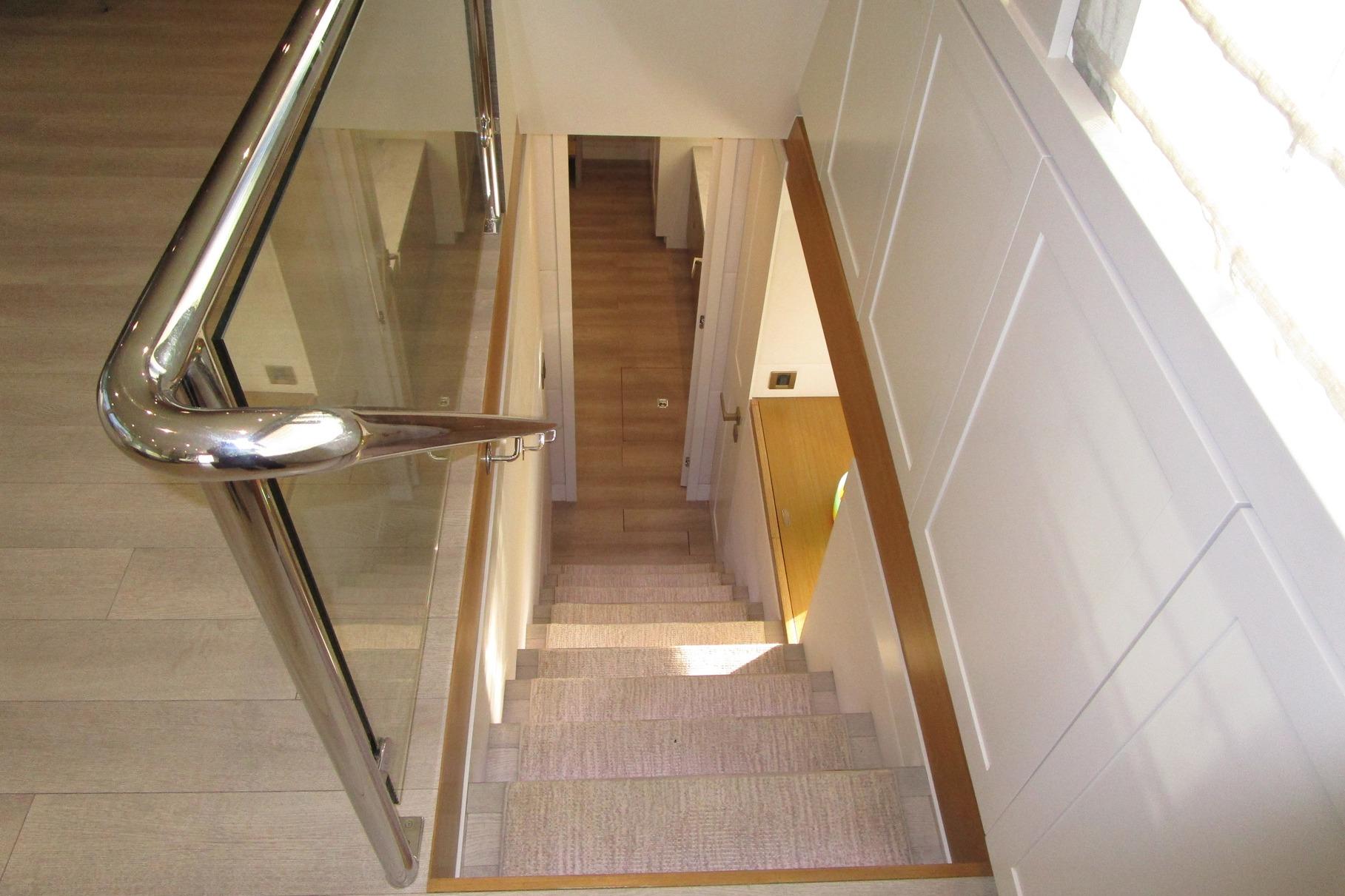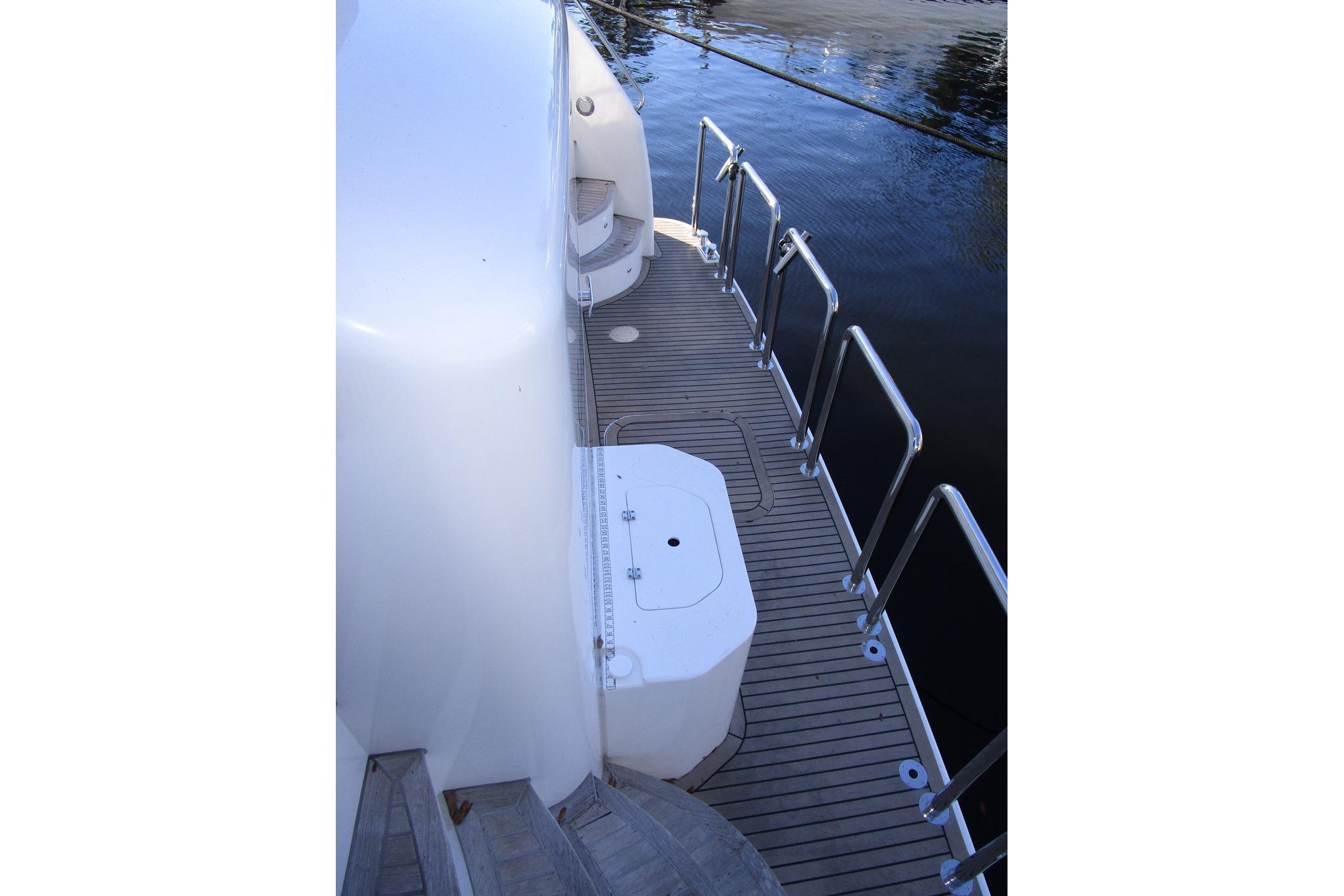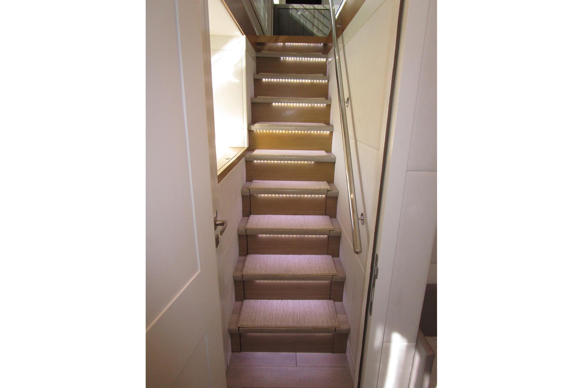 MASTER CABIN COMPANIONWAYFrom the forward starboard side of the salon, ten carpeted steps with a glass surround and stainless-steel railing lead below. Along the way a top opening cabinet reveals the yachts two water heaters. Above is a large stainless steel deadlight. At the foot of the stairs is a 5-shelf full size loader.
