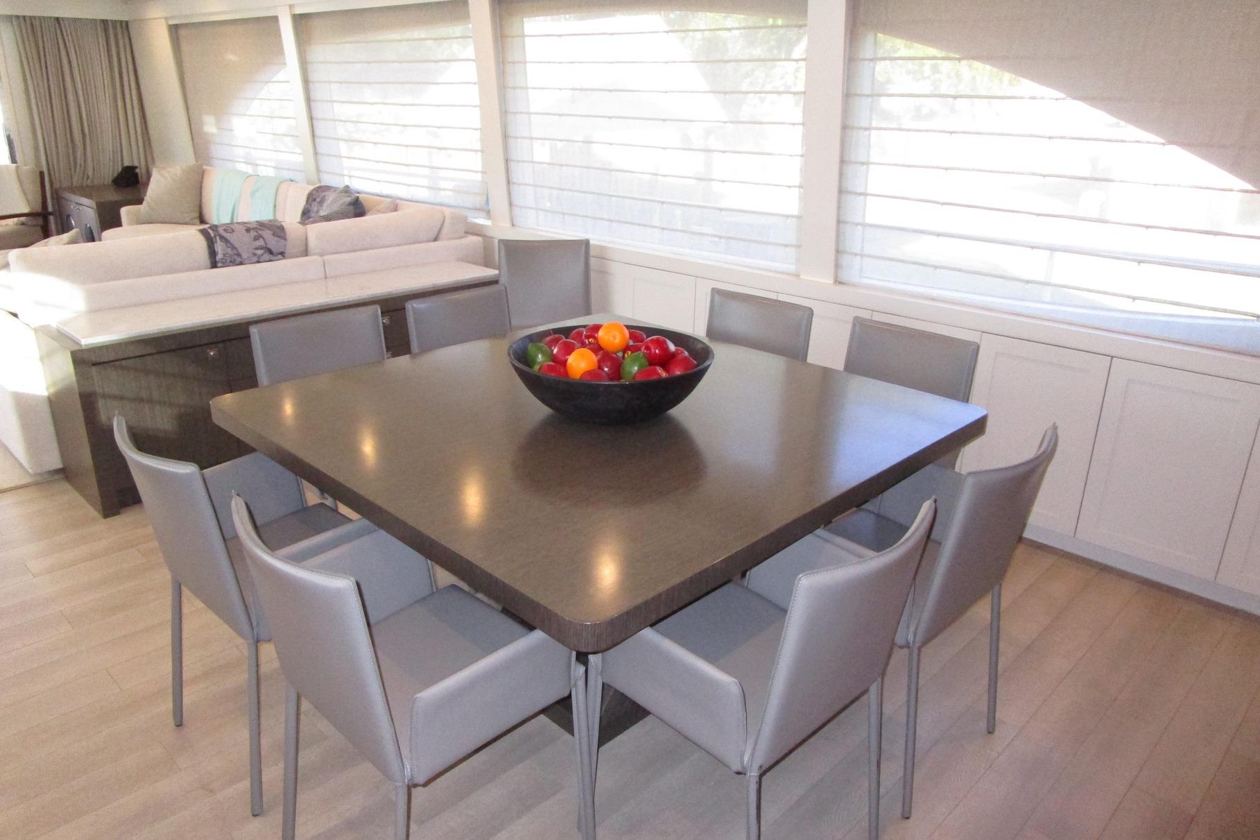 DINING SALONA low banquette style room divider is just forward of the salon’s settee. Topped with Carrera marble below are five drawers and two 3-shelf cabinets for all the yachts’ dinnerware. Next forward on the port side is a square 57” x 57” fixed position dining table with eight leather dining chairs.
