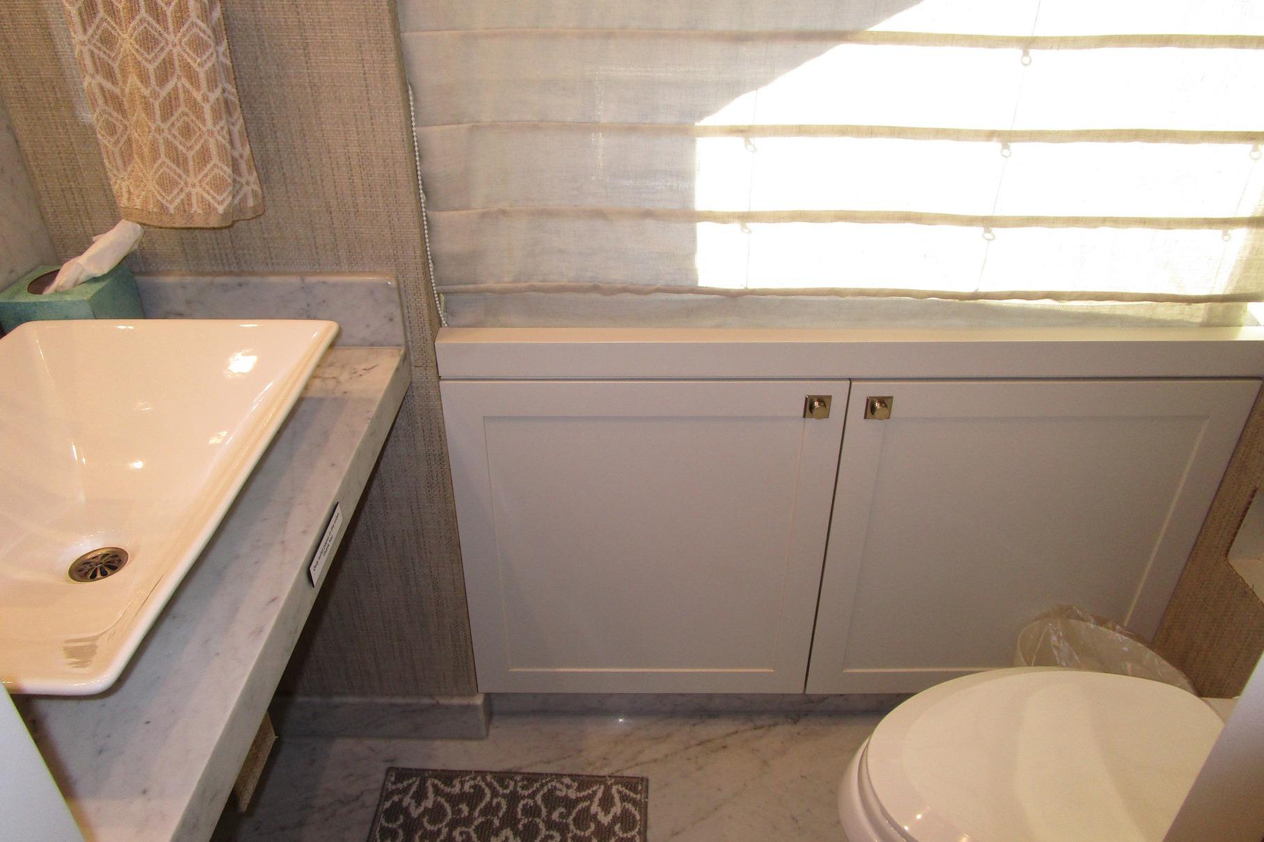 DAY HEADTo starboard the day head has a full-size Headhunter toilet, a house side window with Roman shades and a Carrera countertop with a Kohler above counter vessel type sink with bulkhead faucet fixtures.