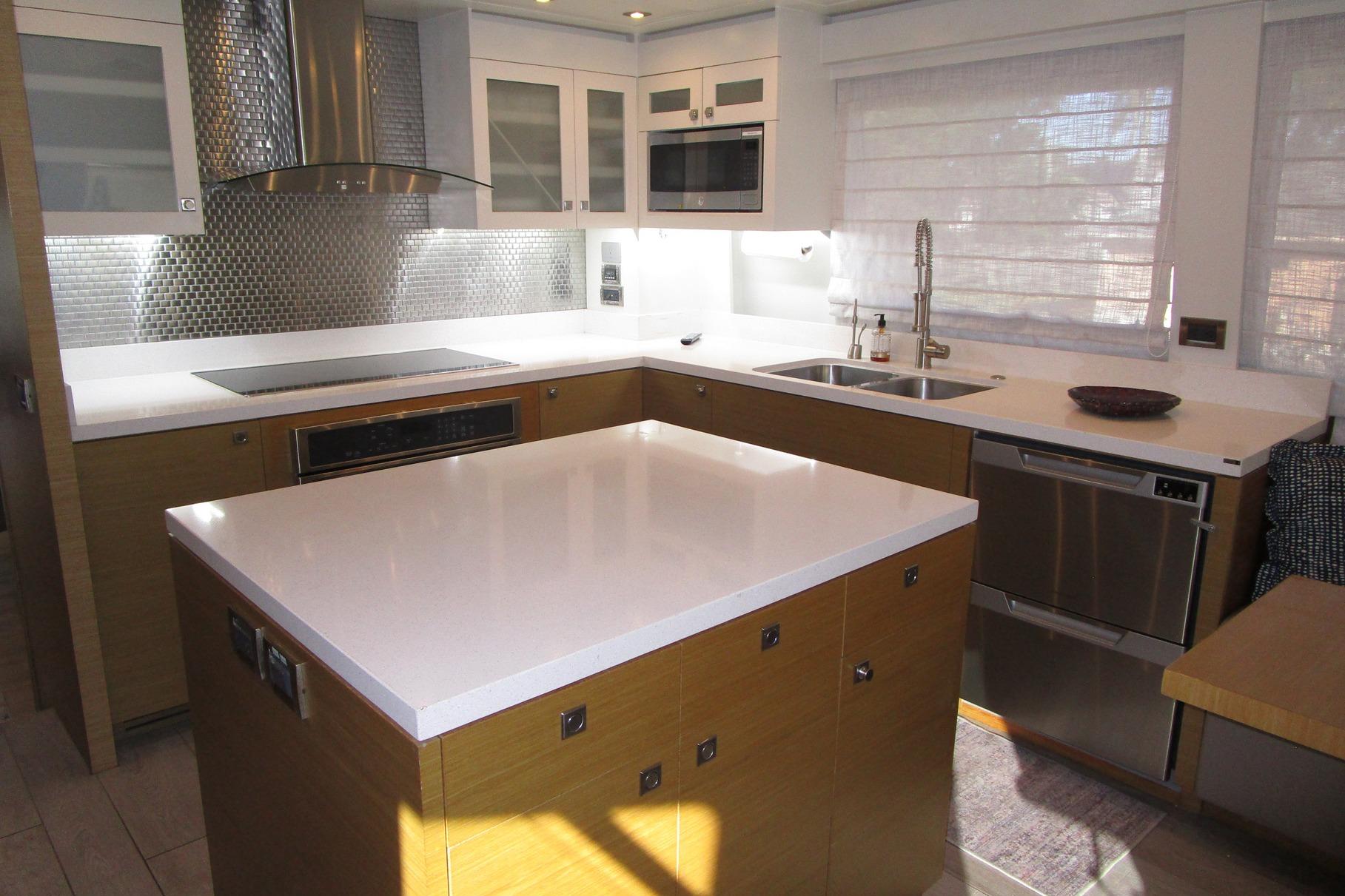 GALLEYUp two steps from the salon going forward is the large open galley with full size appliances and large house side and forward windows. The sole is the same planked “driftwood” wood as the salon and dining area but now faces forward and aft. The galley is open to the lower helm area.