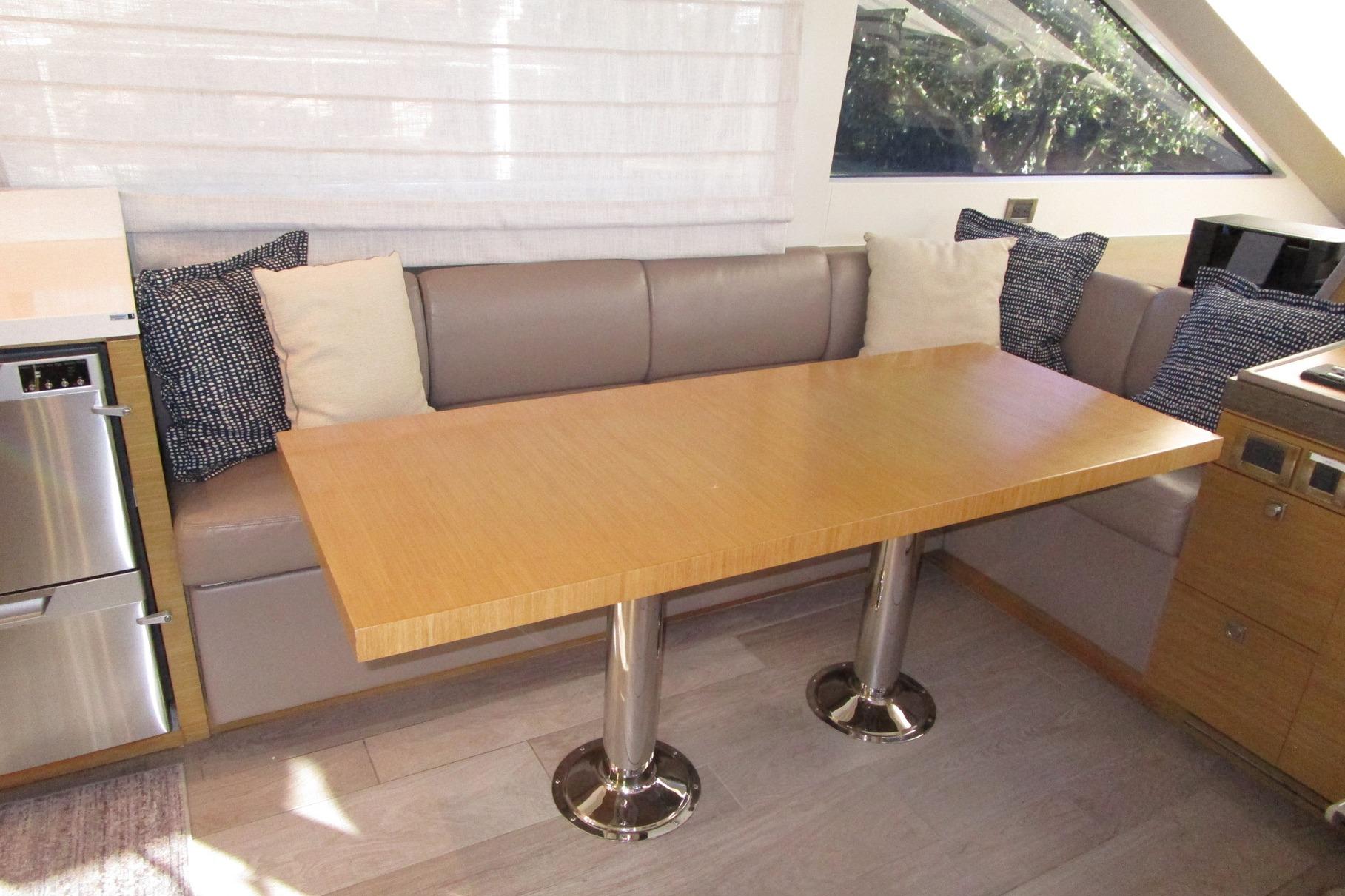 The dining area has (17) overhead LED lights, (2) stereo speakers, digital A/C controls and a contiguous “driftwood” wood sole from the salon.
