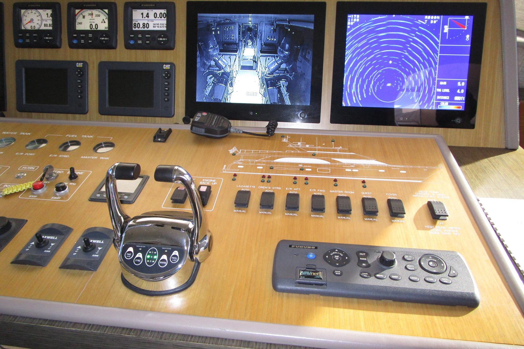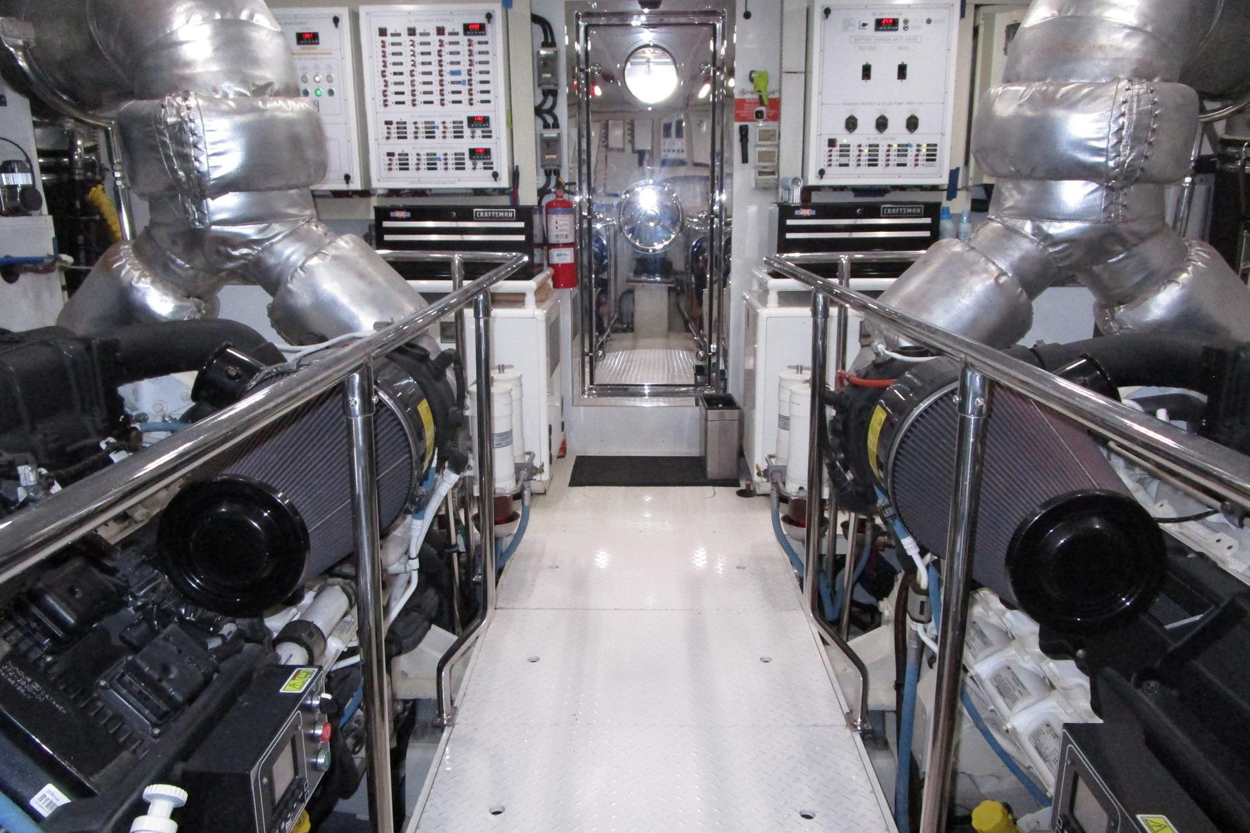 The crew area is accessed from the swim platform. To starboard is a dual access head and bunk room with (2) beds. To port is the captain’s cabin with a queen-size berth and a private head. In the main companionway is a second washer/dryer, sink, fridge, and microwave.