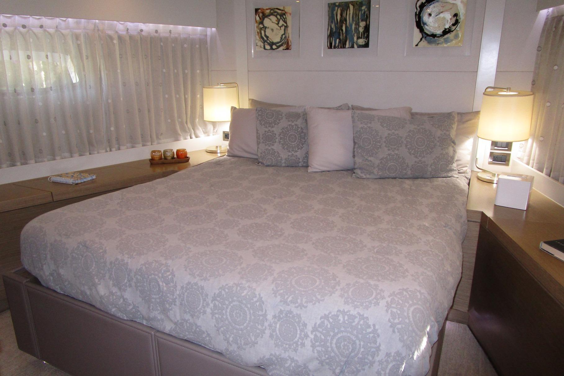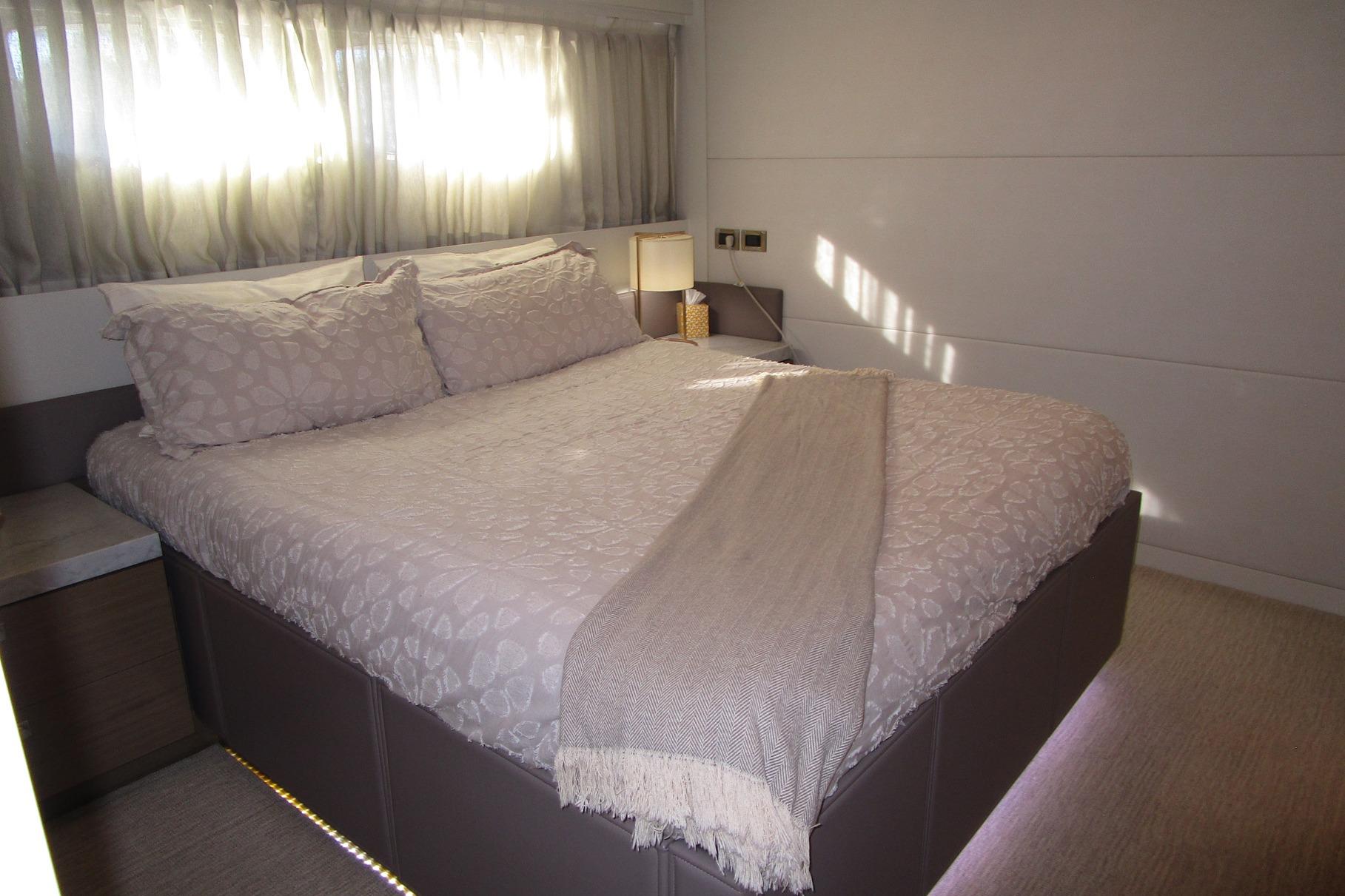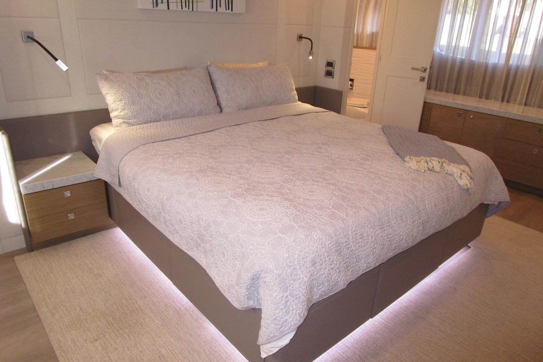 MASTER CABINEntering the master cabin, a king-size berth is located off the aft bulkhead twin two-drawer Carrera marble topped nightstand flanking the berth. Above are goose neck reading lights. Below the berth are two port and two starboard drawers with LED rope lighting around the perimeter.