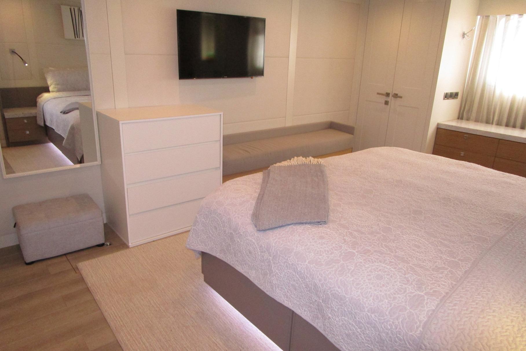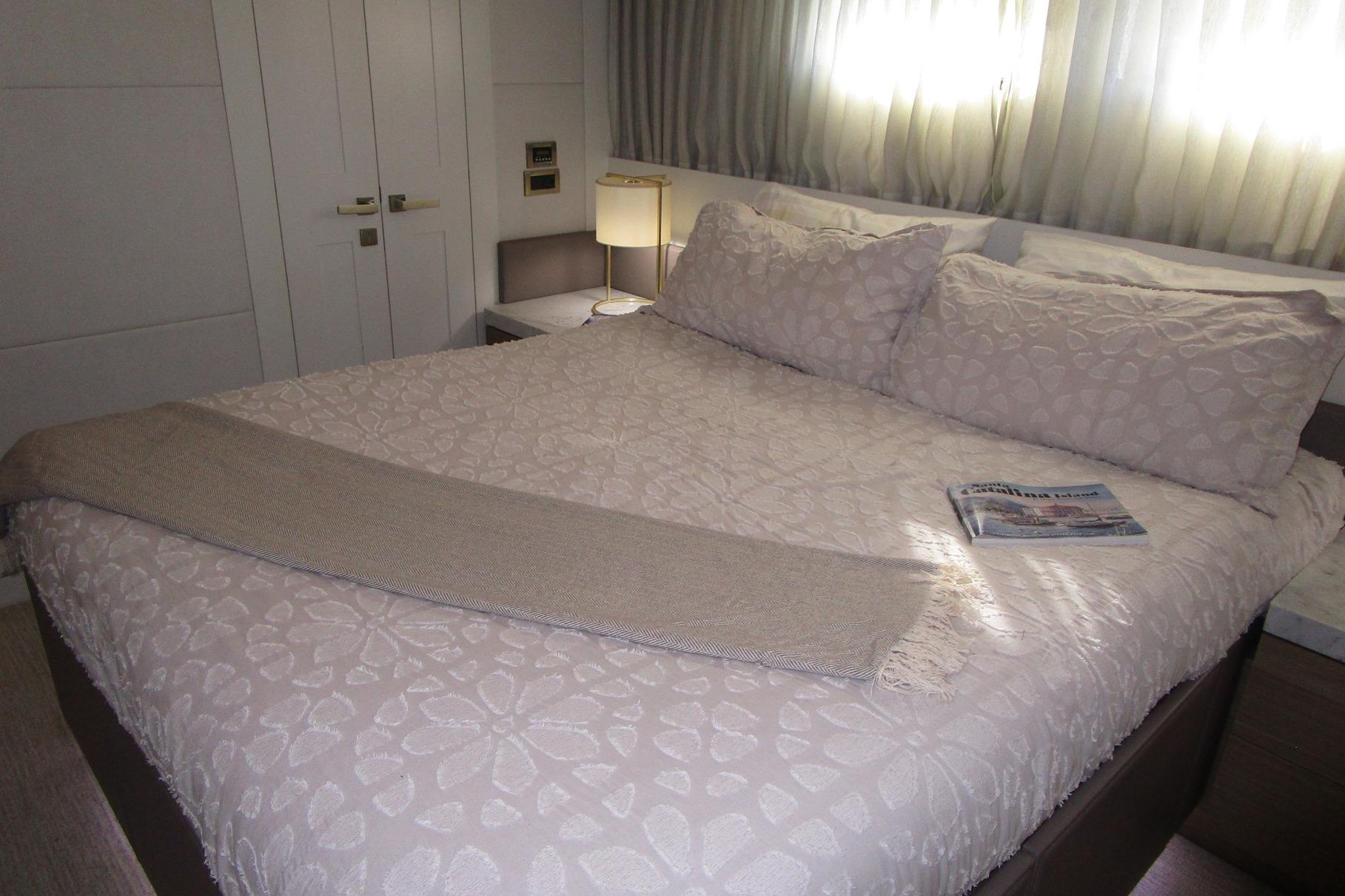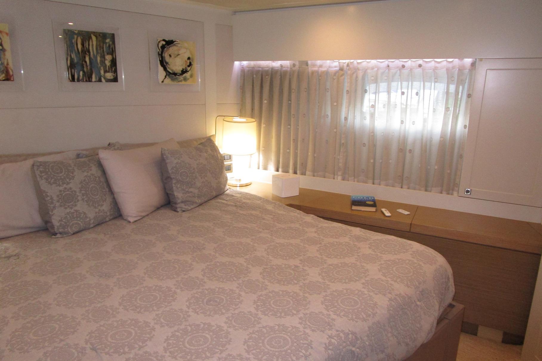 MASTER CABINEntering the master cabin, a king-size berth is located off the aft bulkhead twin two-drawer Carrera marble topped nightstand flanking the berth. Above are goose neck reading lights. Below the berth are two port and two starboard drawers with LED rope lighting around the perimeter.