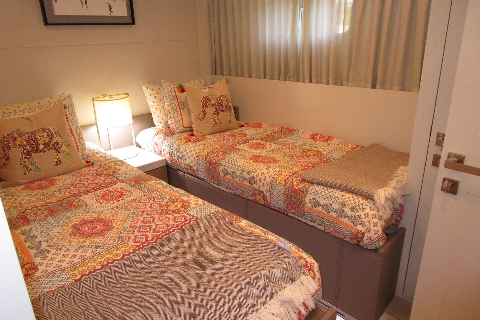 PORT SIDE GUEST CABINEntered via the forward end there are two twin berths off the aft bulkhead separated by a two drawer nightstand with a table lamp above. Two large drawers are under each berth. Above the outboard berth are sheer drapes and an electrically operated blackout curtain oversized opening stainless-steel porthole. At the foot of the berth is a cedar lined auto-lit hanging locker, the private head entrance and a 27” Samsung TV. Also in the head, (7) oversized LED lights, a carpeted sole and digital A/C controls.