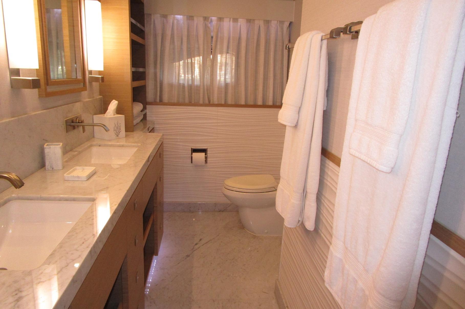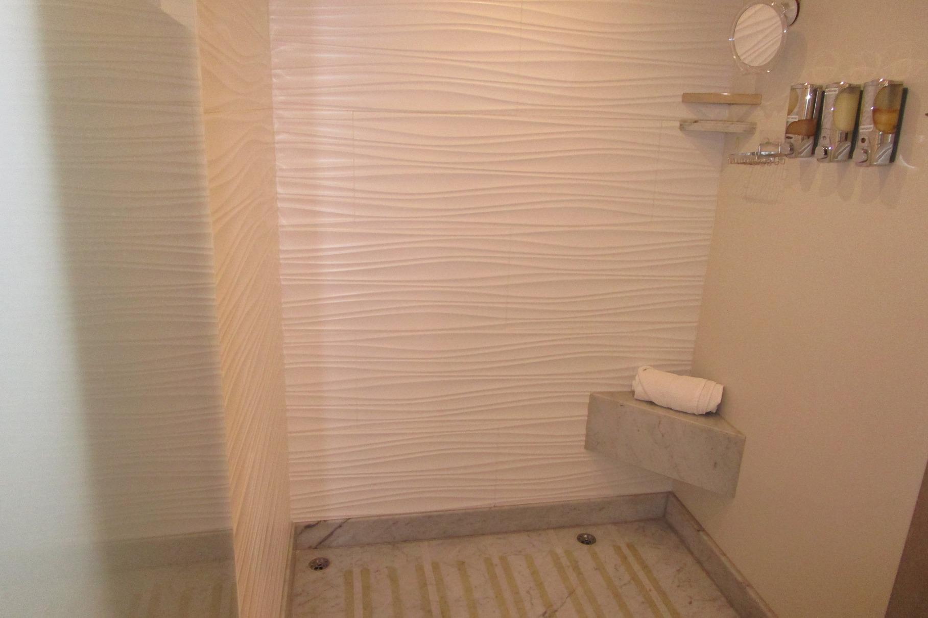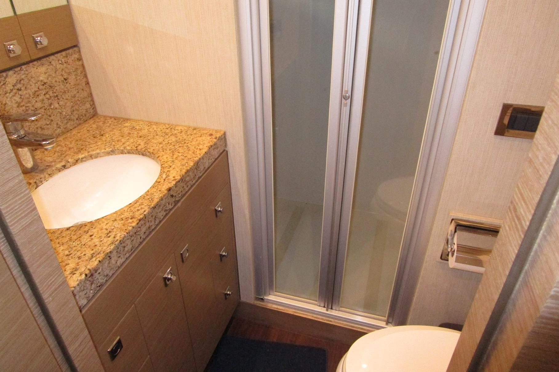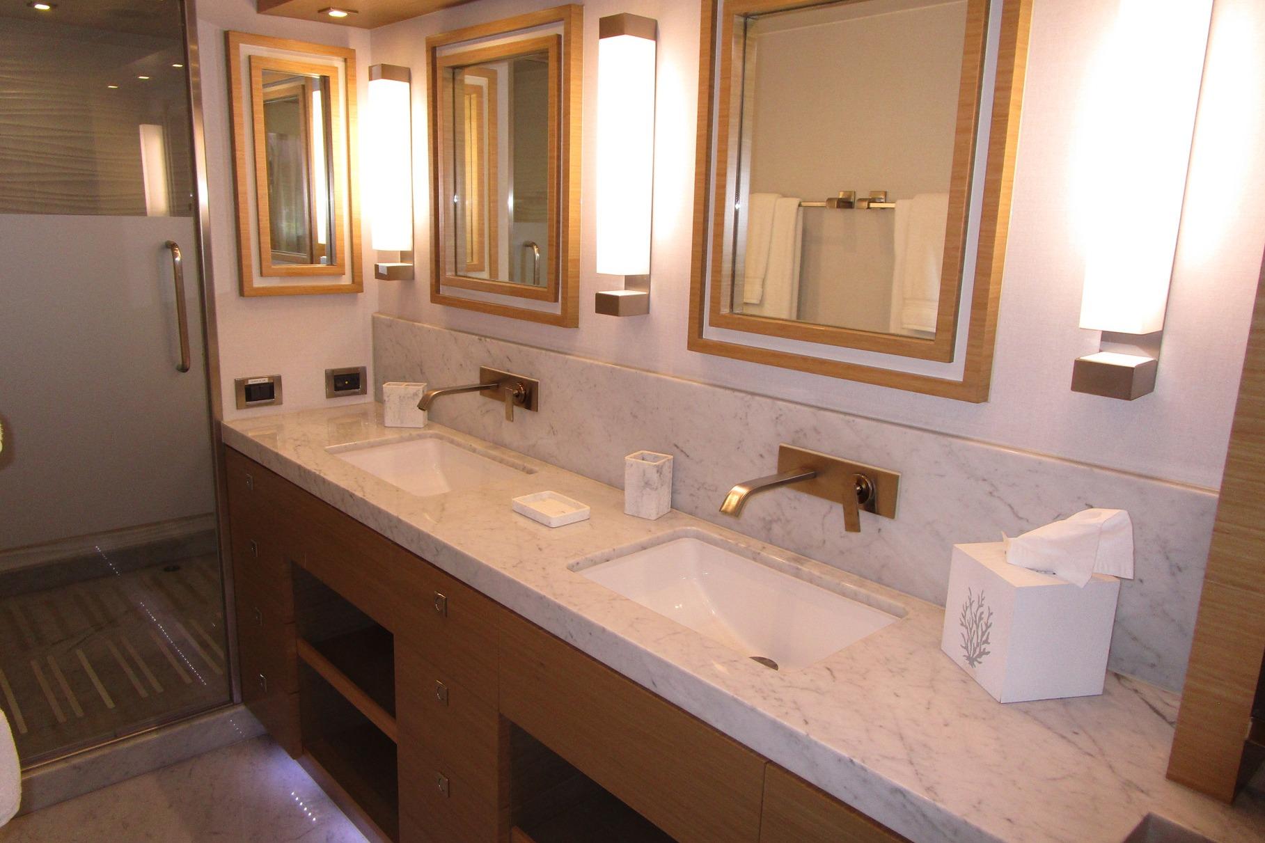 MASTER HEADEntered from the portside aft the master head is nearly full beam. It also offers a double vanity with (12) drawers, a Carrera marble top with undermount china sinks and bulkhead faucets. To port are four more drawers and three open shelves plus a large opening stainless-steel porthole, sheer drapes and a blackout shade. The vanity has (3) separate mirrors with (3) sconce lights between. All the way to starboard is an almost 5’ x 5’ shower with four corner drains, a wall-mounted or handheld fixture, a light, an exhaust fan and a clear glass door. Also in the head there are (8) overhead LED lights and attractive “wave type” Porcelanosa wall tiles.
