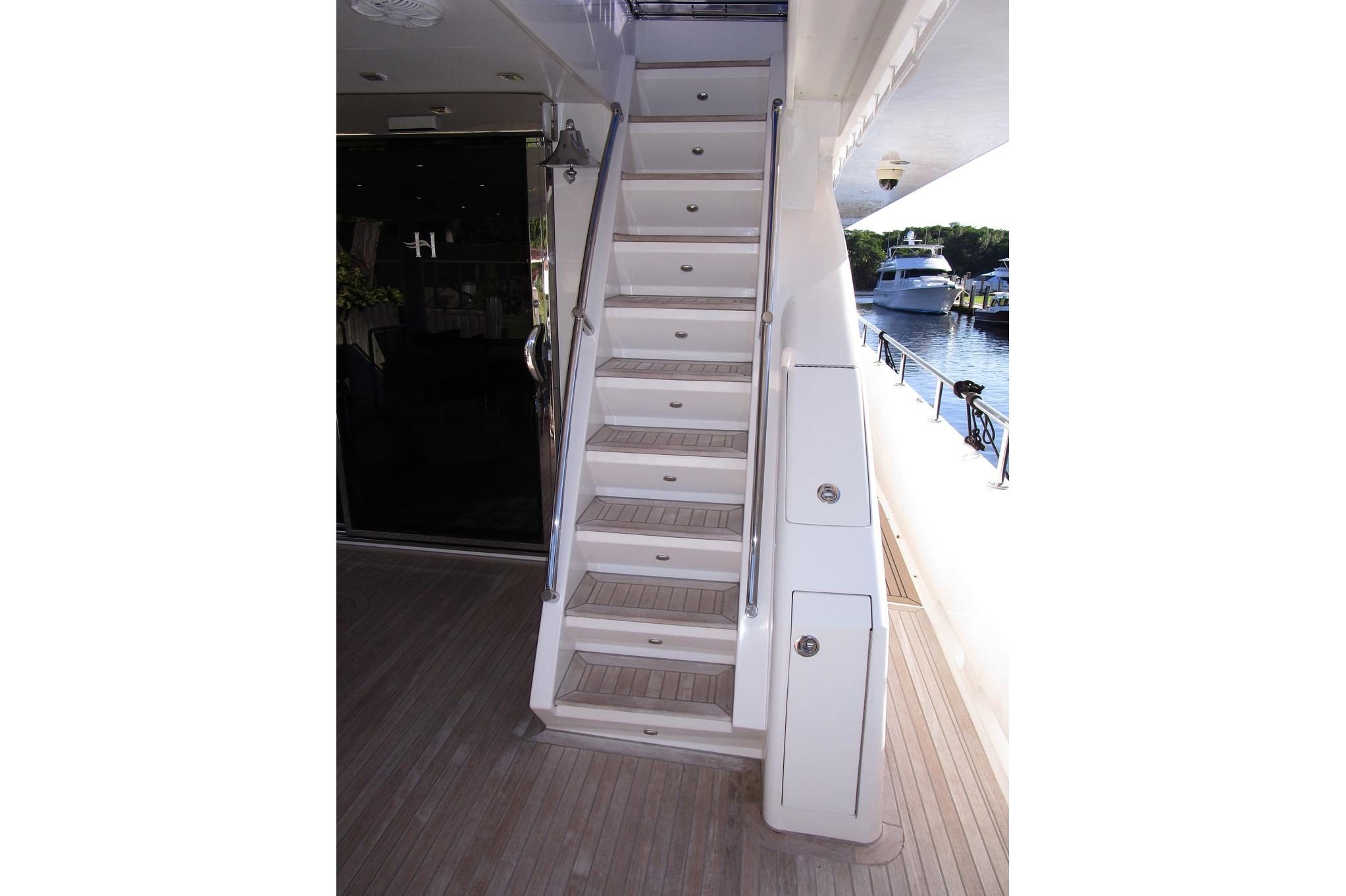 Entrance to the 95' 2016 Hargrave Flybridge Motor Yacht "SEASEID" is via one of the four hull side bulwark doors via a 7-step Tracy boarding ladder. The large aft deck (12 feet fore and aft) has both loose and fixed seating around a 7’ hardwood table. Port and starboard steps lead to the engine room and crew area via the swim platform. Starboard side steps lead to the boat deck and flybridge.