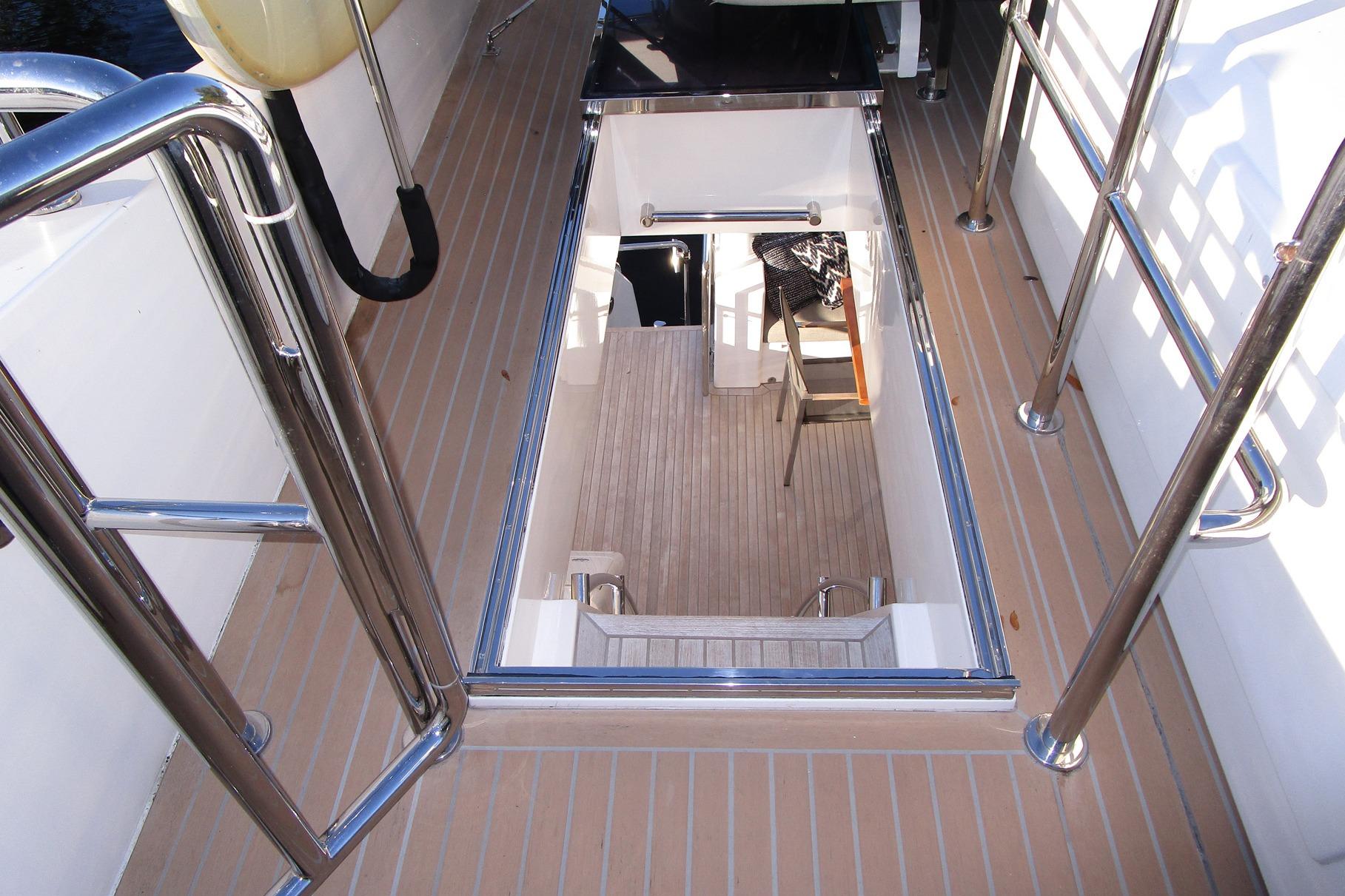 The stainless-steel trimmed auto entry door leads to a generously wide salon but note there are still full side walkaround decks outboard.
