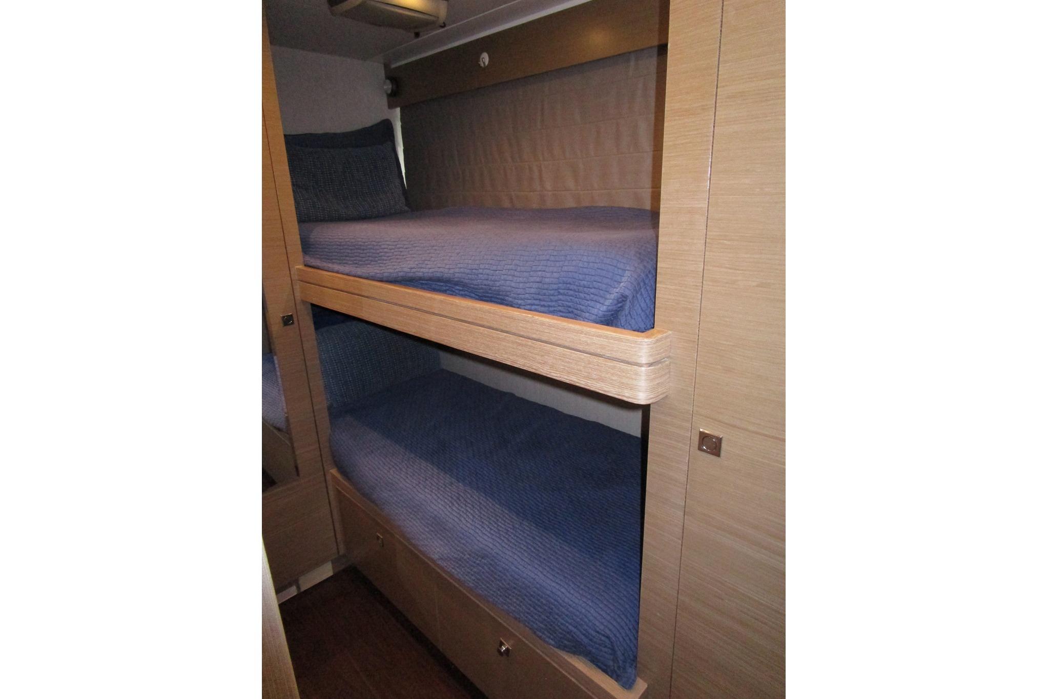 CREW CABINEntered from the inboard side are two bunks outboard. There are two drawers under the lower bunk and a large opening portlight with Roman shade over the upper bunk. There are two auto-lit cedar lined hanging lockers in this cabin. Five LED lights are overhead. A dedicated digital A/C control is within the cabin.