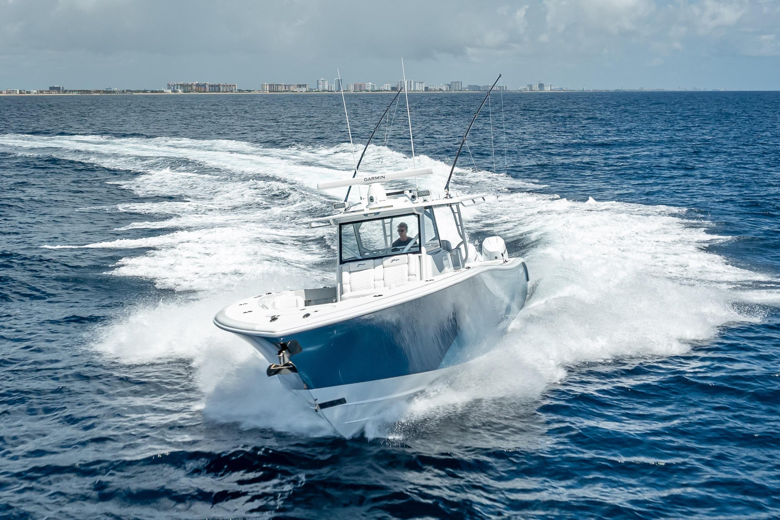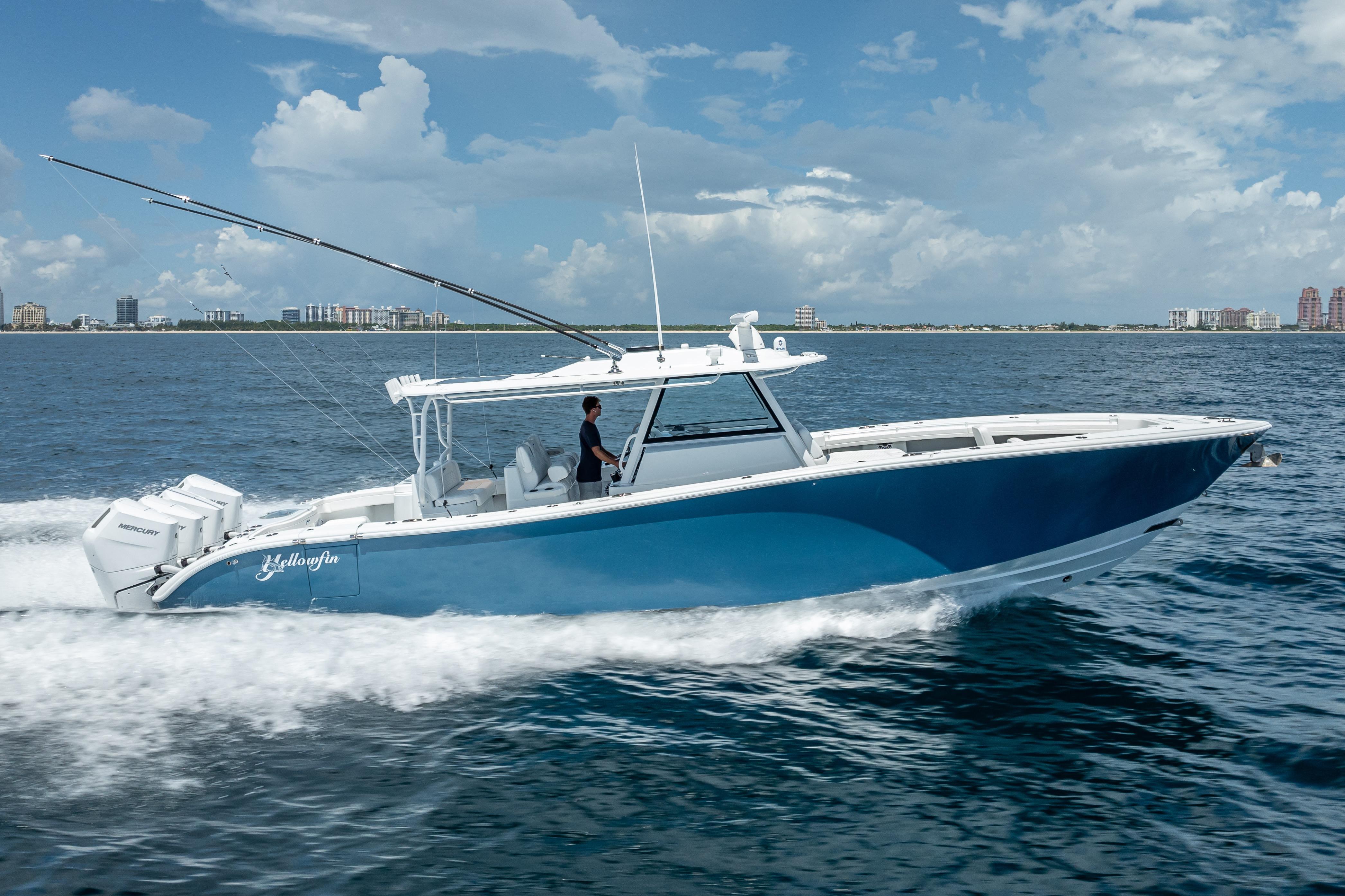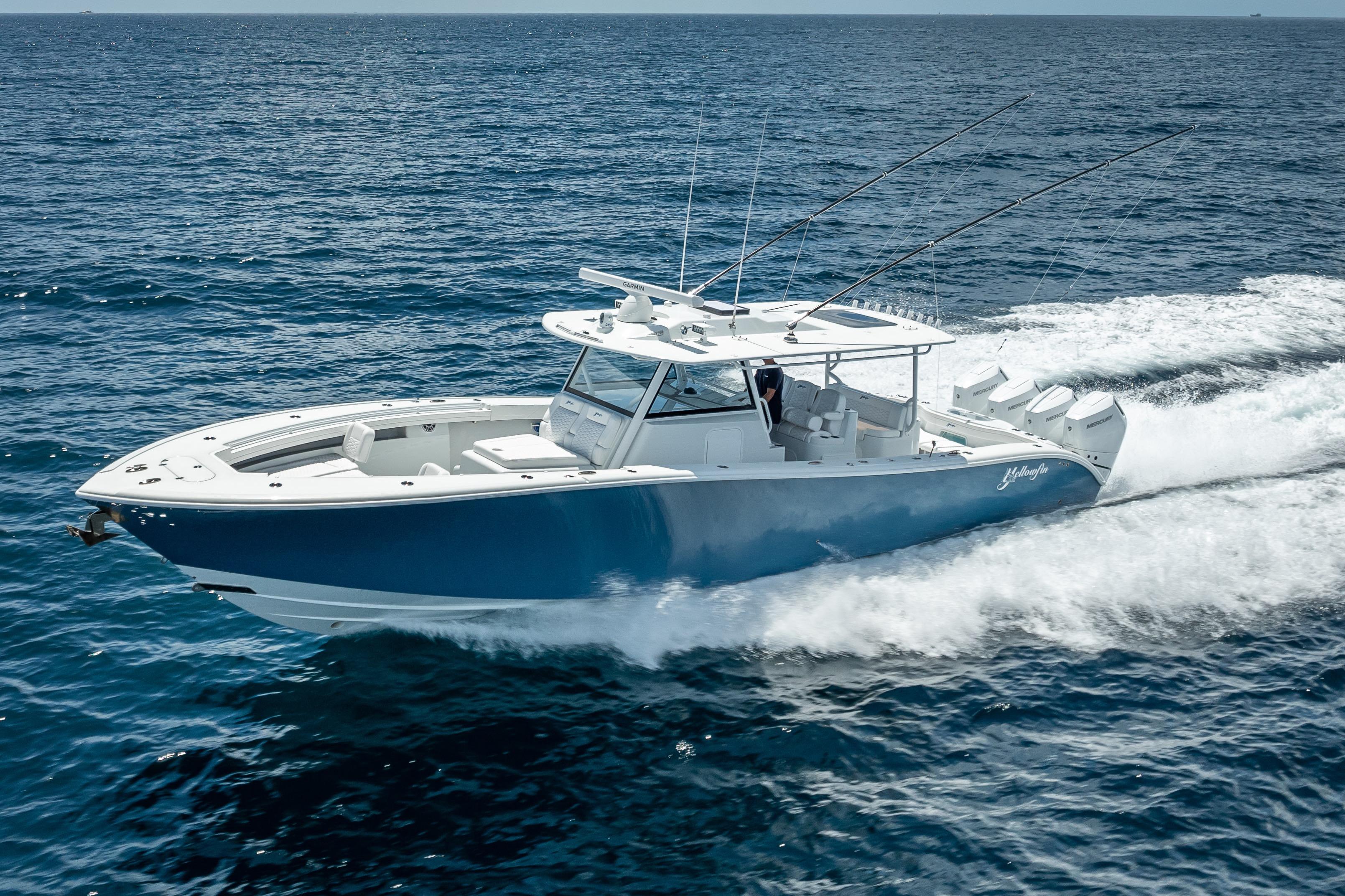 The 42' Yellowfin 2025 Offshore is powered by quad Mercury Verado 400 V10 engines, each producing 400HP with just 100 hours on them. It offers a cruising speed of 45 mph and a max speed of 68 mph. The boat features a 12-foot beam, a 1'10" draft, and a 576-gallon fuel tank.