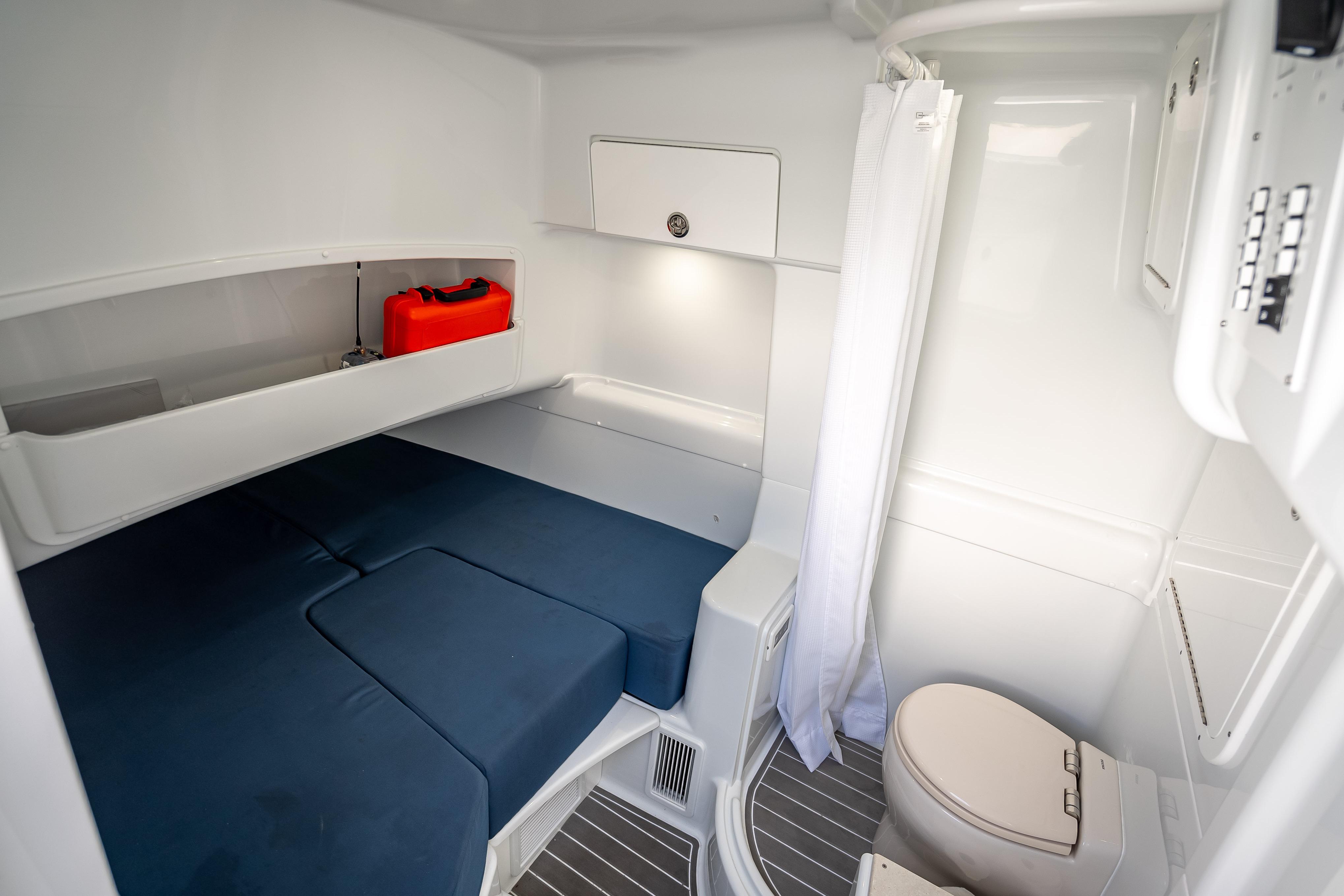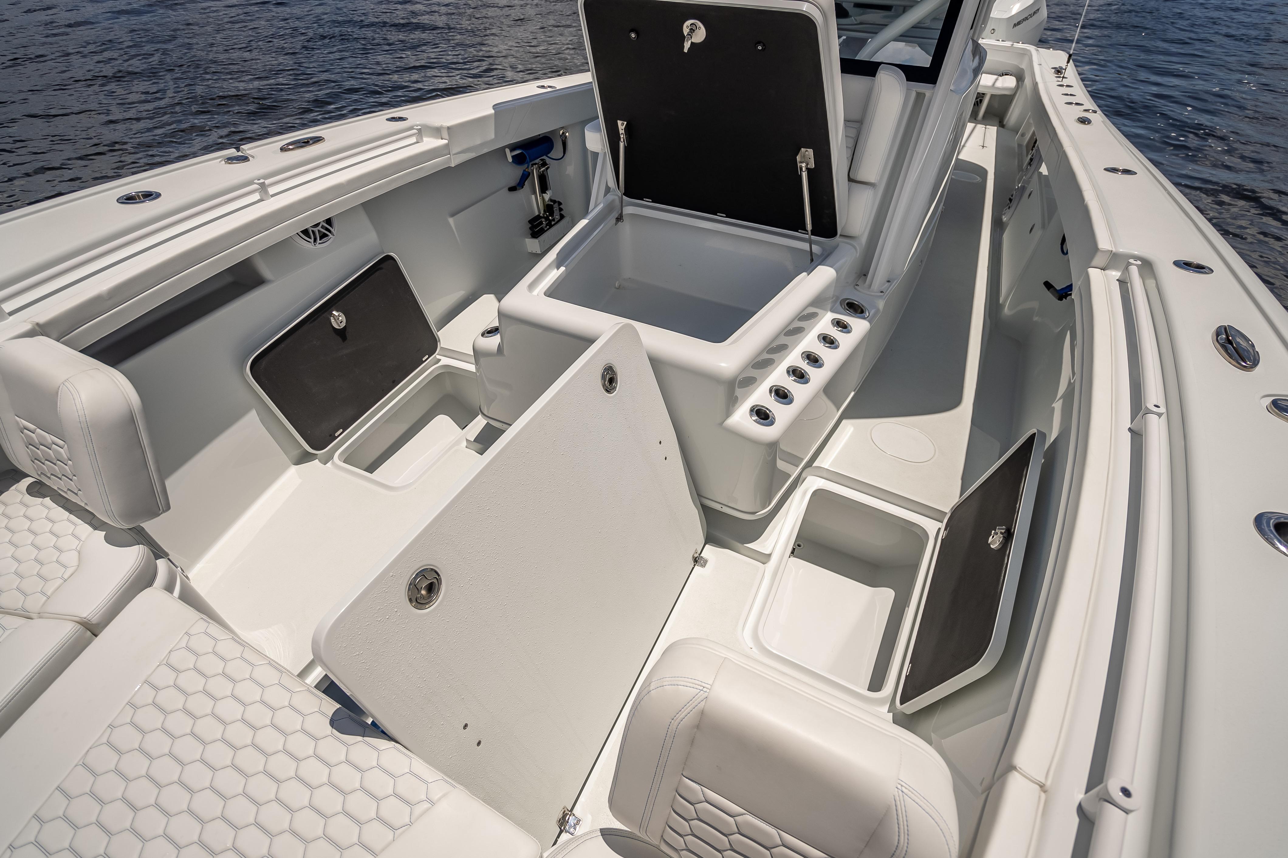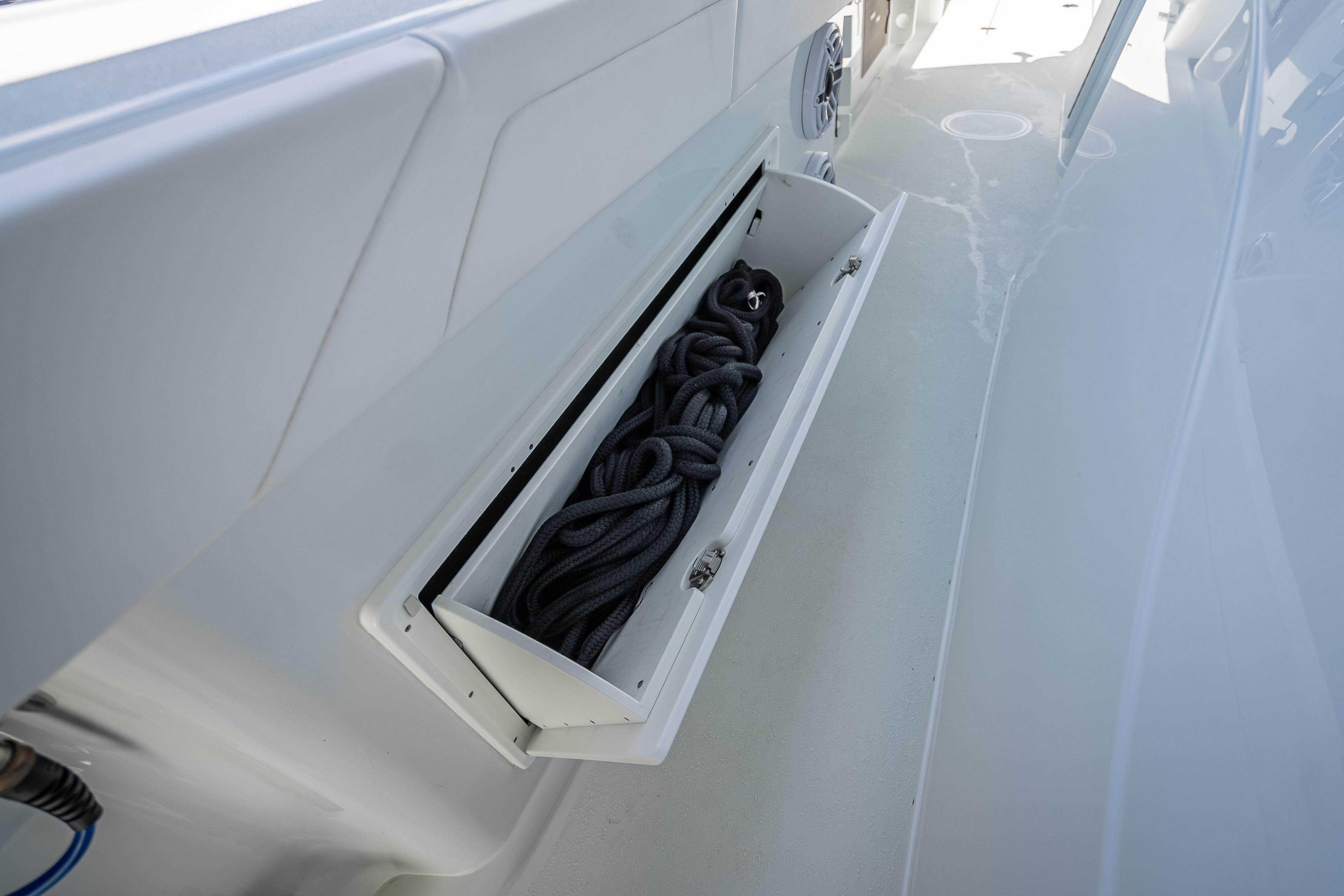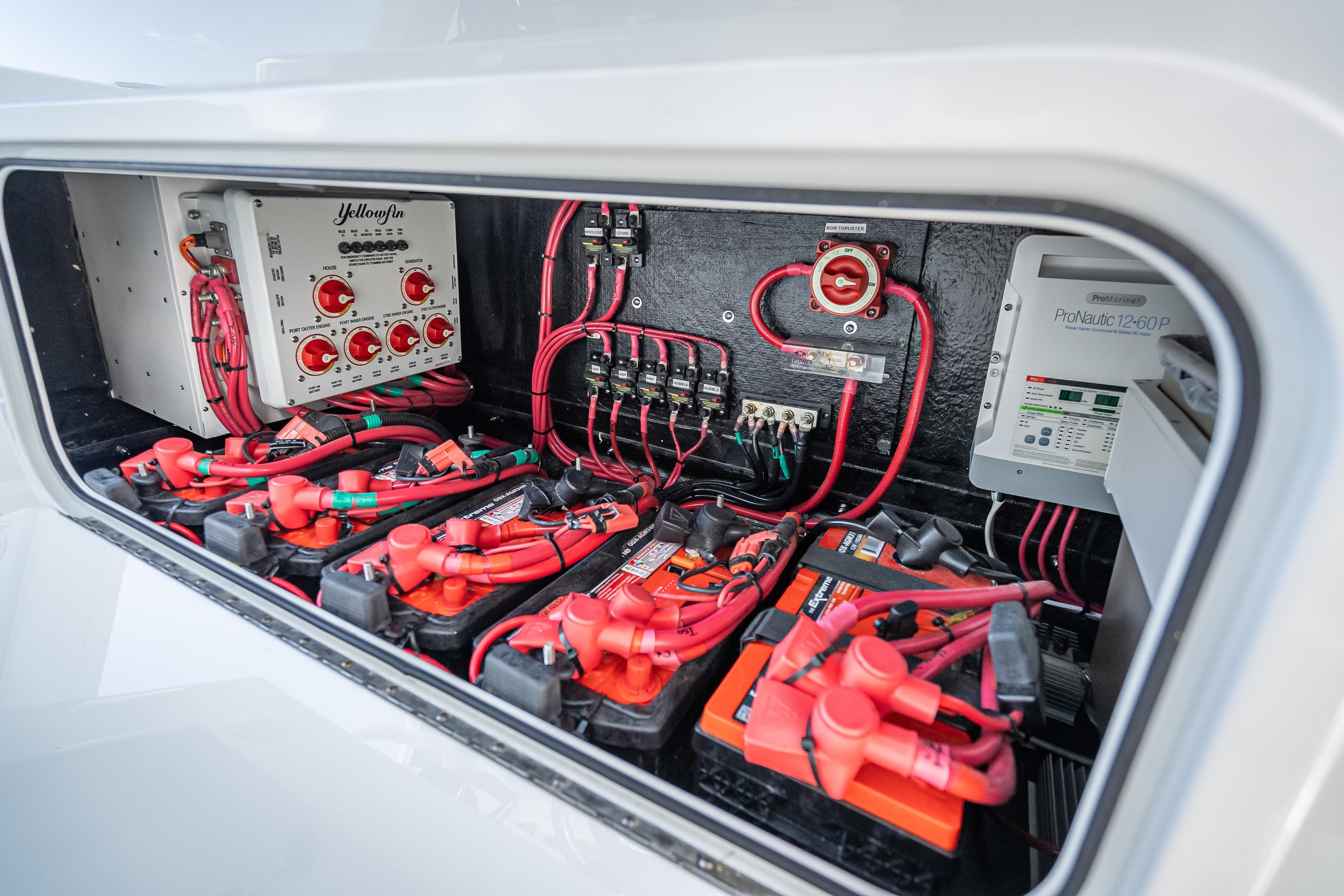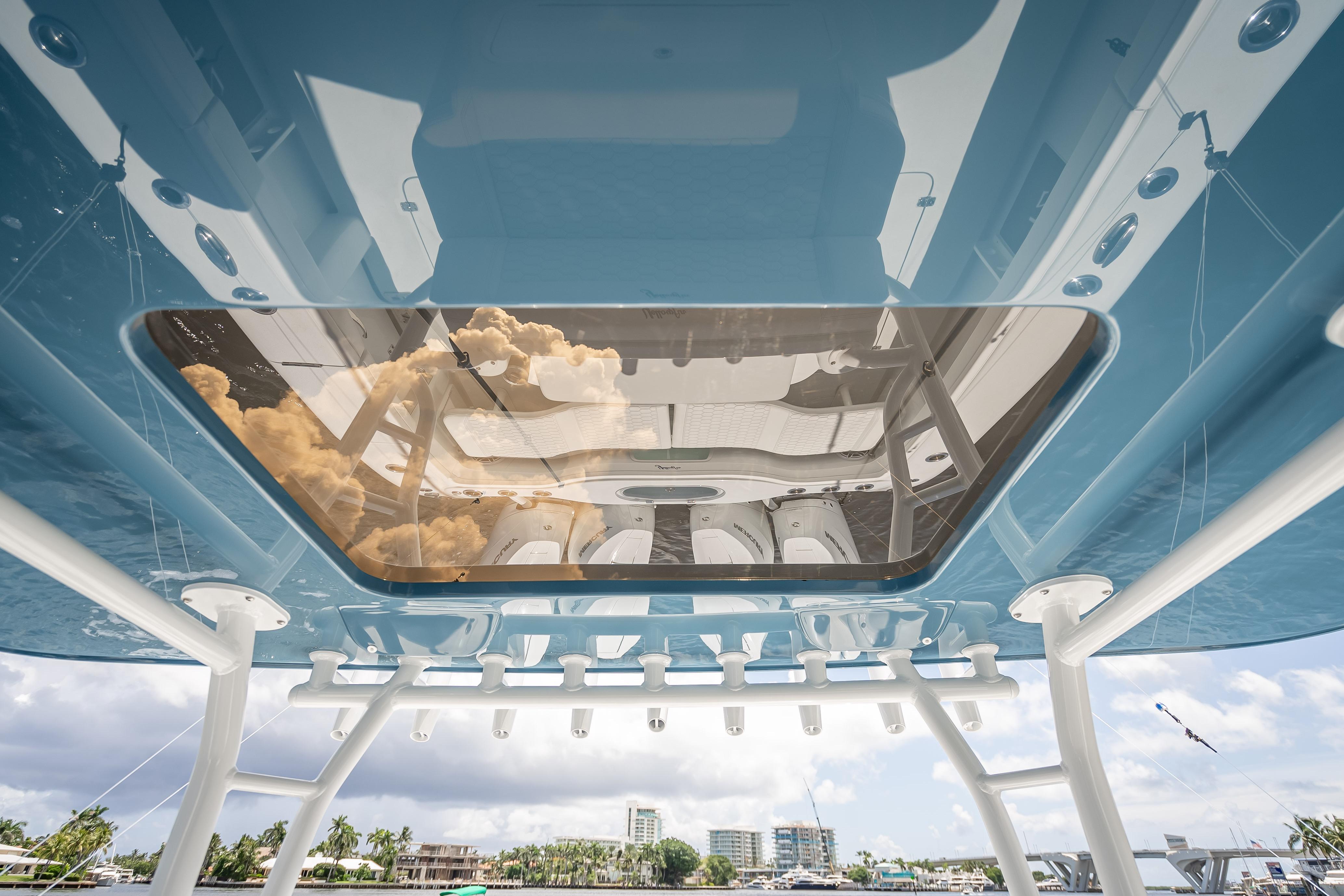 For added convenience, the boat includes a Mase 4kW Generator with a custom sound shield, air conditioning, and a grill. Other features include a dive door, tow eye, bow thruster, windlass, dual-row hardtop, FLIR Camera, and dual spotlights.