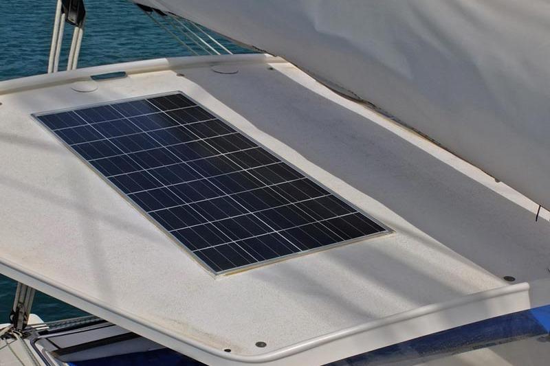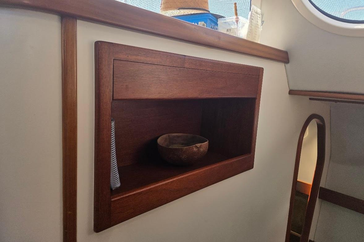 One of the reasons that Delphine looks so good is the fact that it has a custom storage cover that is also stored in climate controlled area.the running rigging was changed at this time. We have continued to improve Delphine with updated electronics, including chart plotter , vesper x8000 Ais ,speed depth and wind , programable dual voltage 60 amp charger victron solar controllers ,smart shunt 1200 watt 110 inverter and battery monitor. We also put on a new auto helm pump in 2022 and new ACR relays last year. The upgraded solar array on a tilting custom rack ,now sends 960 watts of charging into the NEVER used Victron lithium 300 amp hour battery bank. This amount of power lets us make toast in the morning, water all day ice as needed and keeps the custom fitted Engle drinks cooler in cockpit running. My wife also uses a blow drier. She also likes the freshwater electric flush head. The 230 volt inverter runs the the washing machine.