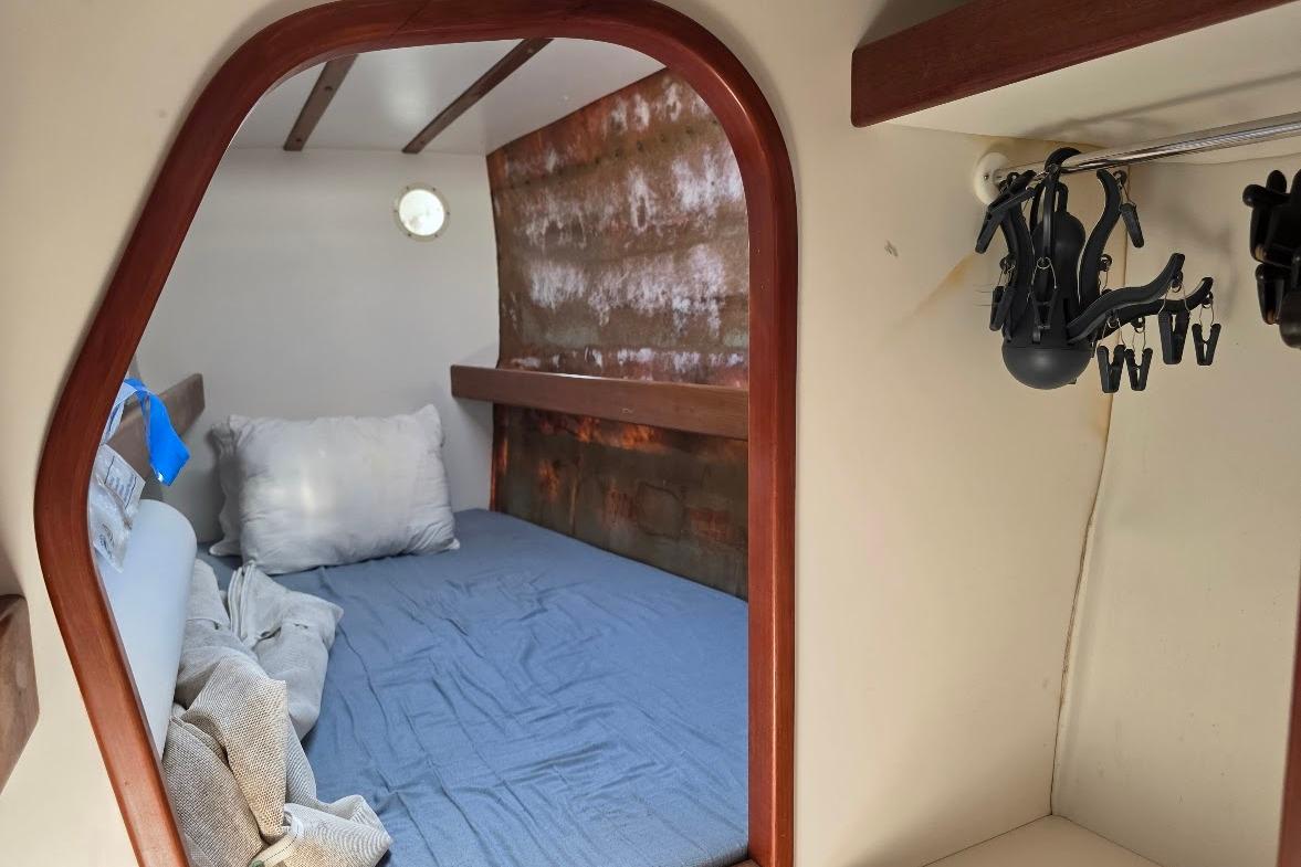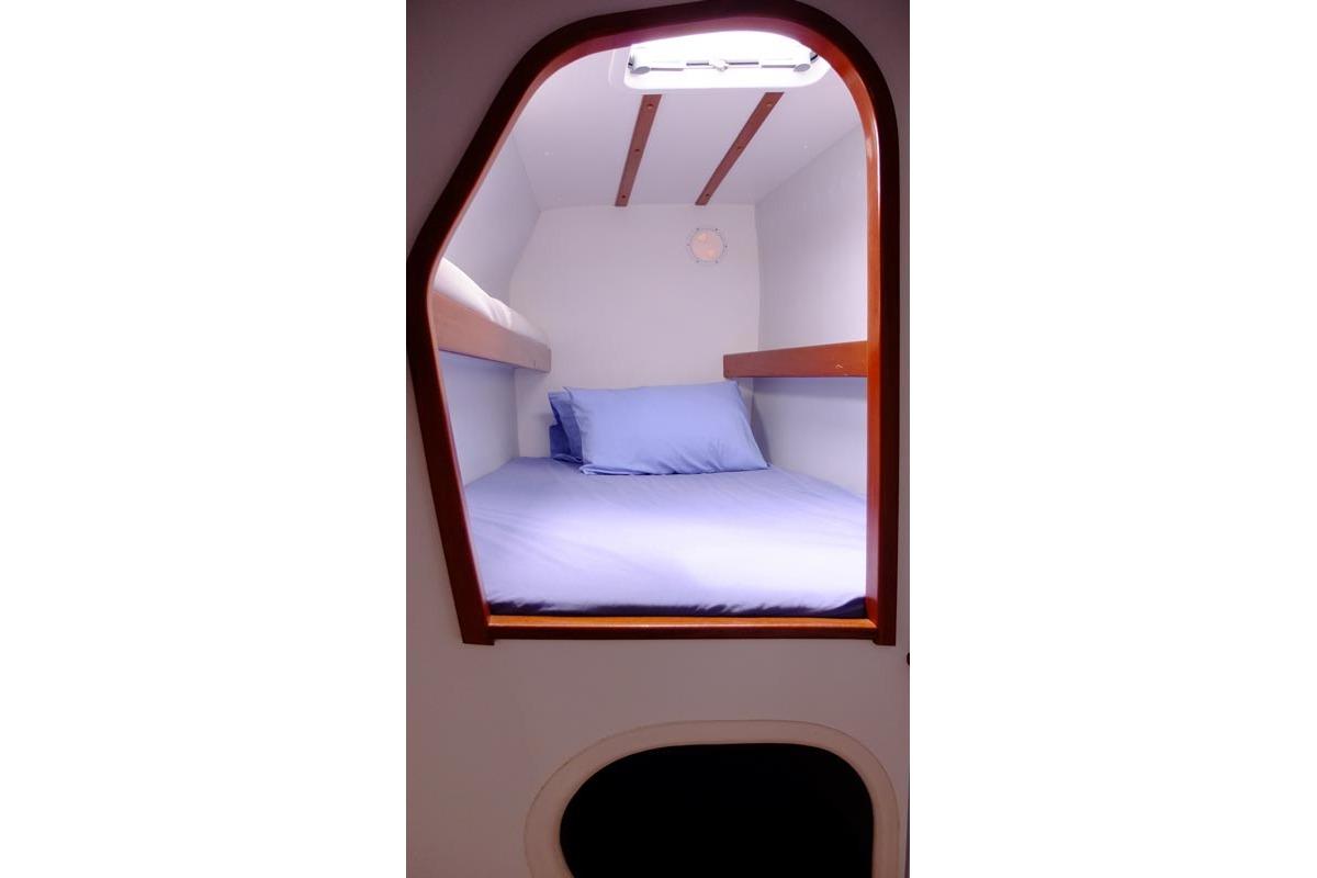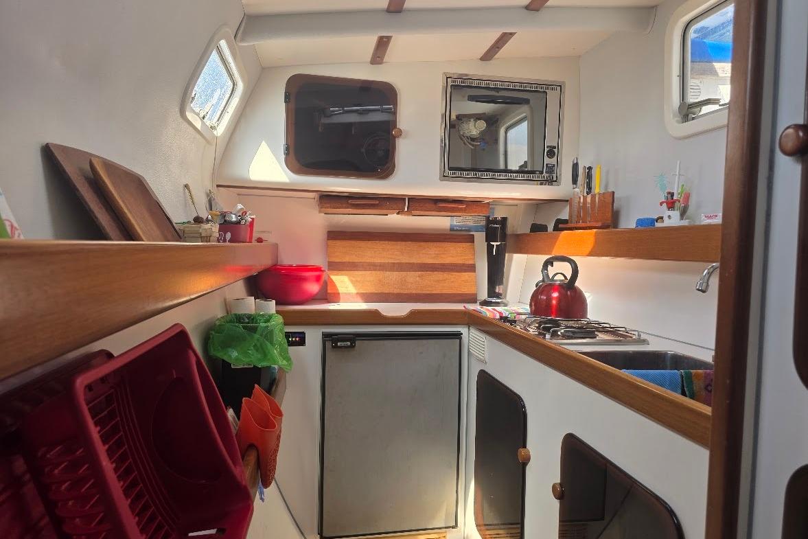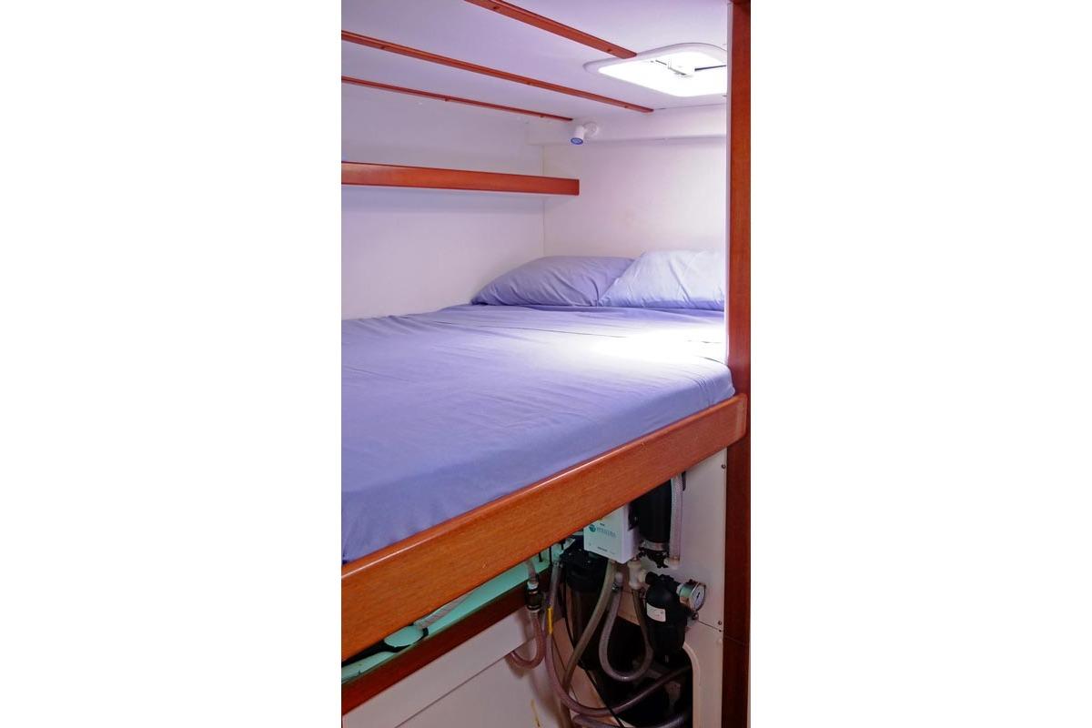 The cockpit is well-protected for safe sailing in open water and comfort at anchor. The salon and nav station occupy the light, airy main living area. The u-shaped settee has overstuffed cushions and large dining table for entertaining. She has a unique layout with a huge galley down in the aft starboard cabin. An ample double stainless steel sink keeps things tidy. Any chef will admire the privacy, the amount of counter space for prep work and the storage arrangement. There is a twin bunk midships and a single cabin forward. The port side is the owner's space and includes a fresh water, electric head.