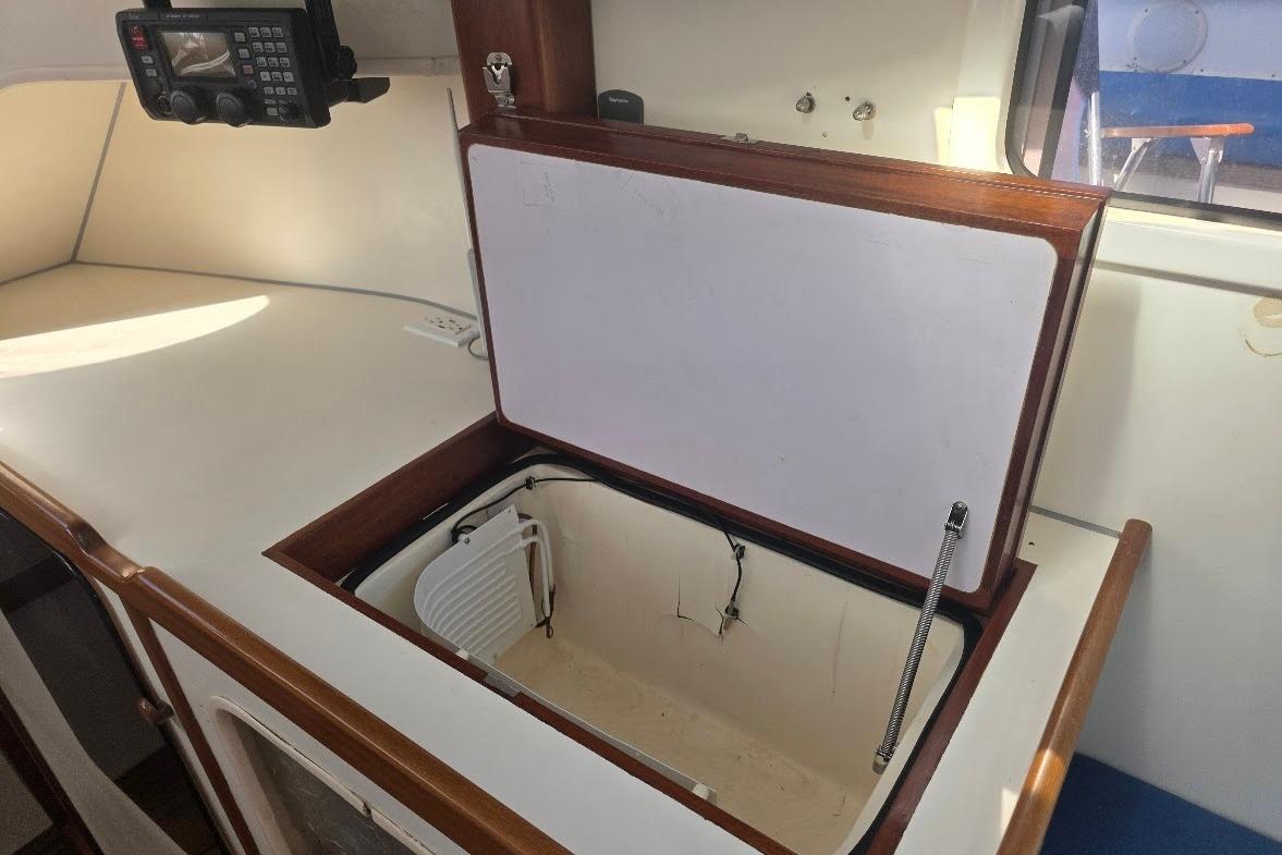 In the cocpit we built a locker for an Engle drinks cooler which will freeze if needed, turn wet lockers in to dry and fitted a teak grate in front of companionway . The chain locker was made bigger to accept the 180 feet of chain . The hatch over what we call our bunk was increased in size (2020).