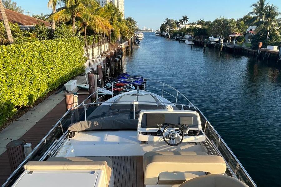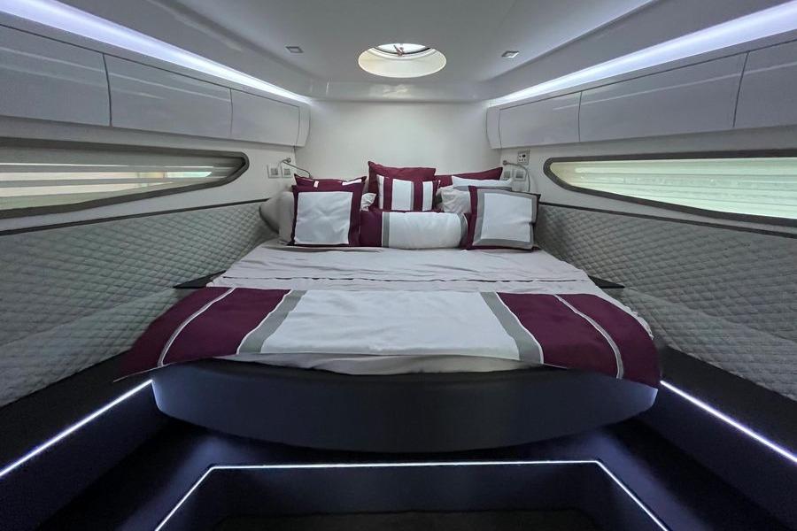 Technology and entertainment are fully integrated through Raymarine’s advanced network. Radar, fishfinder, and FLIR night-vision display on any screen, while security cameras monitor the engine room and swim platform for peace of mind. Connectivity is unmatched with Starlink satellite Wi-Fi and TV, and the Fusion multi-zone stereo system ensures your soundtrack is always ready, day or night.