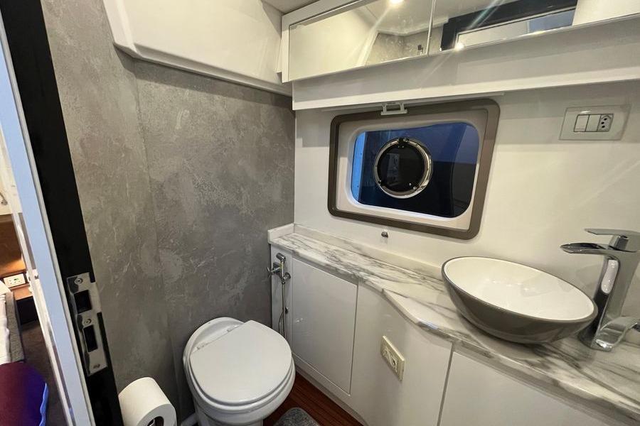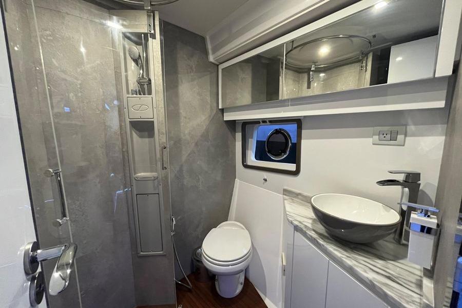 Below deck, the yacht offers three double staterooms, each with its own private head, plus a separate crew cabin for discreet service. Comfort is assured with five A/C-heaters and four electric heads, while the lower salon easily converts to additional berths when extra guests come aboard.