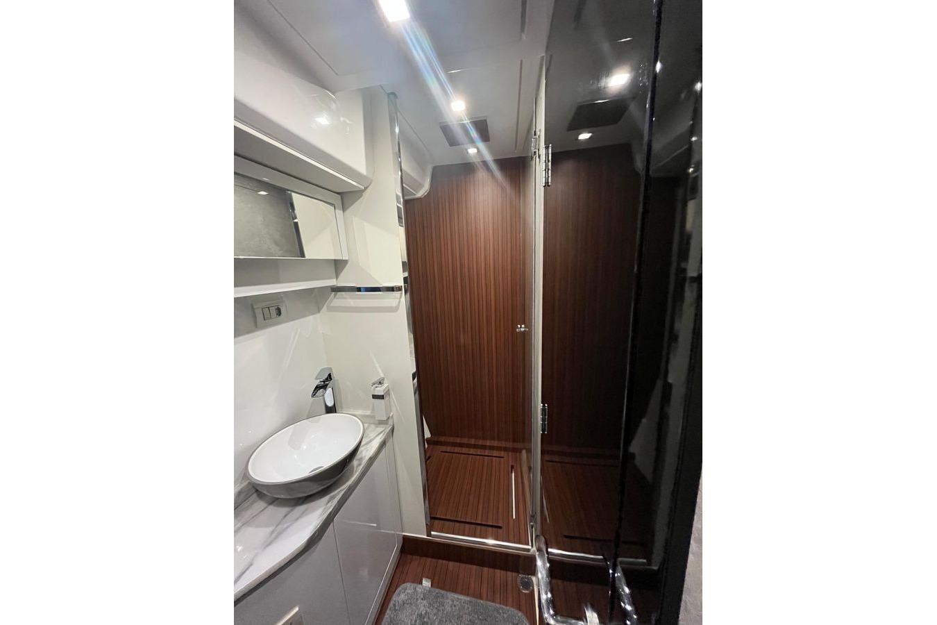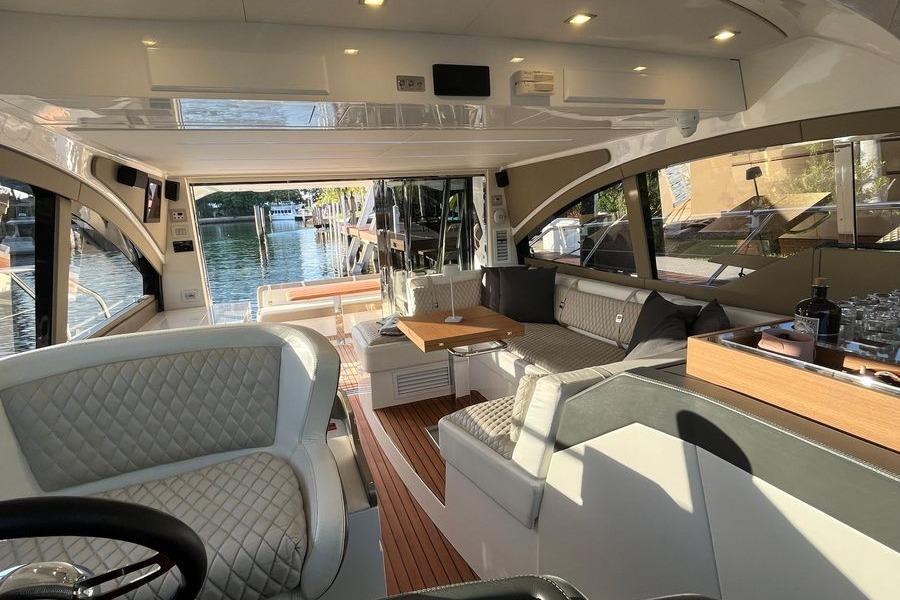 On deck, versatility is the theme. The cockpit seats eight around a dining table, perfect for gatherings. Hydraulic panels expand the swim platform or lower you into the water, creating a seamless transition from entertaining to adventure. And don't forget the Cockpit fold out extension to add more entertaining space,