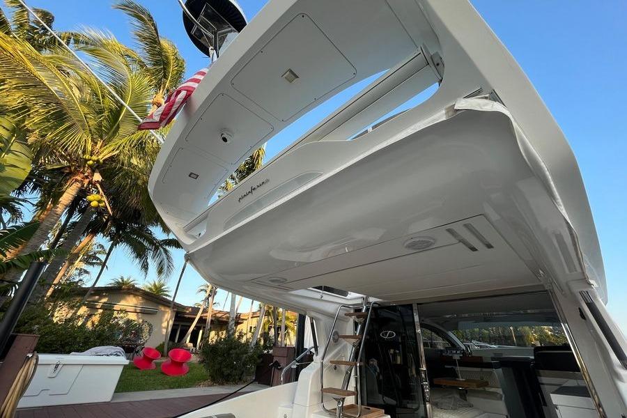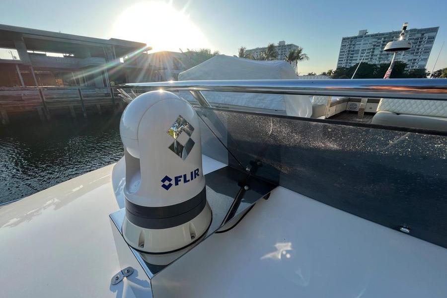 For night operations, the Flir M300 stabilized night vision camera with 30X zoom integrates seamlessly with any Raymarine display, providing clear visuals for navigation, photography, or video recording. Entertainment is elevated with a Fusion 3-zone stereo system, Starlink satellite Wi-Fi and TV, four TVs, underwater lights, and a flybridge Bimini.