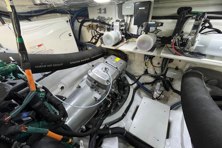 This yacht is the perfect blend of performance, comfort, and innovation—easy to handle for both cruising adventures and entertaining guests. Designed with a 3 double stateroom layout plus a separate crew cabin, each with its own head, the vessel offers exceptional privacy and convenience. Outfitted with 4 electric toilets, low-hour Volvo IPS 700 pod drives with joystick docking, and a Cummins generator, she delivers effortless maneuverability and reliable power.