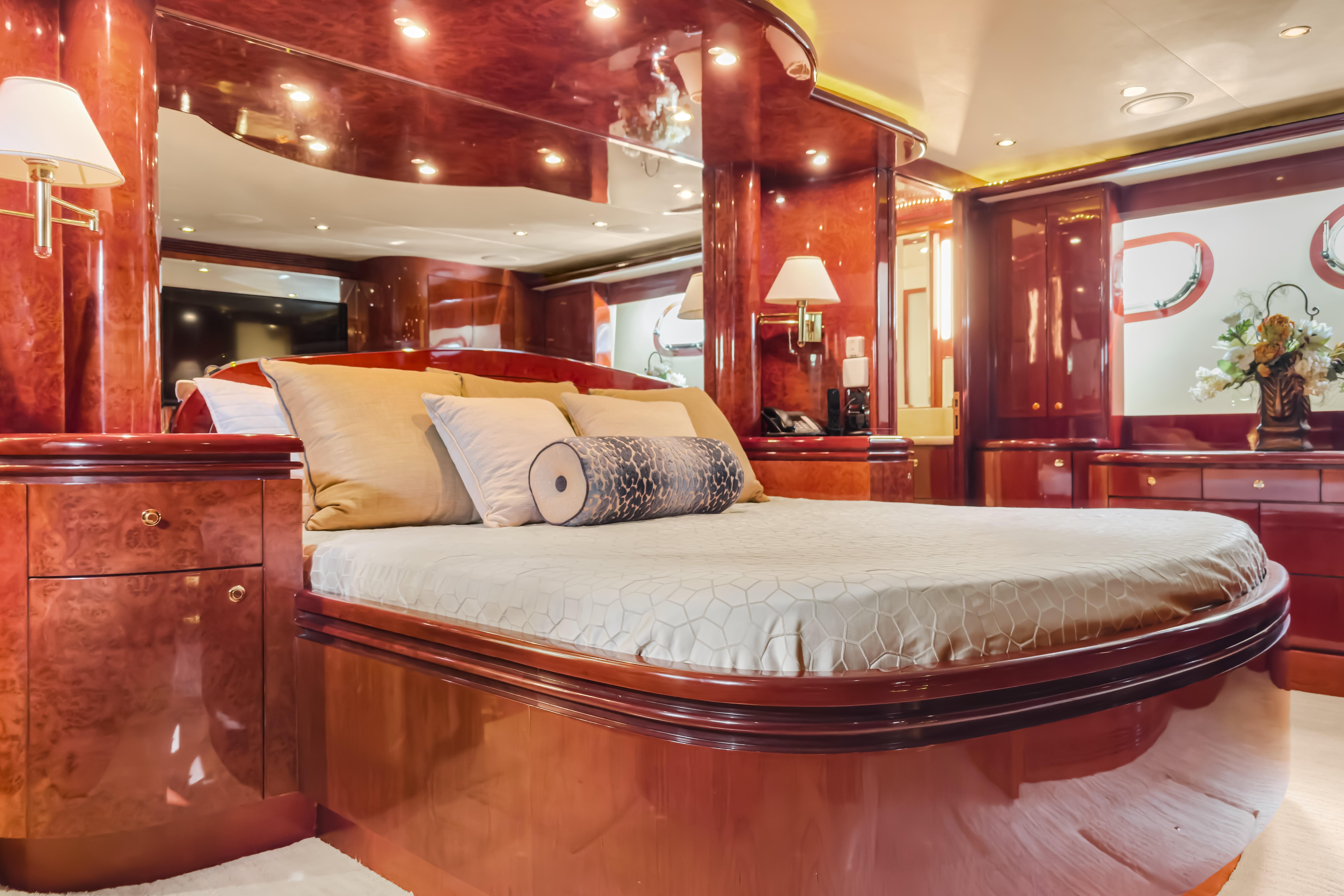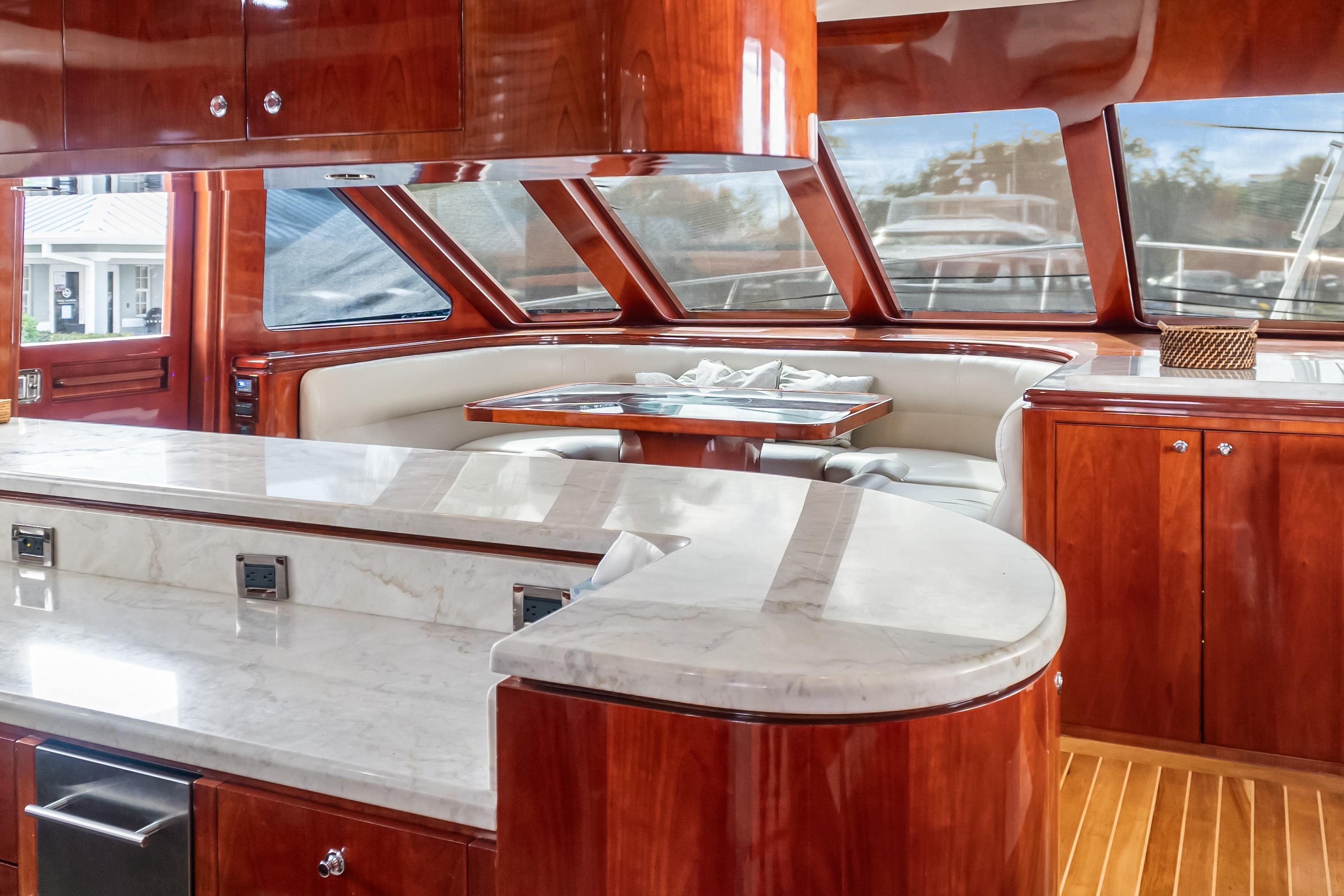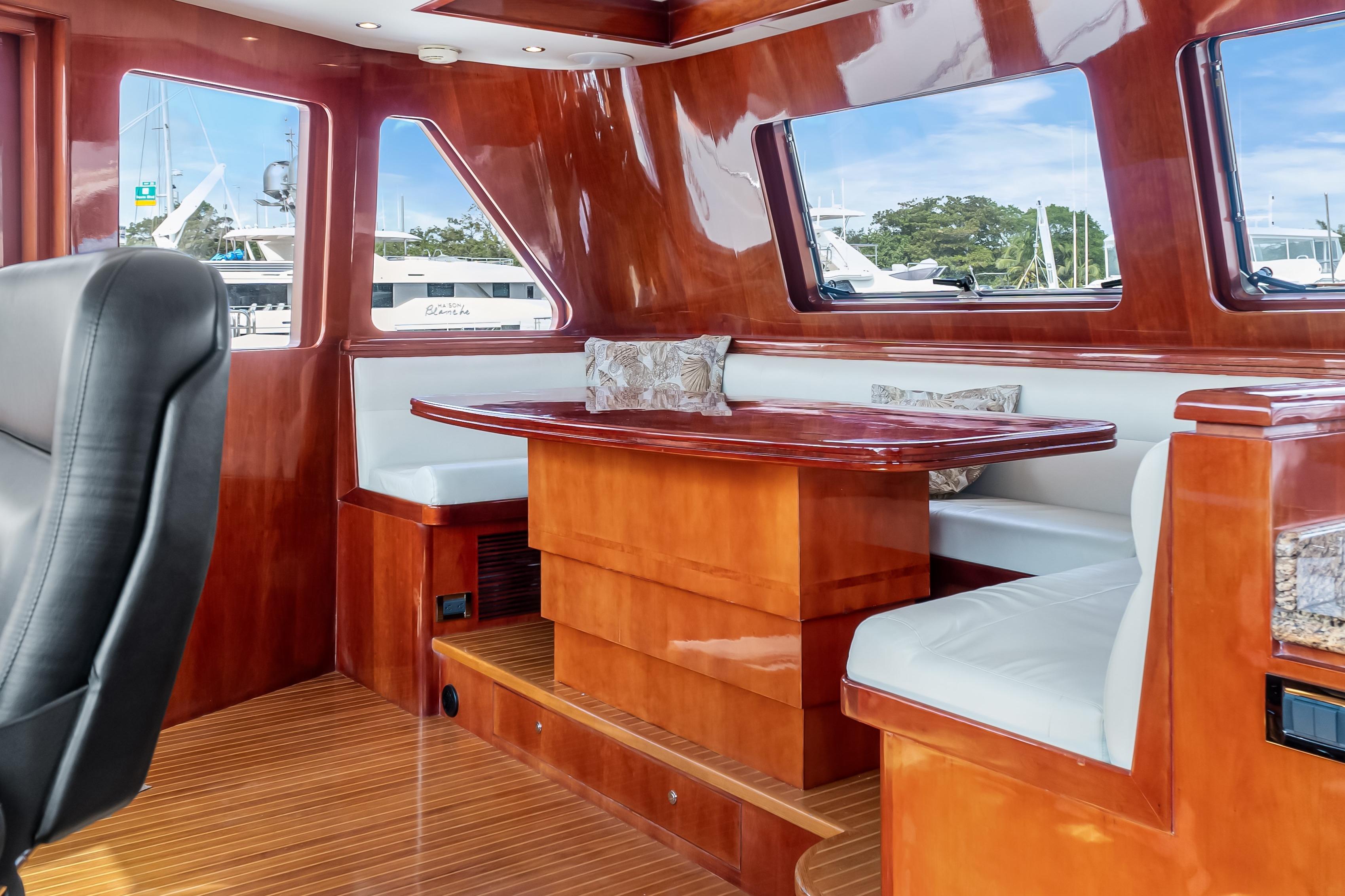 This yacht boasts a spacious main salon and dining area, remarkable for her size class. The custom cherry woodwork, a $500,000 upgrade, remains in impeccable condition, radiating timeless elegance. A significant interior refit by Yacht Interiors by Shelley enhanced her with all-new soft goods, carpeting, galley appliances, and granite countertops. During this upgrade, key systems were modernized, including a new toilet system, updated navigation equipment, compressors, air handlers, larger TVs, electric blinds, and surround sound, ensuring a luxurious onboard experience.
