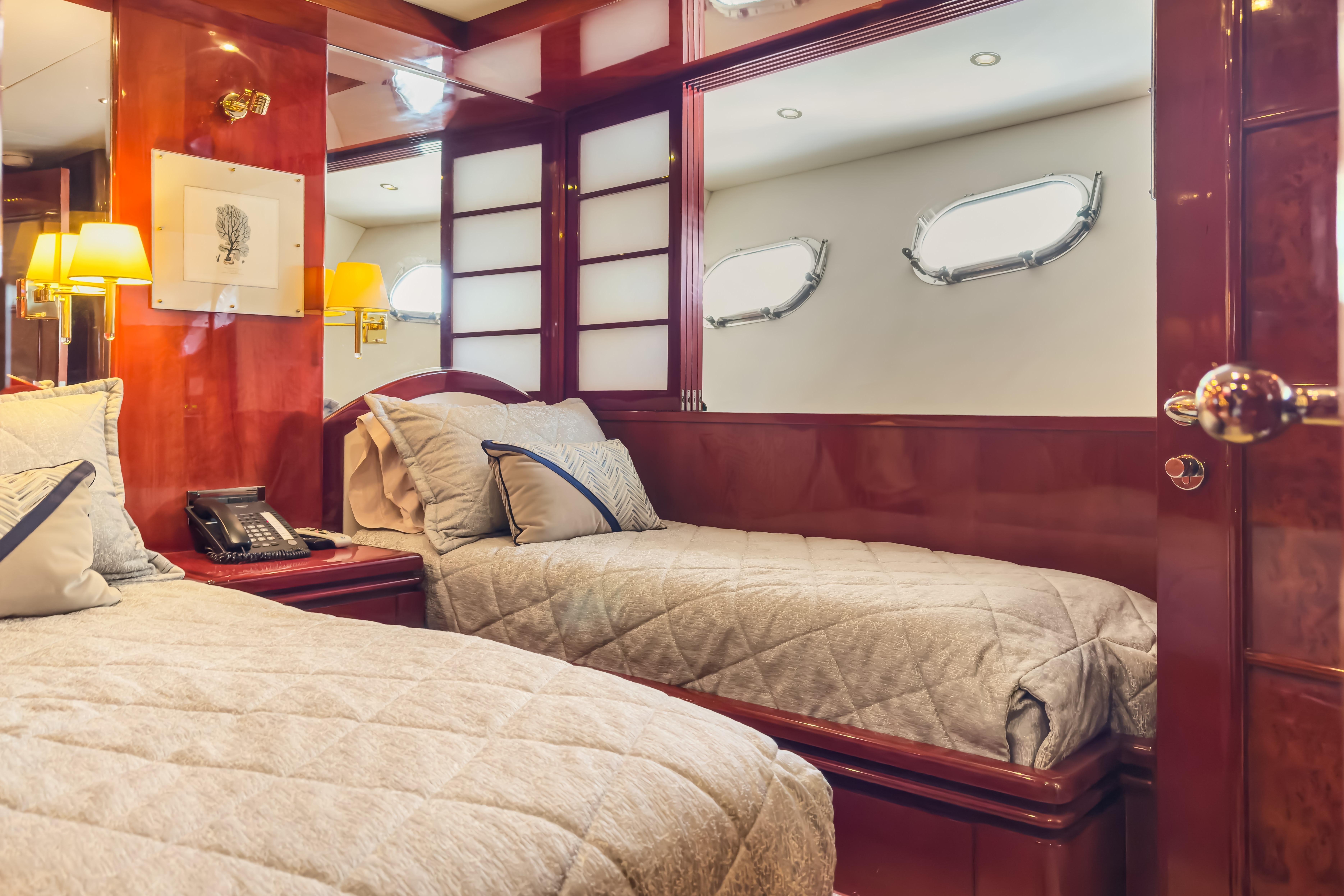 Below deck, JusMad accommodates up to six guests in three beautifully appointed staterooms. The full-beam master suite features a king-size bed and an expansive ensuite with his-and-hers heads. The VIP stateroom offers a queen-size bed, while the third cabin provides twin beds—both with private ensuites. Adding to her sophistication, the onboard art collection includes a vase by renowned glass artist Dale Chihuly.
