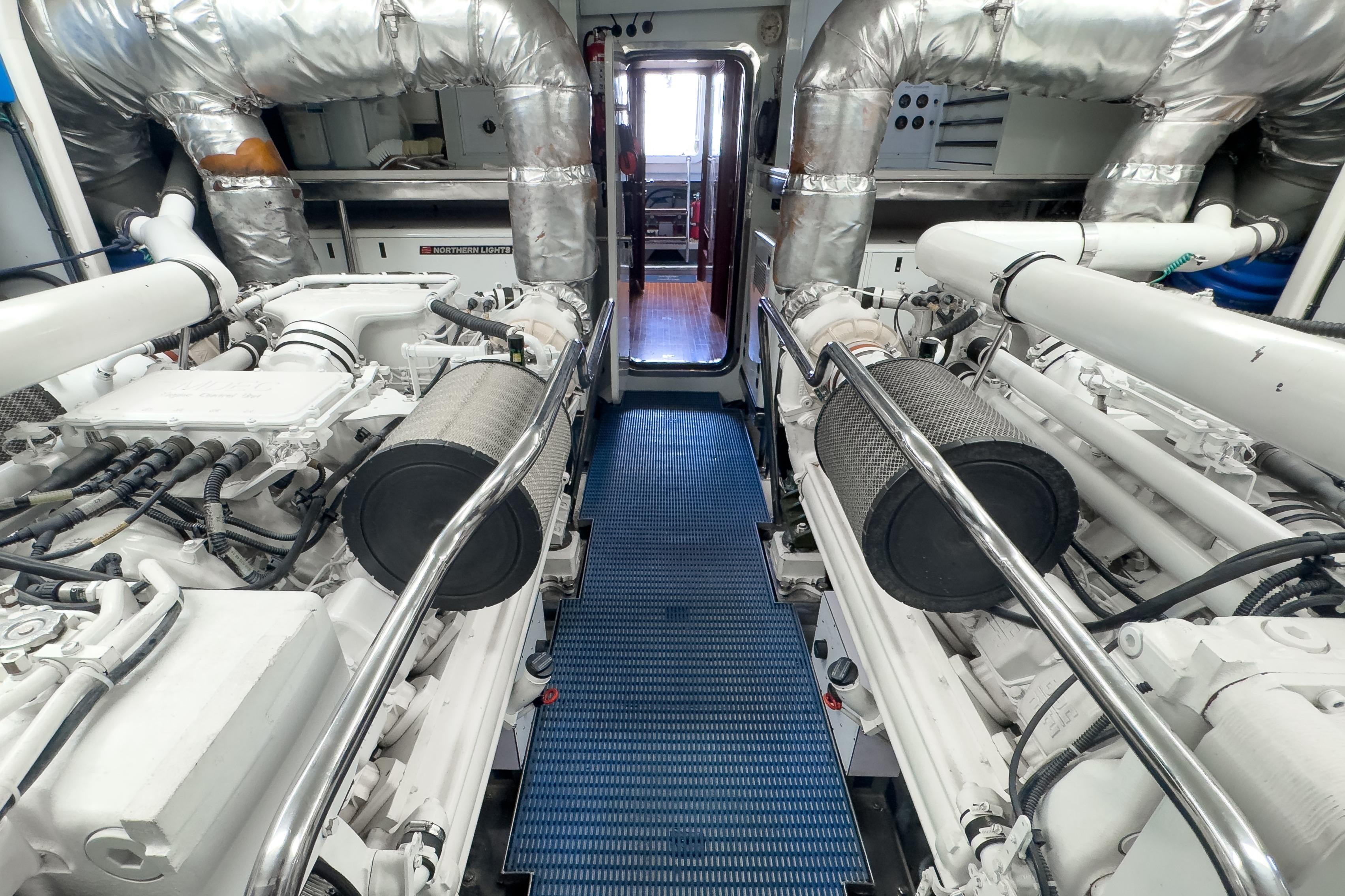 Meticulously maintained by a professional crew, JusMad is in exceptional condition. Her engine room is pristine, housing twin 1,500hp MTU engines that deliver ample power for swift travel while offering the flexibility of an economical cruising speed.