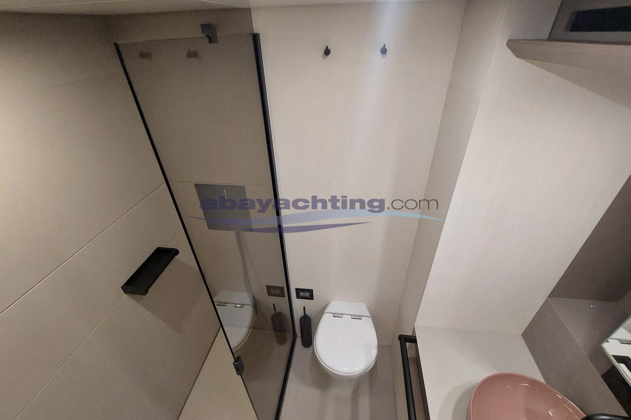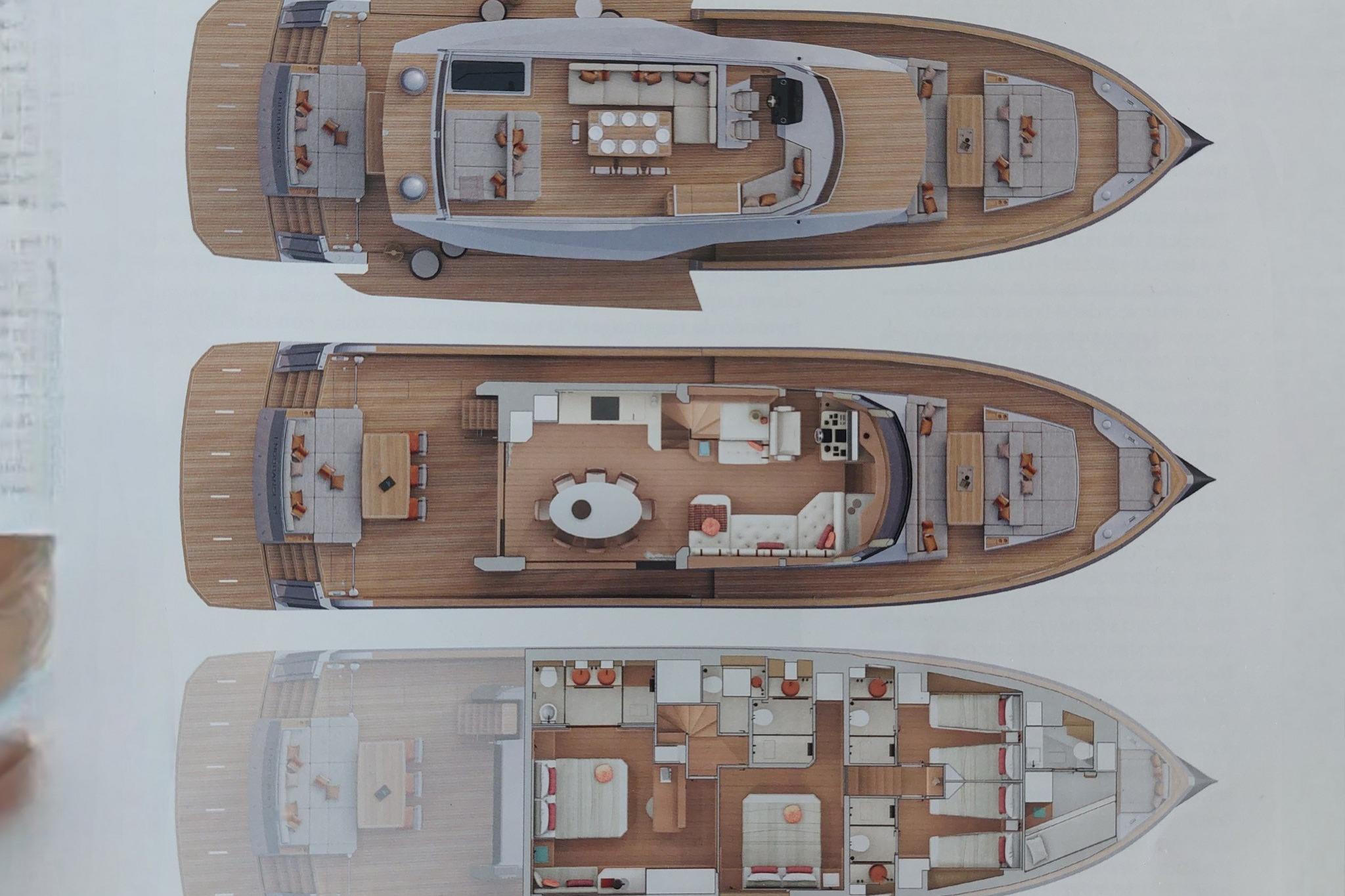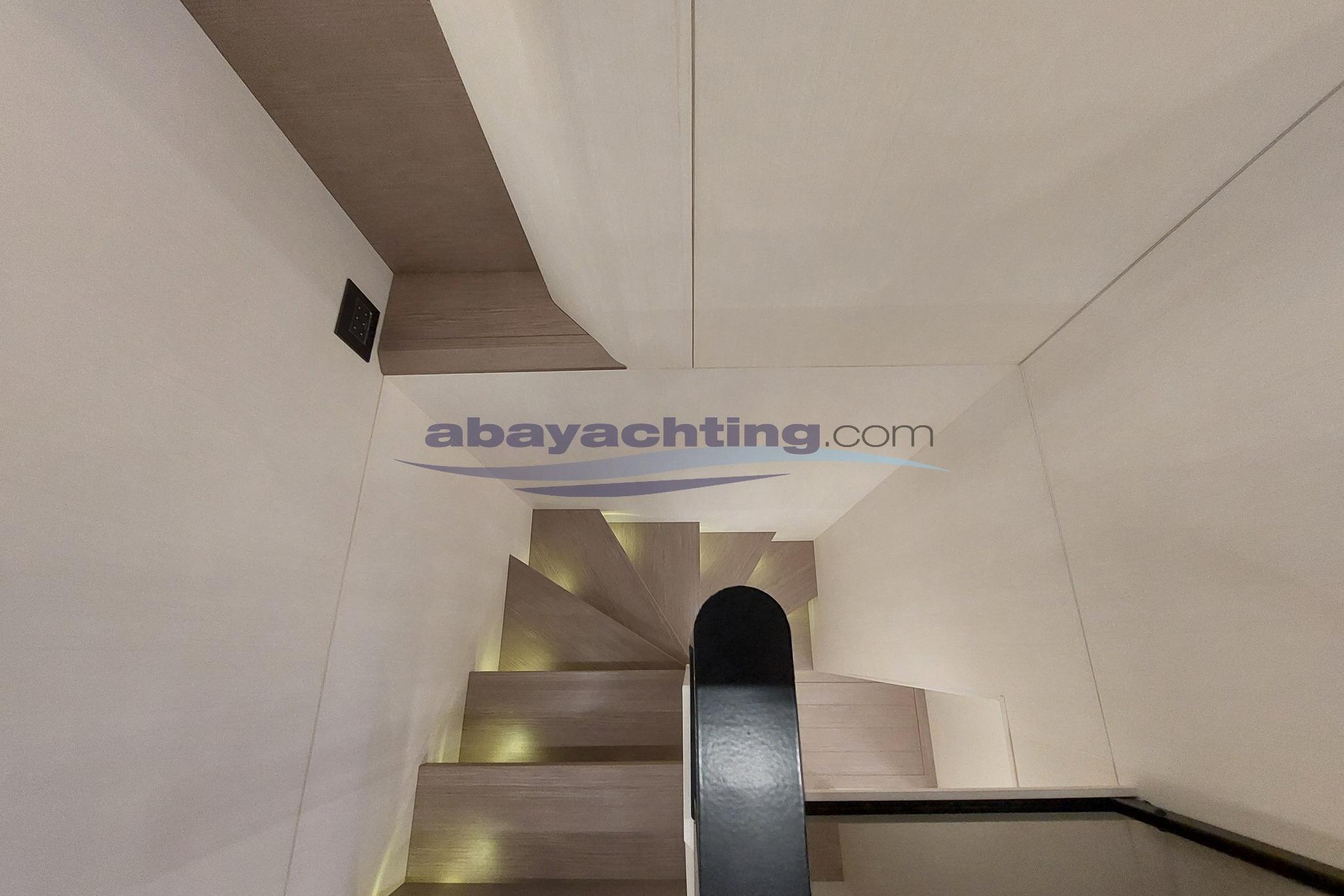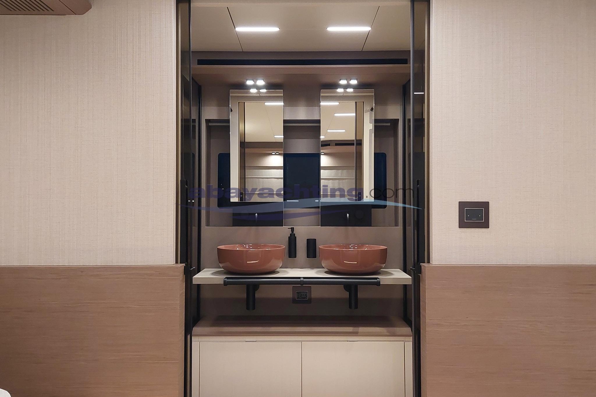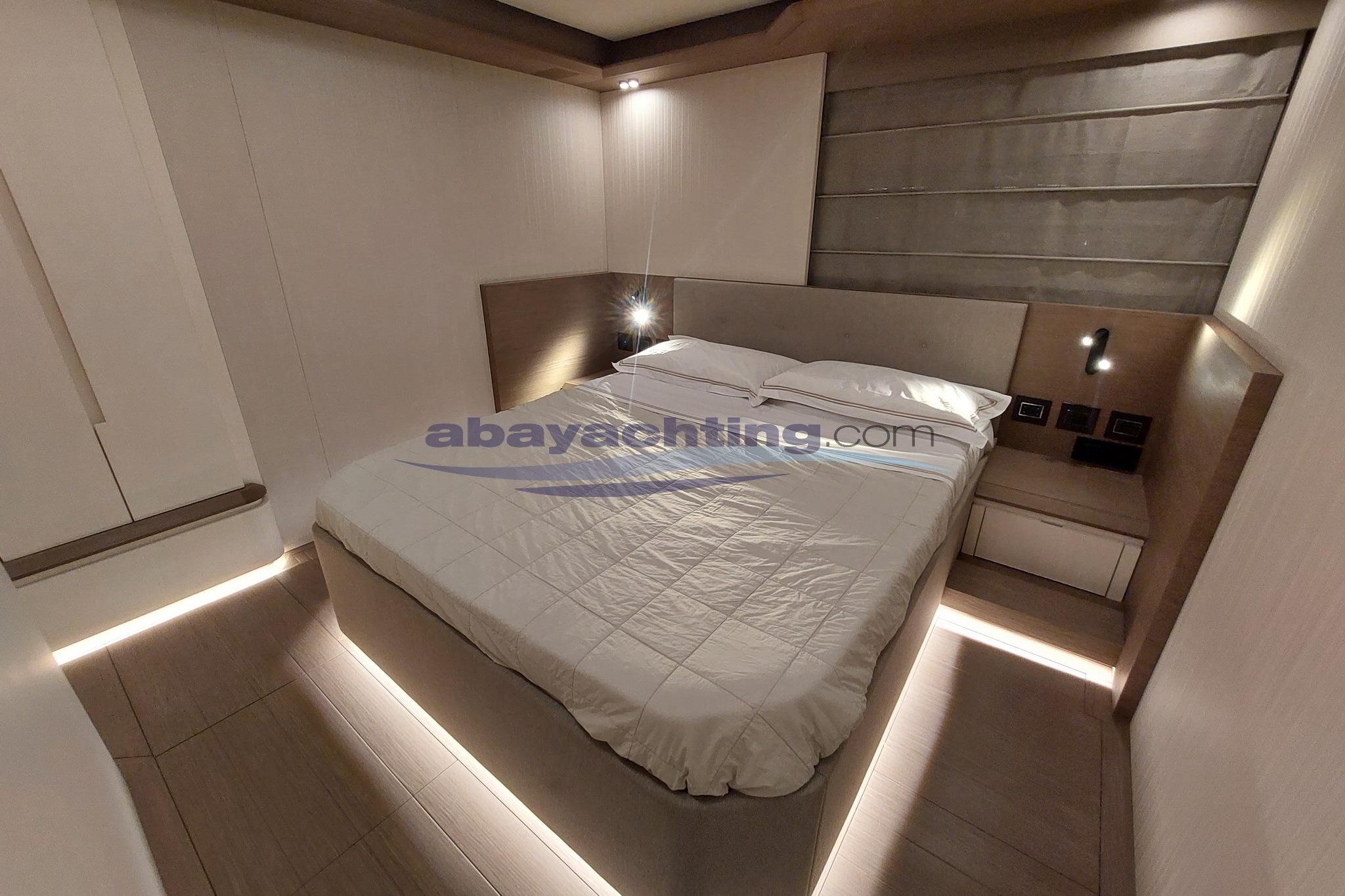 Layout come segue: 4 cabine + 5 bagni (cabina armatoriale a poppa con bagno privato, cabina VIP a centro barca con bagno privato, 2 cabine ospiti con letti singoli a prua con bagni privati, bagno a giorno a centro barca), cabina equipaggio a prua con accesso indipendente da prendisole