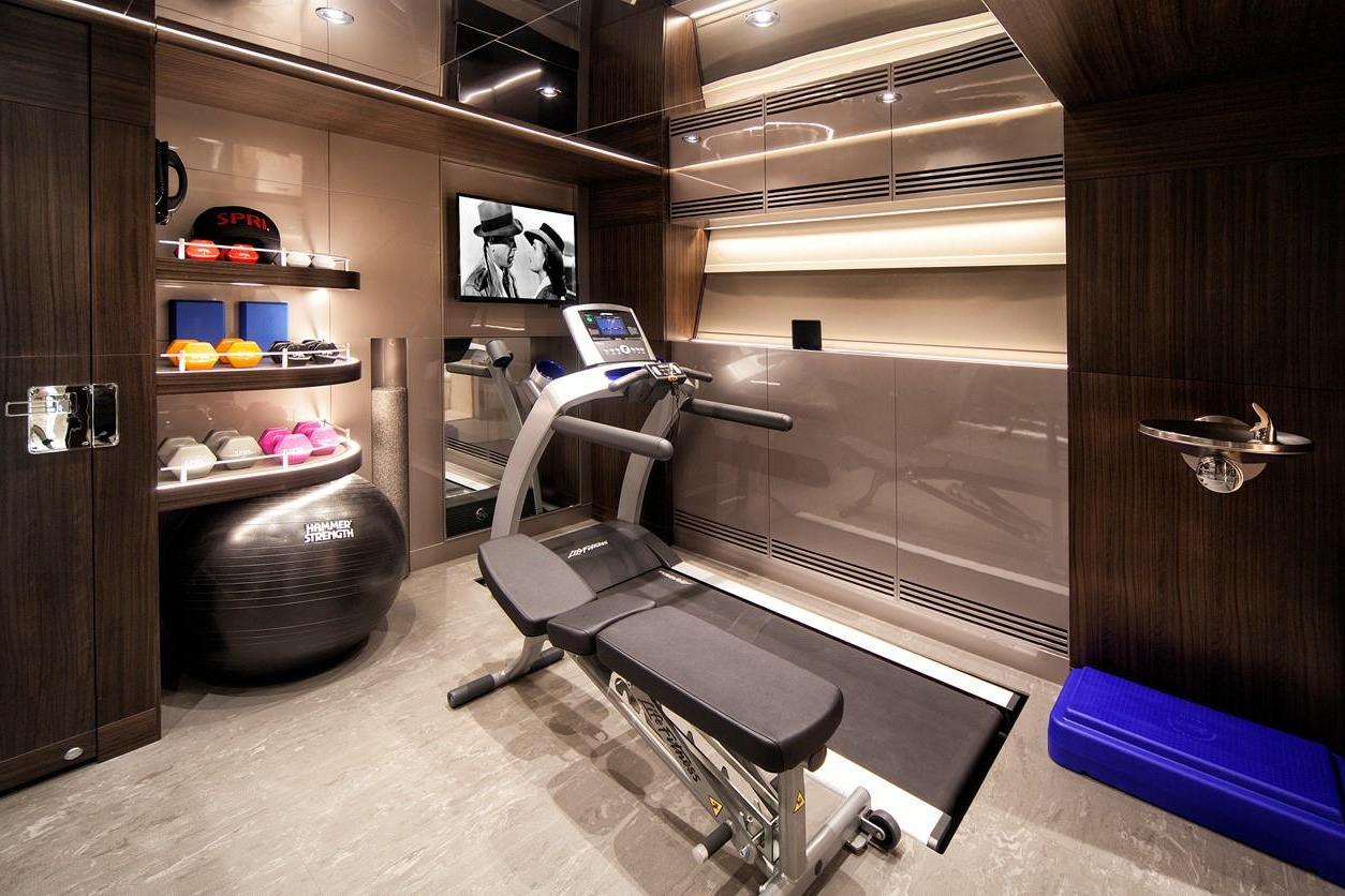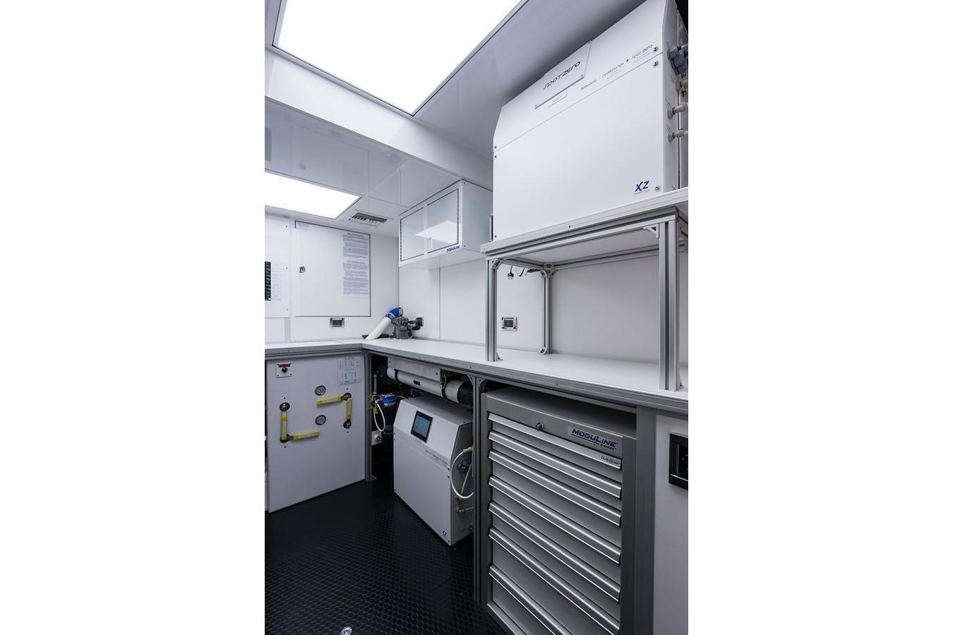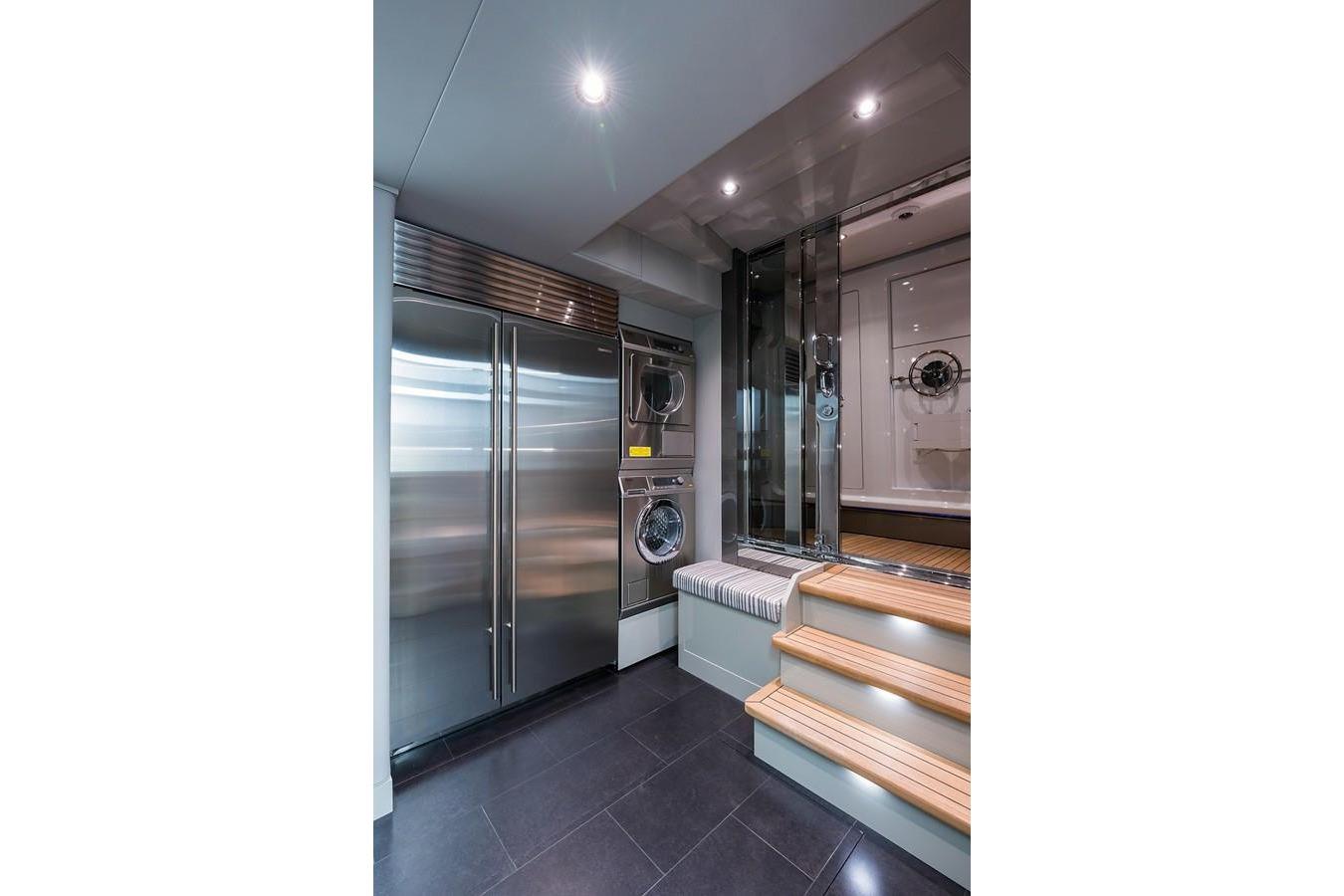 - Located off port side of Utility Room, the Equipment Room contains a work bench with sink and vise, Moduline toolbox and tool set, upper storage cabinets, watermakers and bilge pump. Watertight hatch provides access to port Lazarette storage.