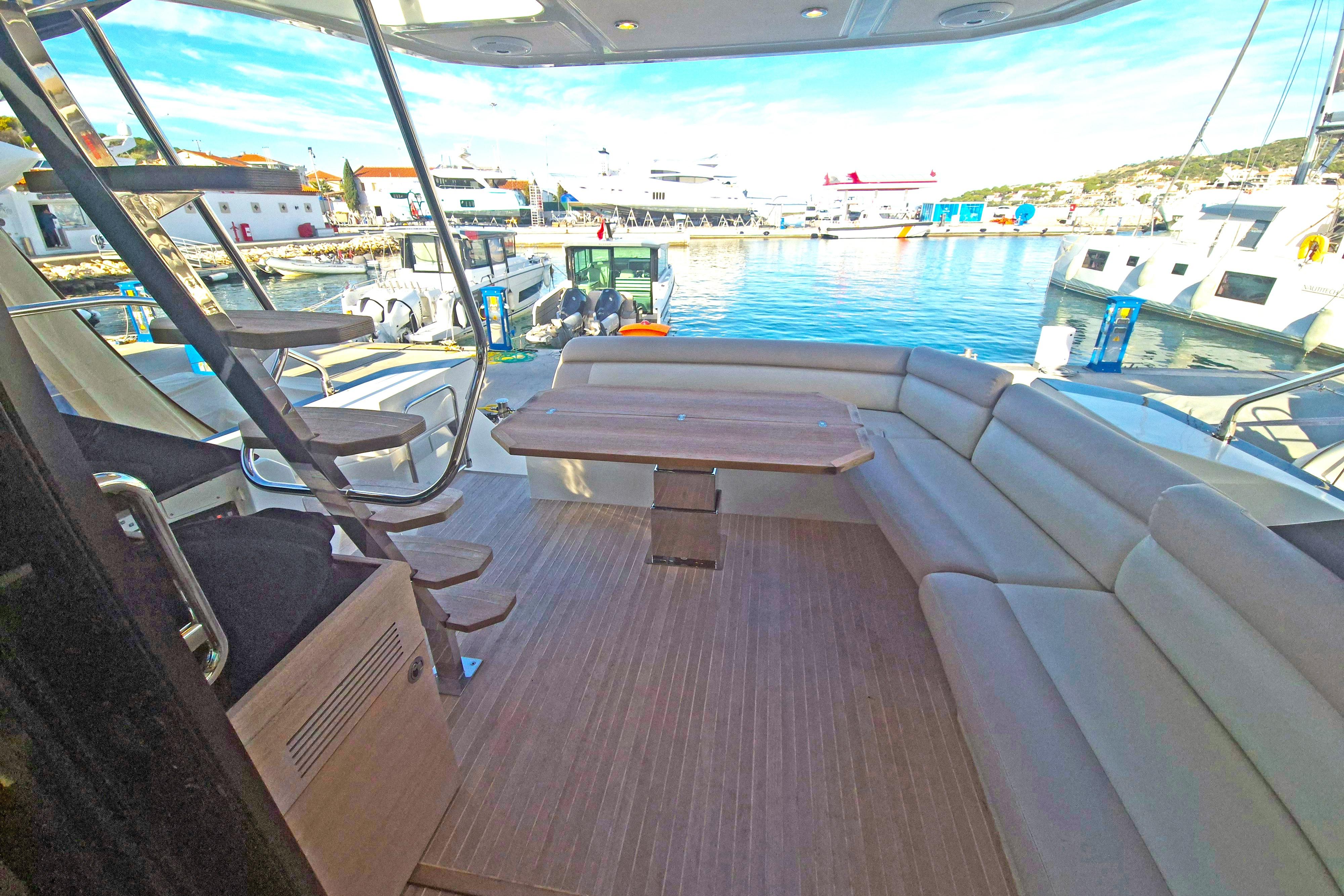 The interior layout features three cabins and two heads, including a full-beam owner’s suite with separate shower and toilet, providing privacy and comfort typically found on larger yachts. The saloon benefits from refined materials and intelligent space planning, seamlessly connected to the cockpit to create an open, fluid living area. Electrically adjustable tables in both the saloon and cockpit enhance flexibility for dining or relaxation, while the flybridge offers an additional social and helm area ideal for cruising and entertaining.