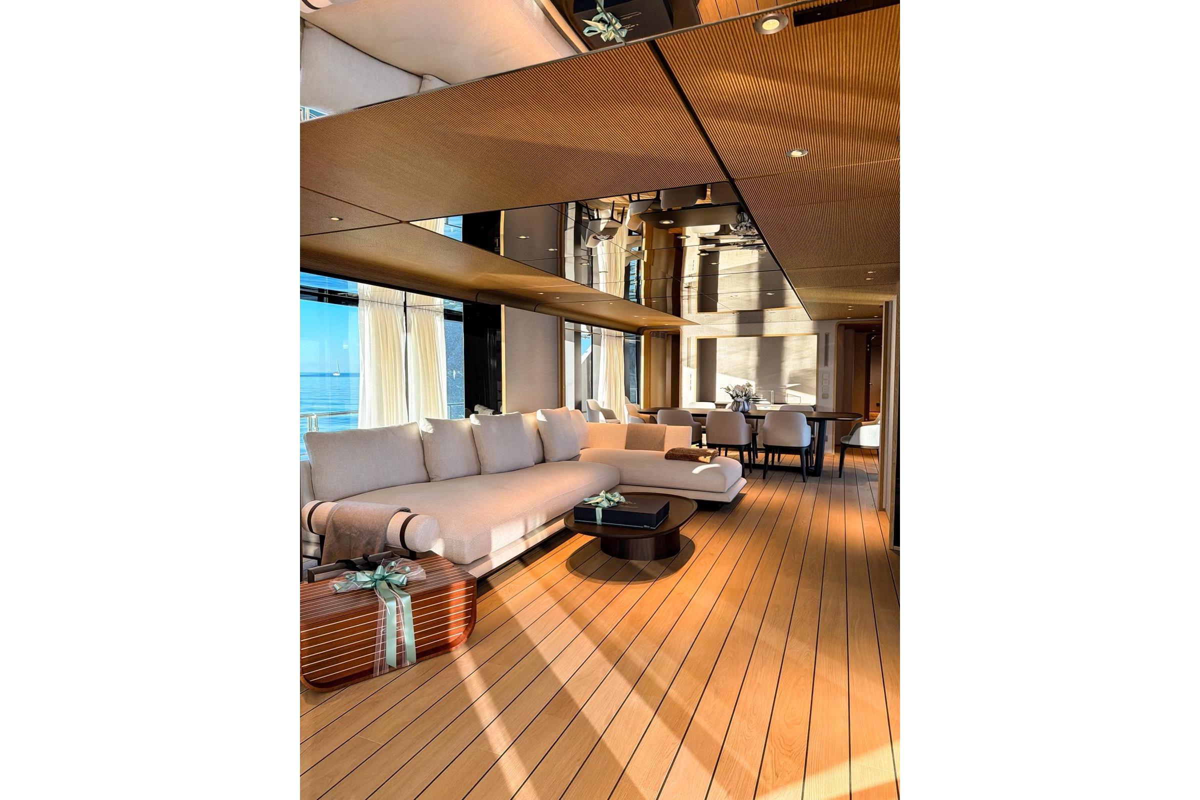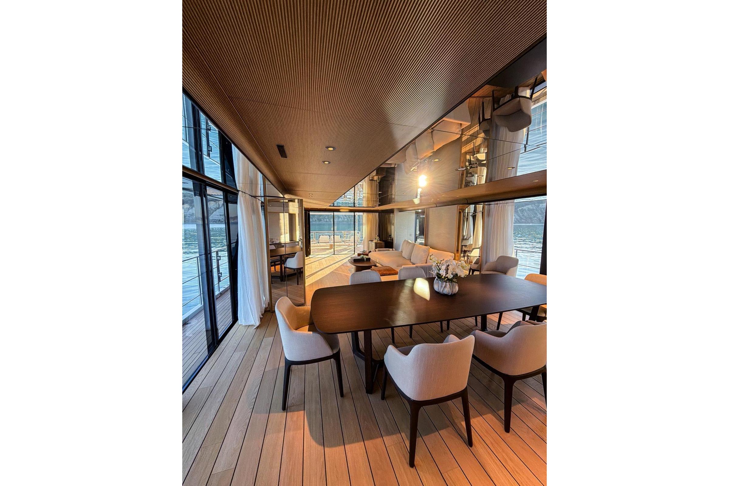 Aft on the bridge deck, the main exterior dining area sits directly outside the skylounge, protected by the overhang above and framed by glass railings. It works as a natural extension of the interior, with space for long lunches or relaxed dinners that still feel private and sheltered.