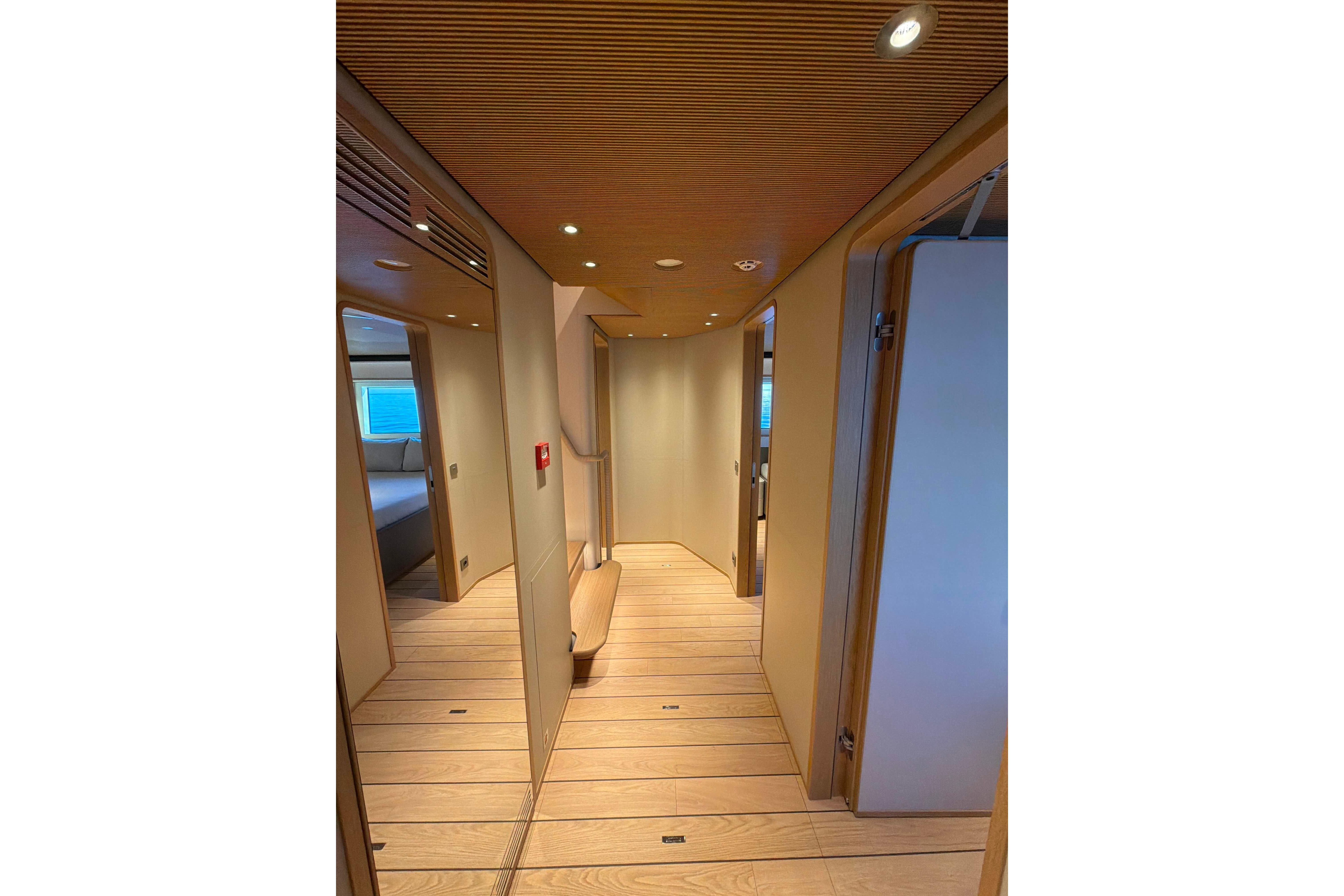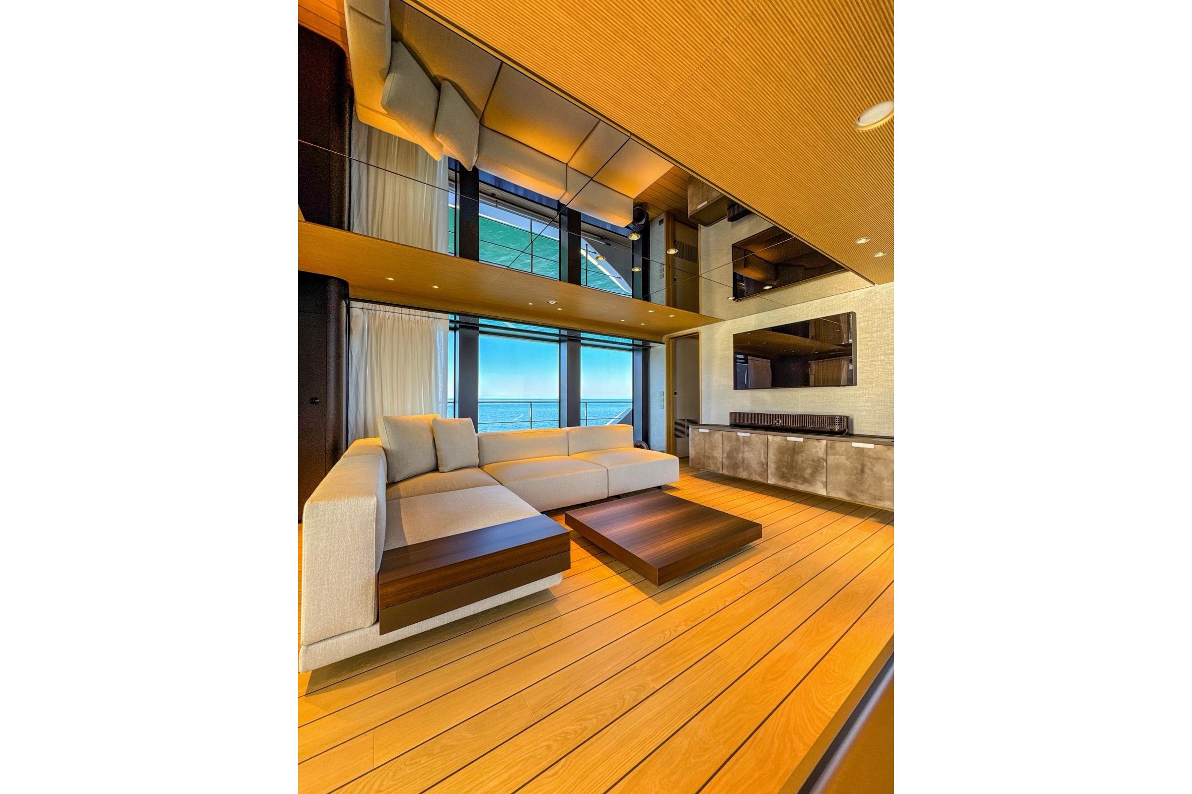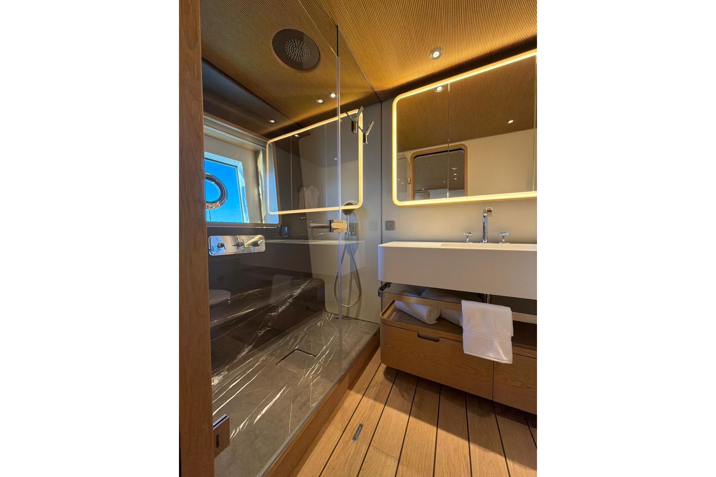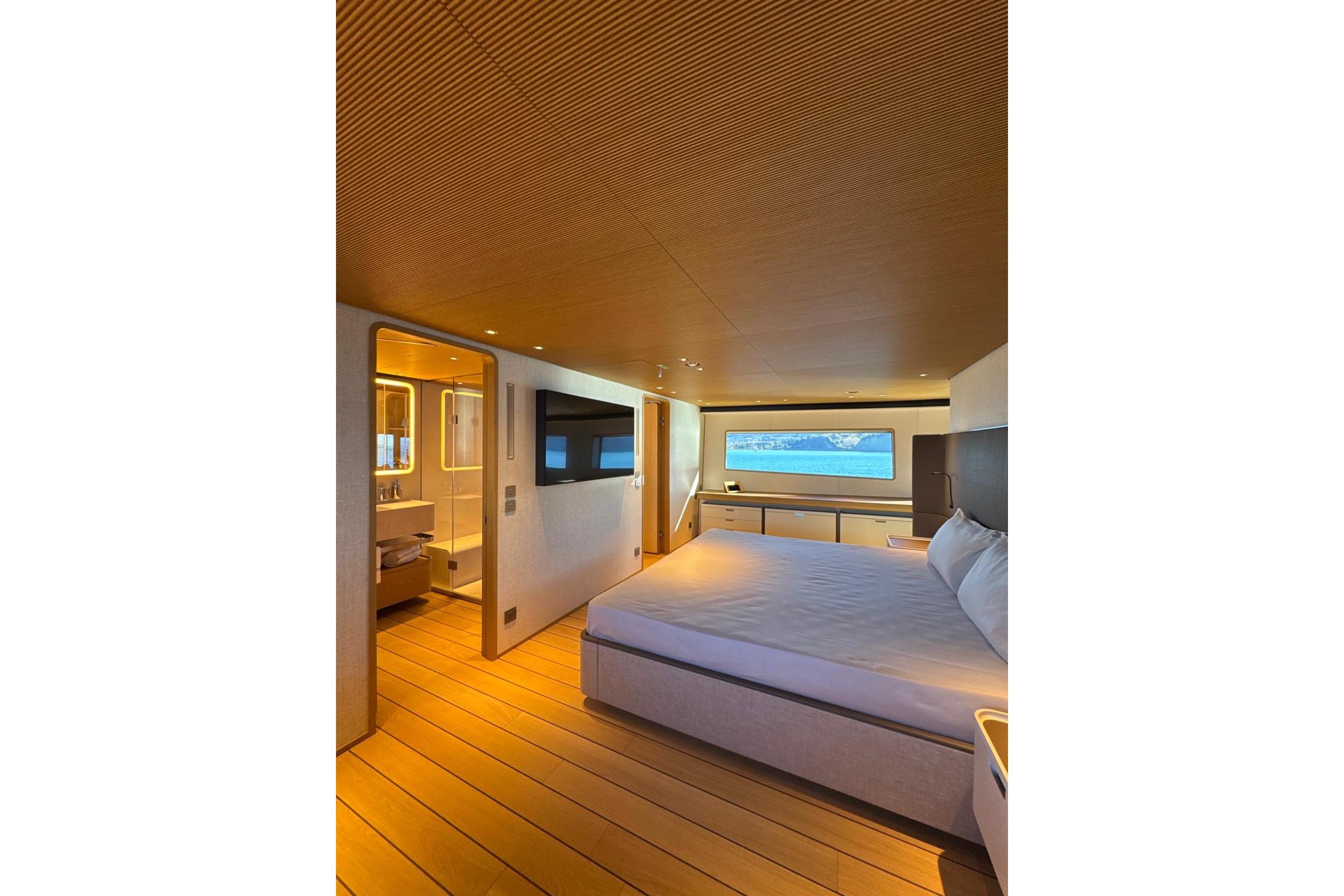 Full beam owner’s suite forward on the main deck with panoramic windows, office space, walk-in wardrobes, separate his and her en-suite.