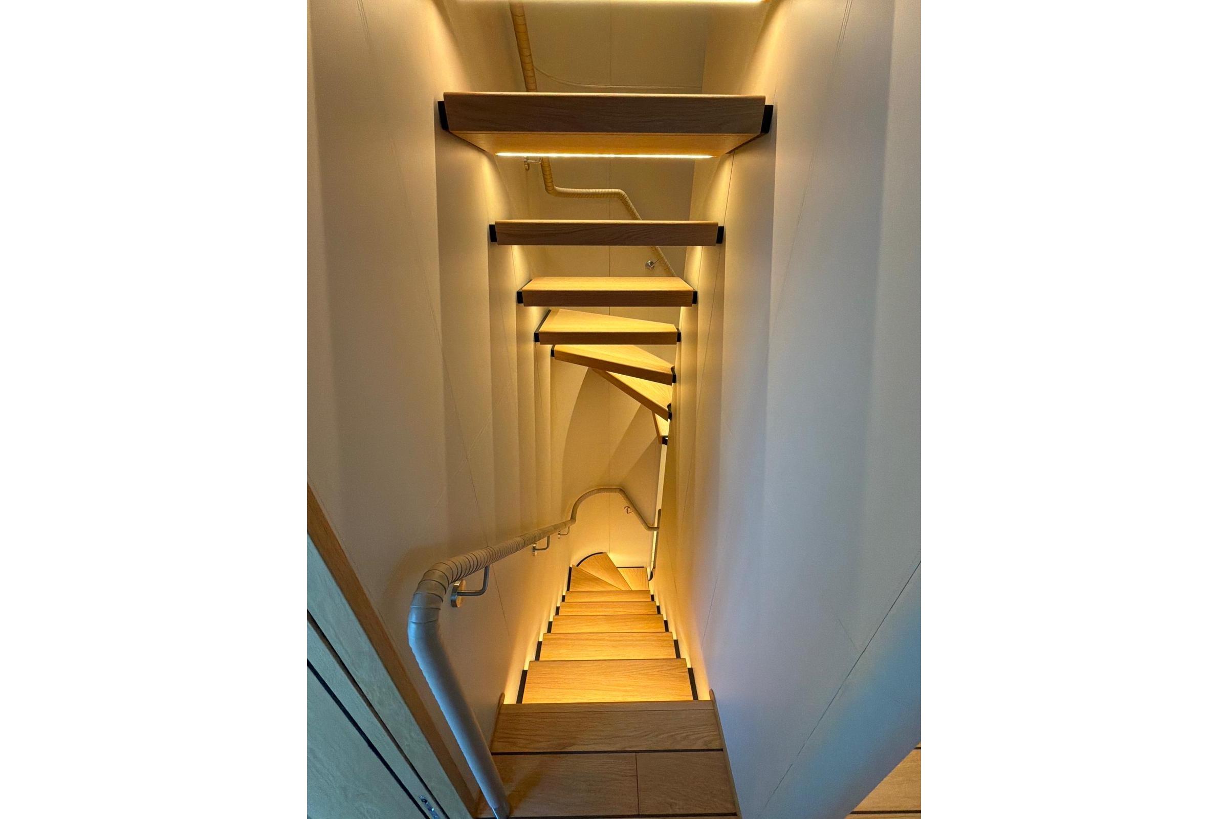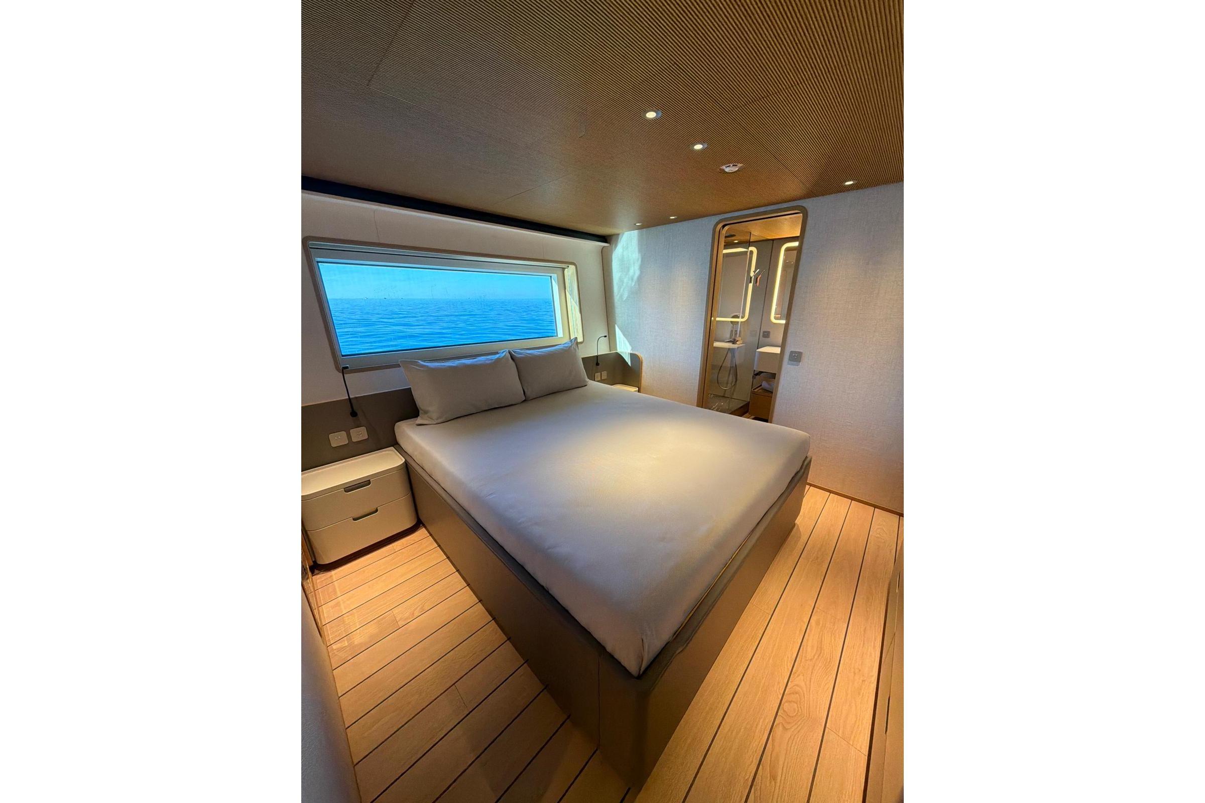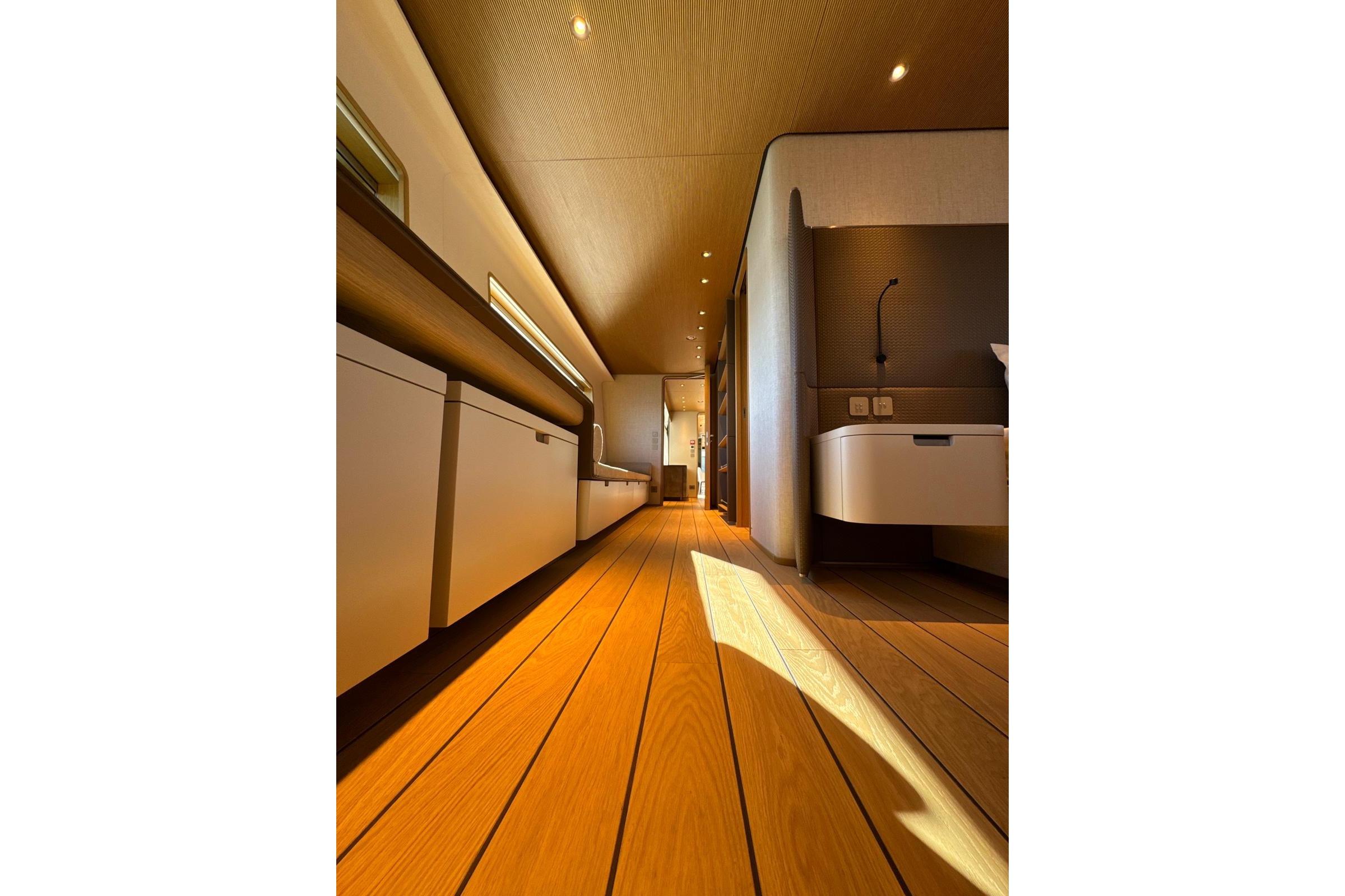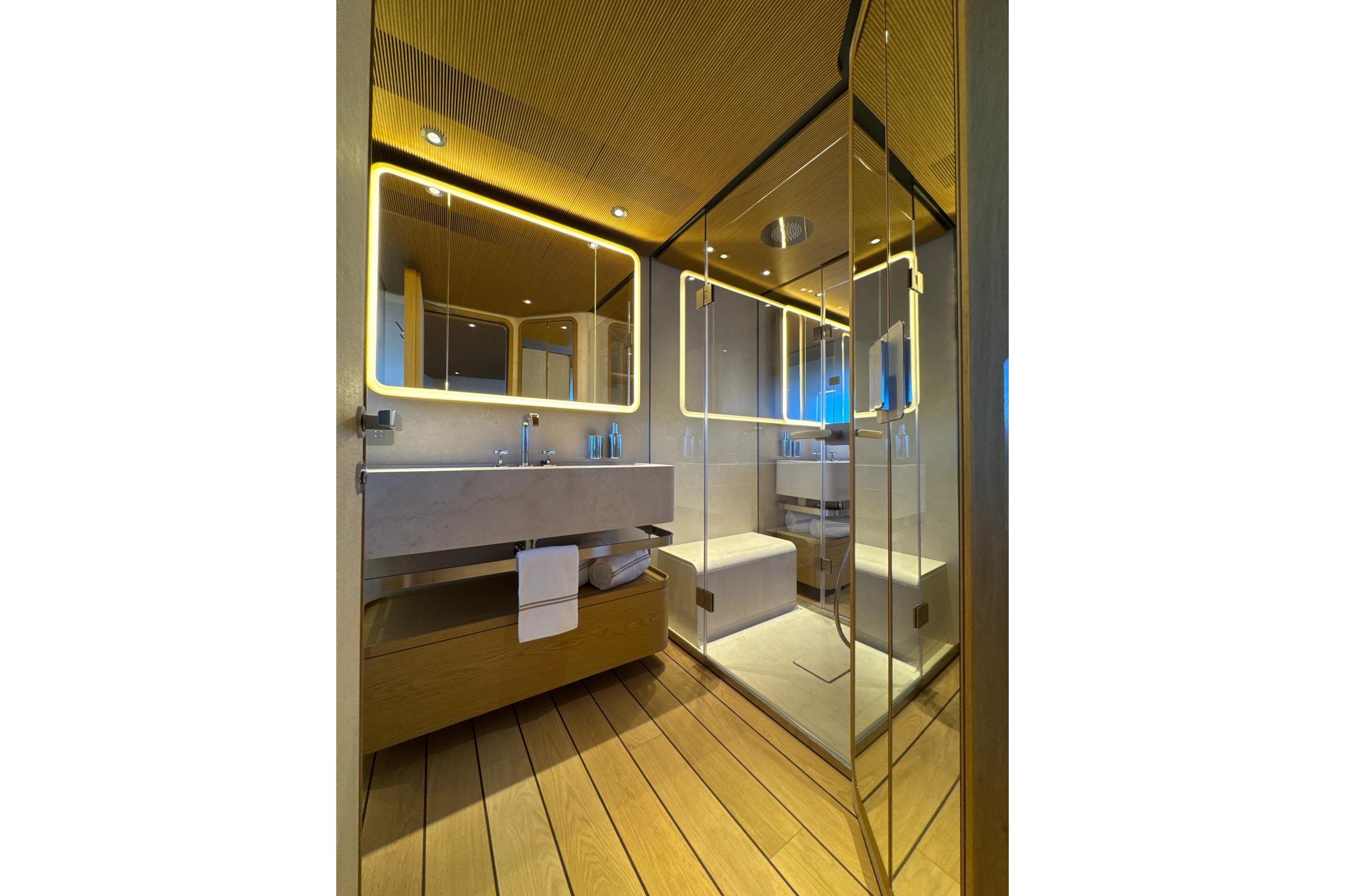 Accommodation is arranged for 10 guests in five cabins. The full-beam owner’s suite is positioned forward on the main deck and features panoramic windows, a dedicated office space, two walk-in wardrobes and separate his-and-hers en-suite bathrooms. Four guest cabins are located on the lower deck, comprising two VIP suites, one double and one twin, all with en-suite facilities. Crew accommodation is laid out for seven across four cabins, including a captain’s cabin on the upper deck, ensuring smooth service without encroaching on guest areas.